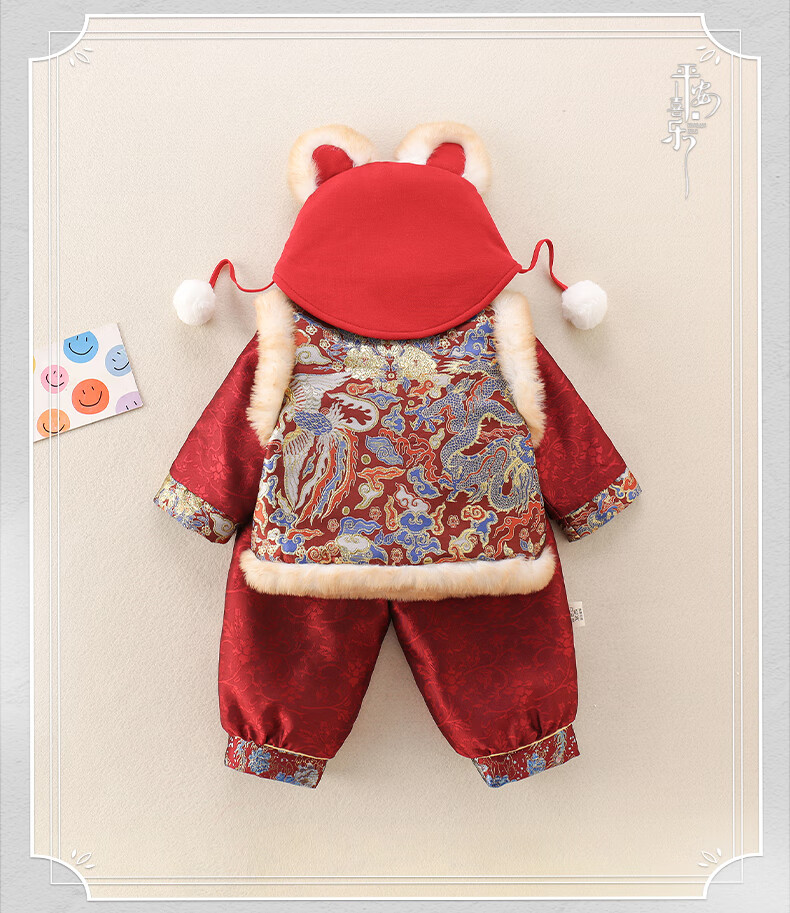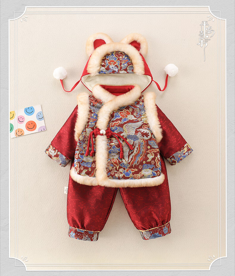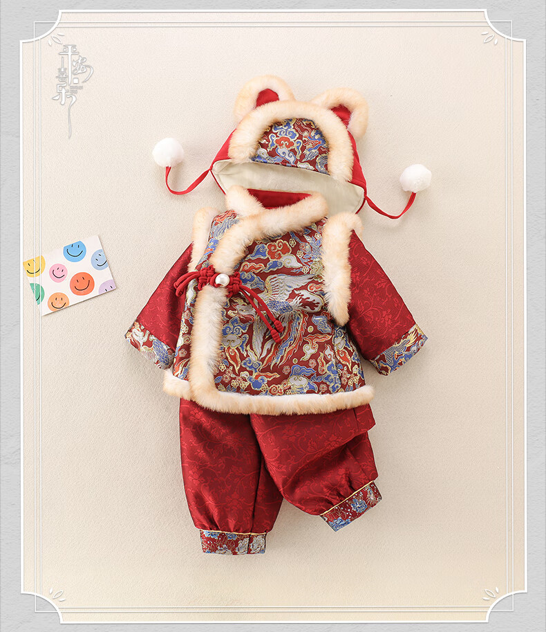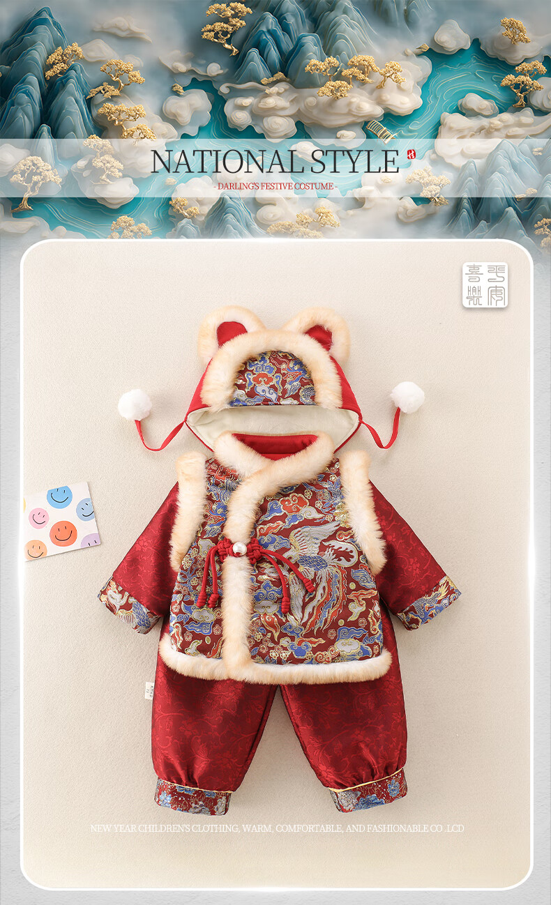 HAL.DUCK baby clothes, winter clothes, velvet quilted Hanfu suit, one-year-old dress, Tang suit, 100-day baby brother and sister outfit, New Year's greeting suit KMKD-369 hooded three-piece set (velvet quilted), red, upper 73 cm