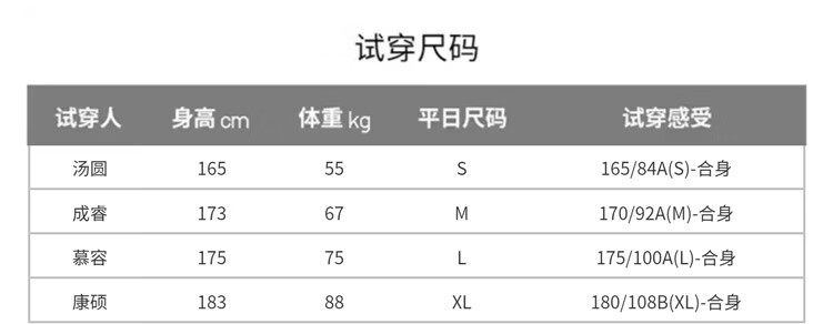China (cm) 160-165/84-86 165-170 / 88-90 167-172 / 92-96 168-173 / 98-102 170-176 / 106-110