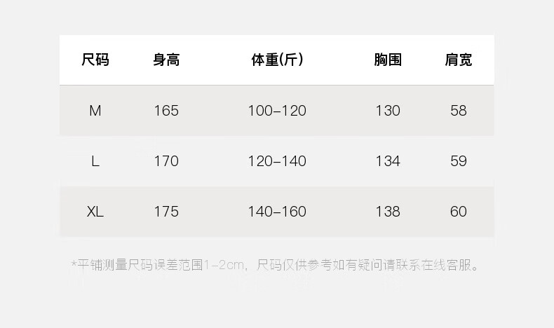 China (cm) 165 / 88-90 170 / 96-98 175 / 108-110 180 / 118-122 185 / 126-130