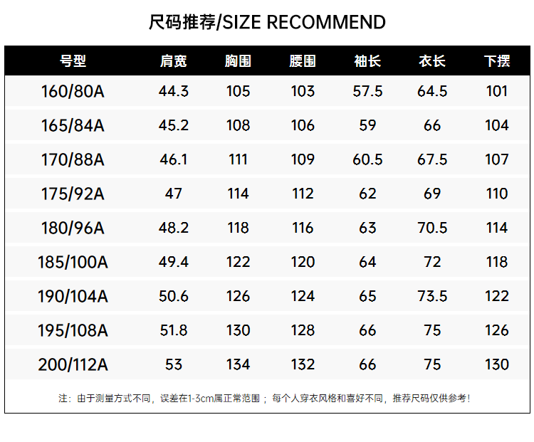 China (cm) 160-165/84-86 165-170 / 88-90 167-172 / 92-96 168-173 / 98-102 170-176 / 106-110