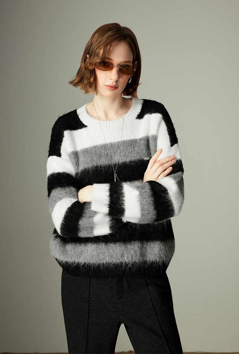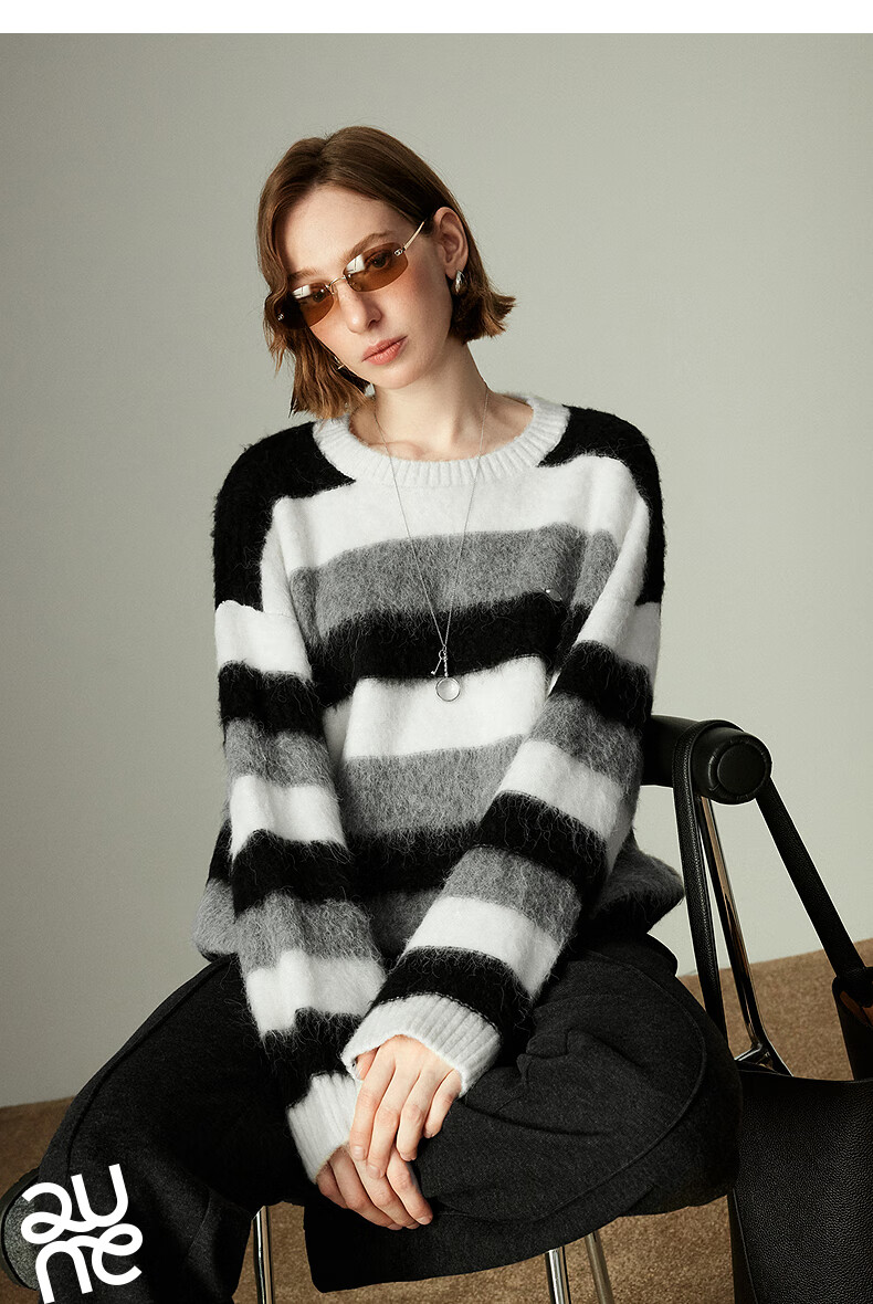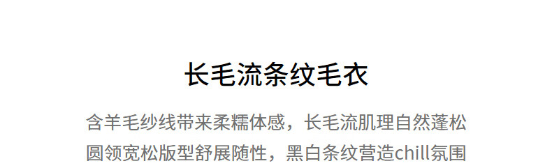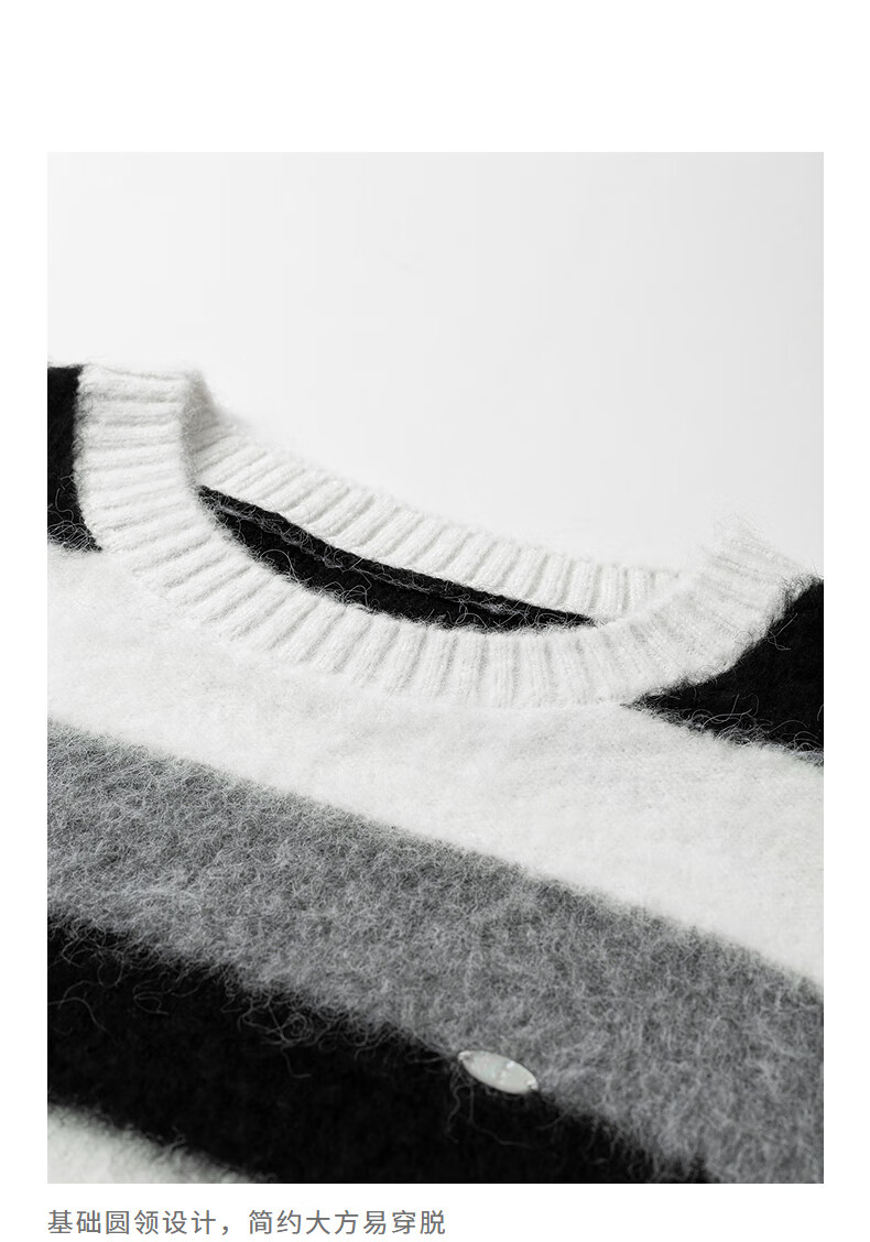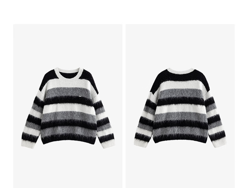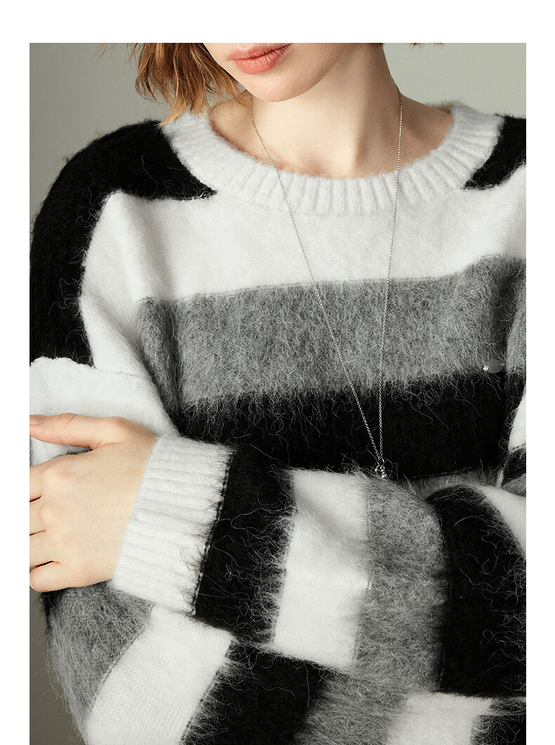 Chuyu Sweater Women's 2025 Winter New Style Round Neck Loose Black and White Stripes with Wool Atmosphere Long Hair Flow Top Black, White and Gray Stripes S