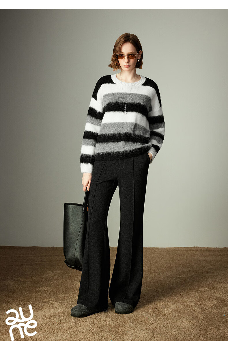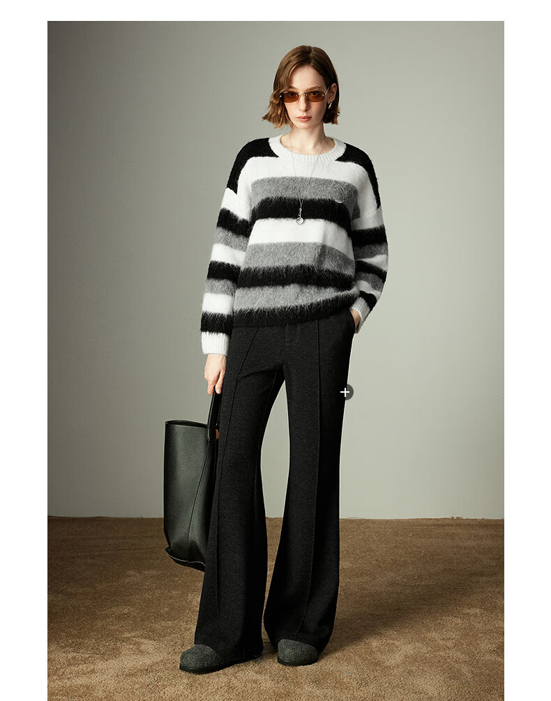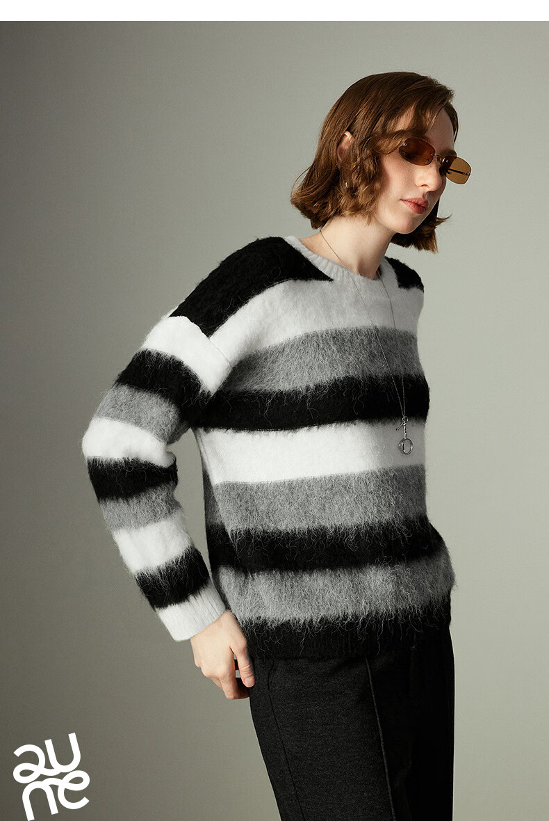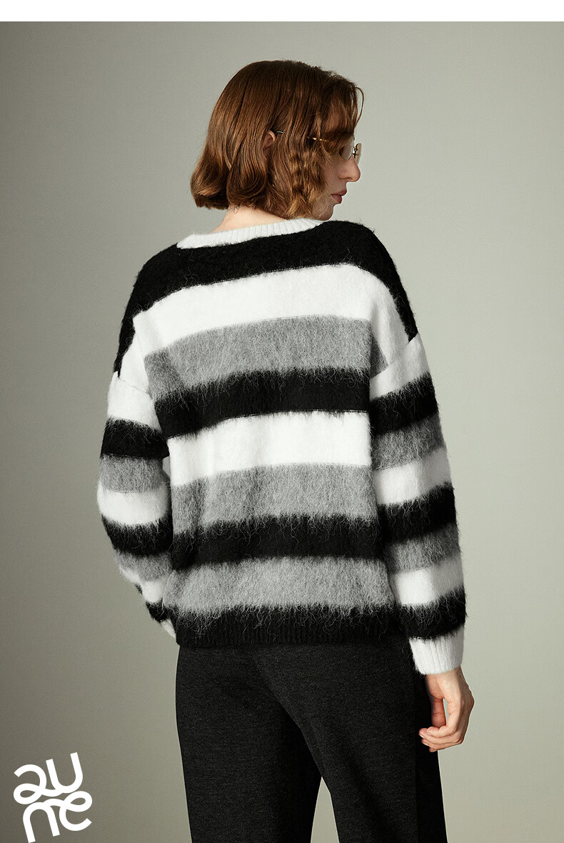 Chuyu Sweater Women's 2025 Winter New Style Round Neck Loose Black and White Stripes with Wool Atmosphere Long Hair Flow Top Black, White and Gray Stripes S
