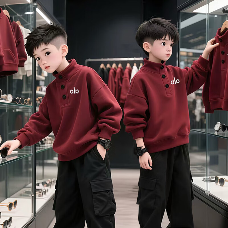 Three-leaf bean boys sweatshirt autumn and winter 2025 new children's velvet thickened tops for big boys boys New Year's red clothes red velvet style 150