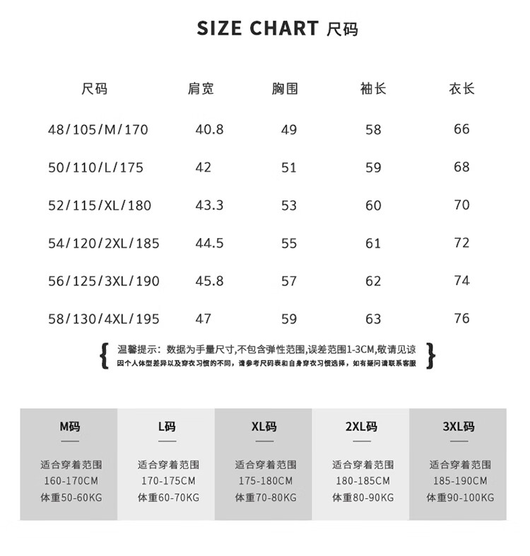 China (cm) 165 / 88-90 170 / 96-98 175 / 108-110 180 / 118-122 185 / 126-130