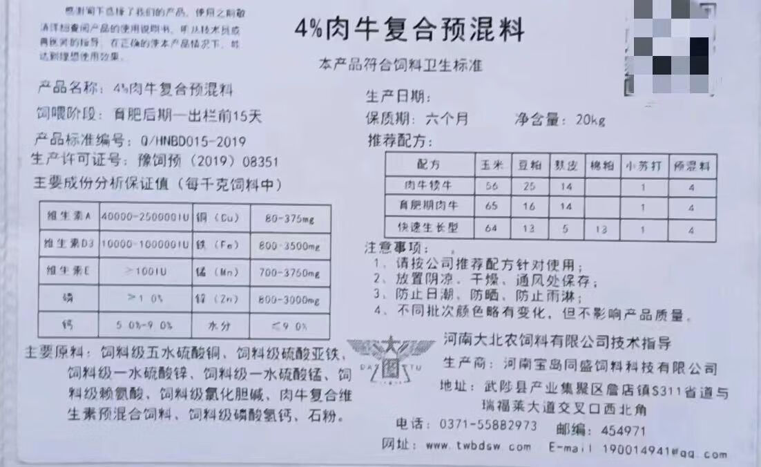 Henan Dabeinong 4 beef cattle premix rapid fattening, growth promotion, weight gain feed, promotion of rumination and anti-stress, one bag