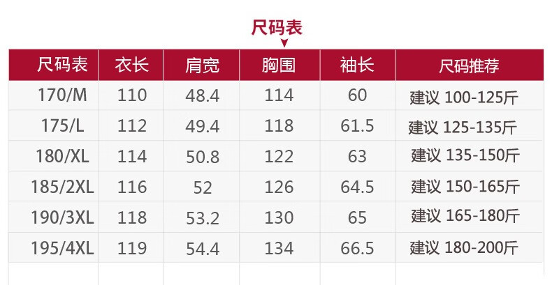 China (cm) 165 / 88-90 170 / 96-98 175 / 108-110 180 / 118-122 185 / 126-130
