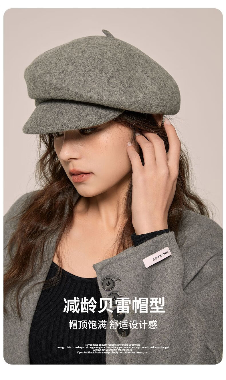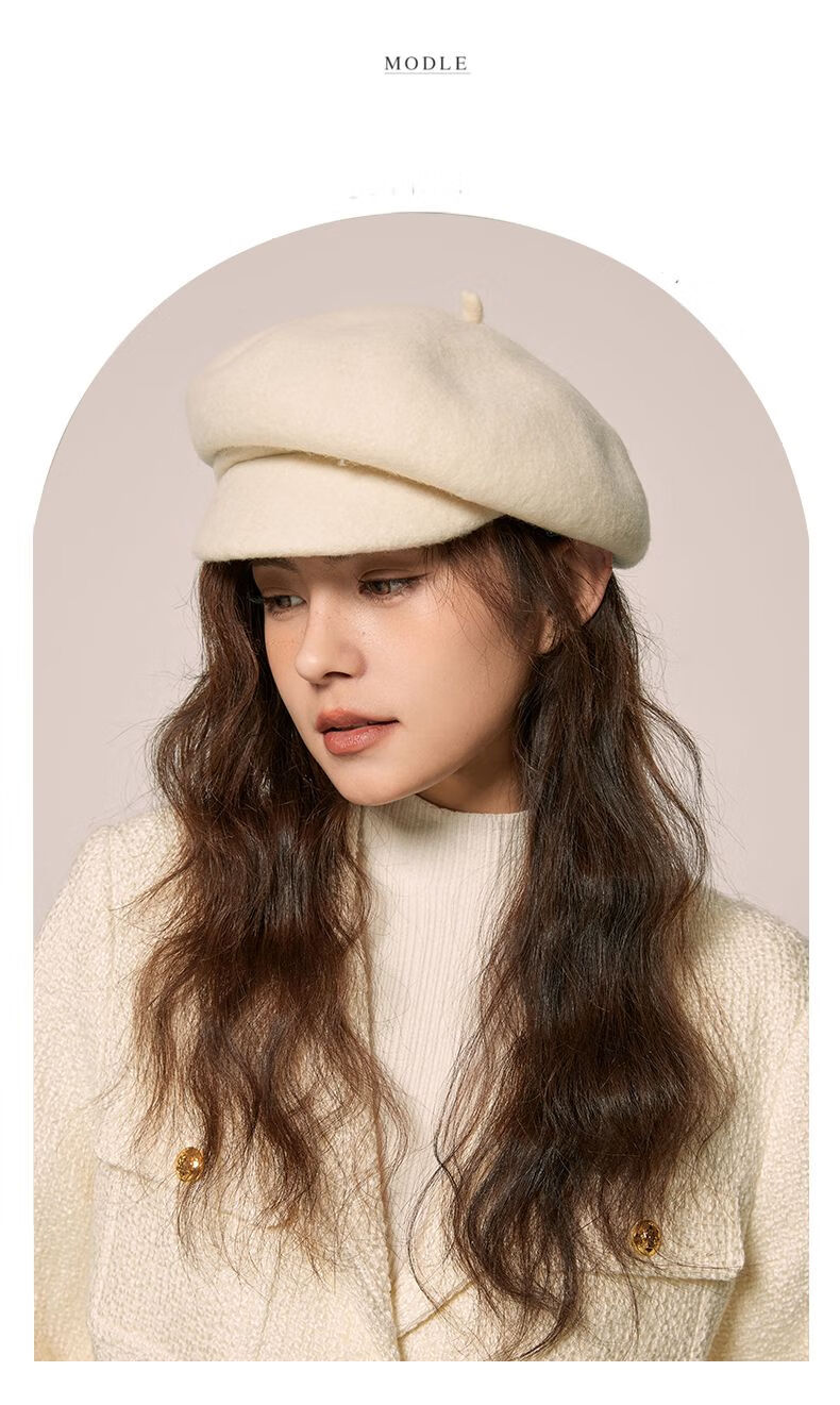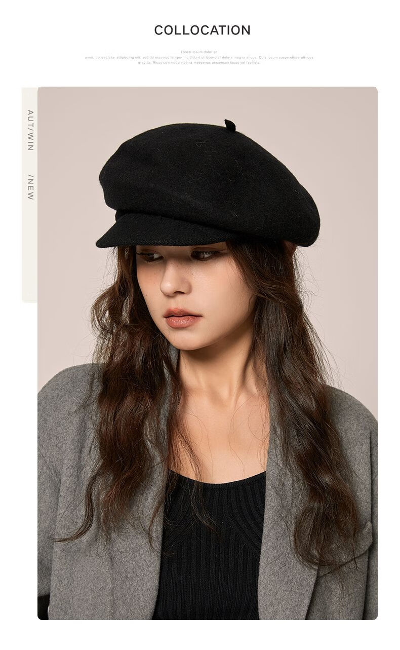 Shanghai Story Hat Autumn and Winter Wool Beret Women's Face Revealing Small Solid Color Large Head Circumference Versatile Painter Hat Literary Hat Layered Brim Beret - Black