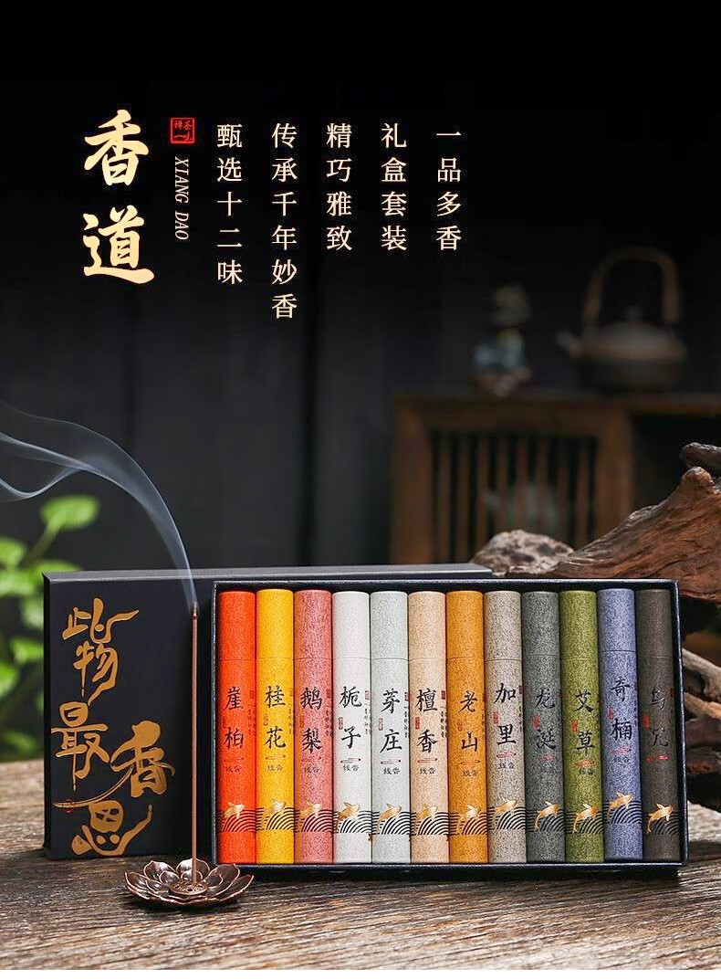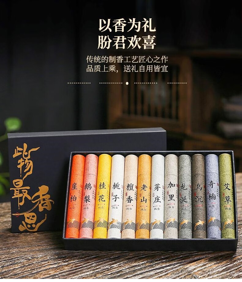 Fat Donglai's same natural sandalwood incense, agarwood, mugwort, goose pear, osmanthus incense, long-lasting incense for home bedrooms, gift box, 12 flavors, 30 pieces each + incense plate