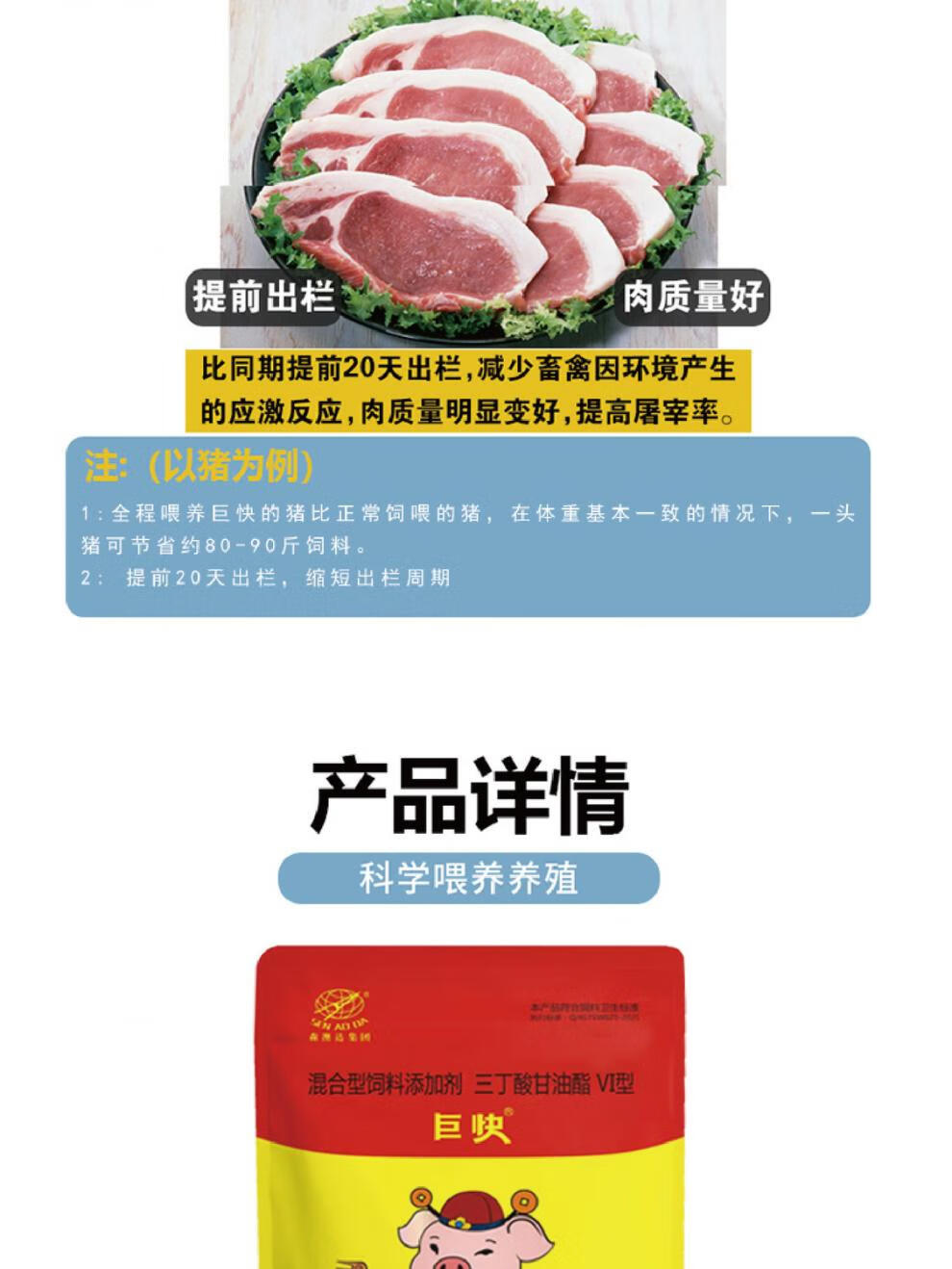 Sen A, A, D, Jukuai, special early slaughter mixed feed premix for fattening pigs. The day length is 3Jin. Jin is equal to 0.5 kg. 20 bags get 5 bags *Jukuai*. The more pigs eat, the more they grow.