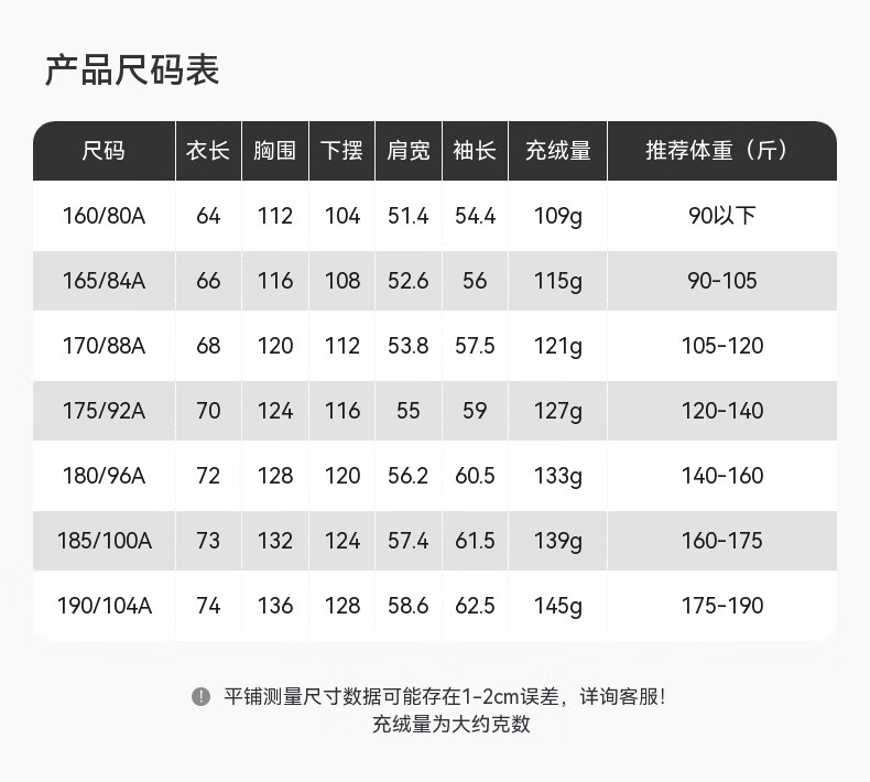 China (cm) 165 / 88-90 170 / 96-98 175 / 108-110 180 / 118-122 185 / 126-130