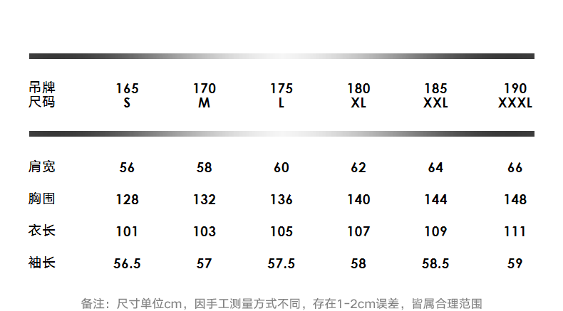 China (cm) 165 / 88-90 170 / 96-98 175 / 108-110 180 / 118-122 185 / 126-130