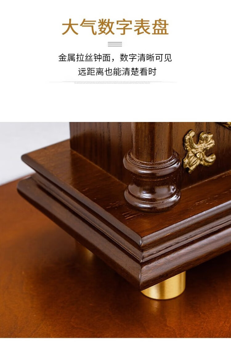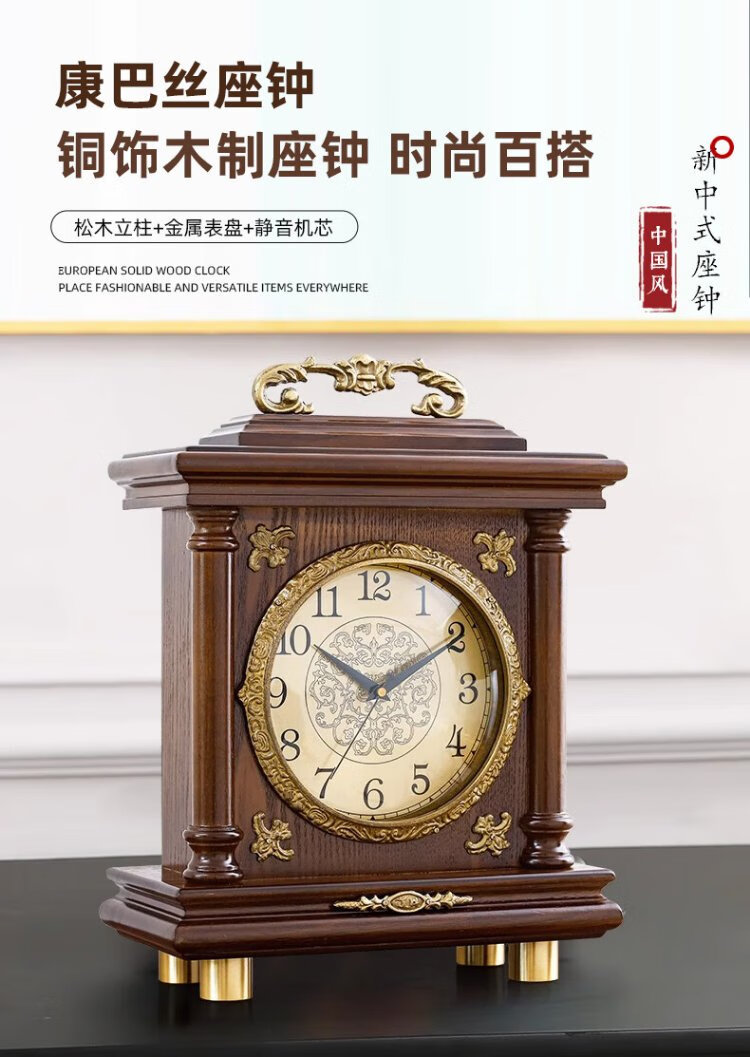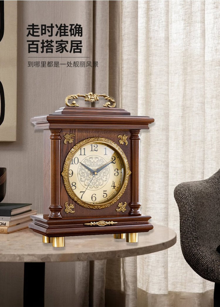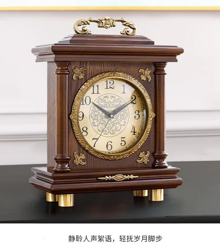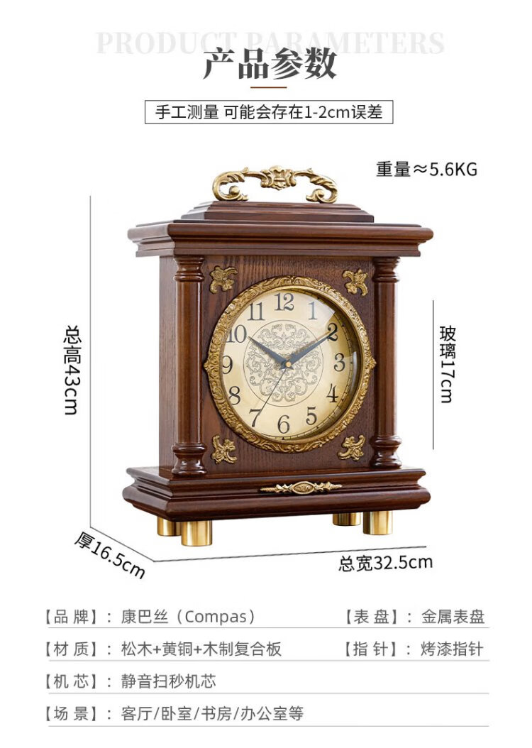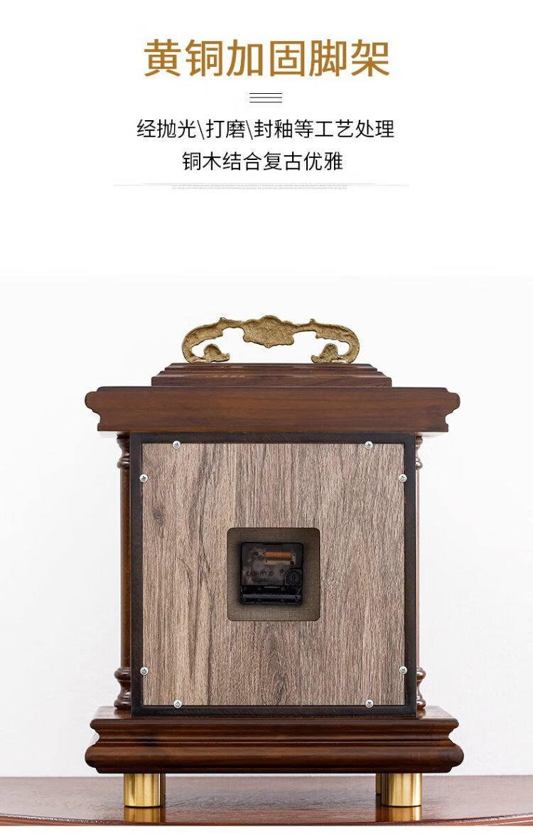 Compas new Chinese style solid wood clock, light luxury brass home living room clock, European and American retro table clock, classical clock ornaments, brass column style - metal dial
