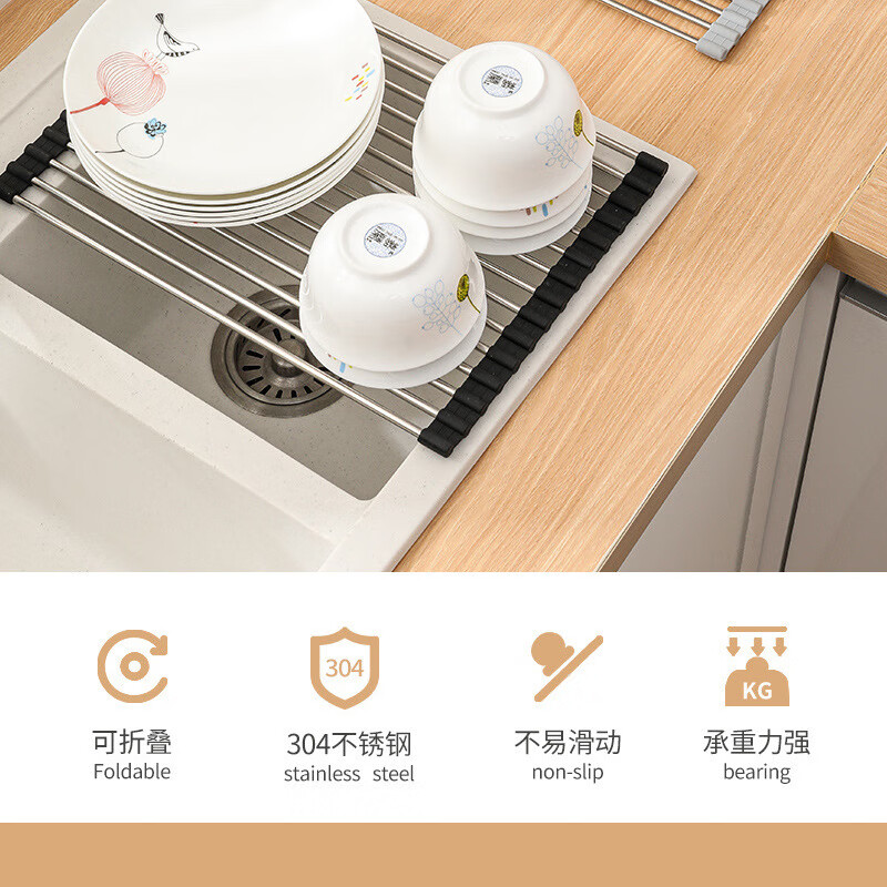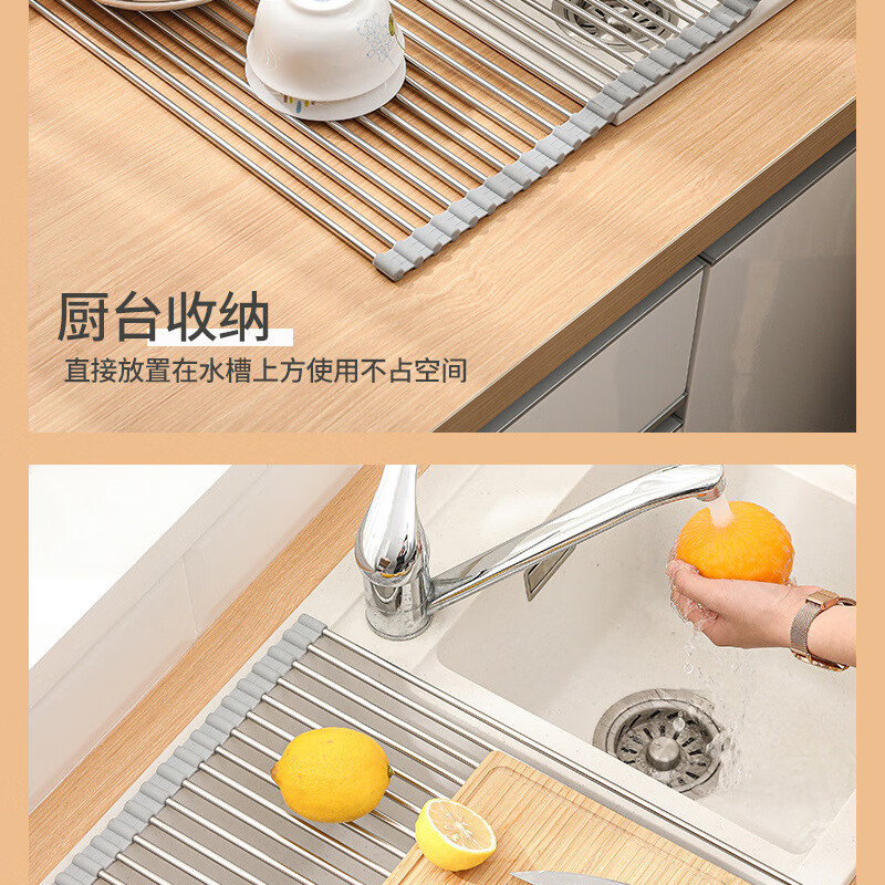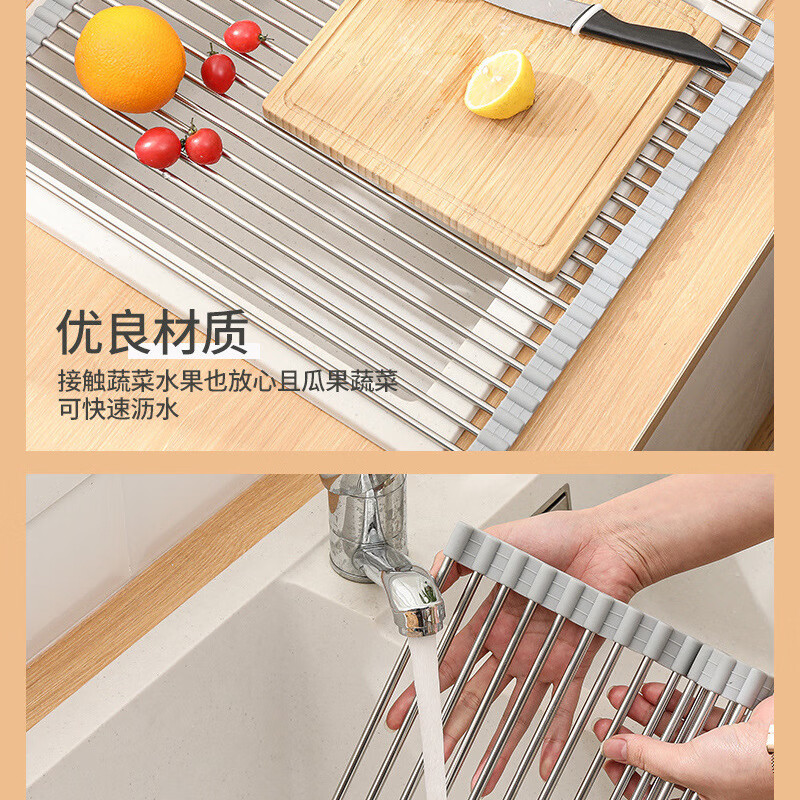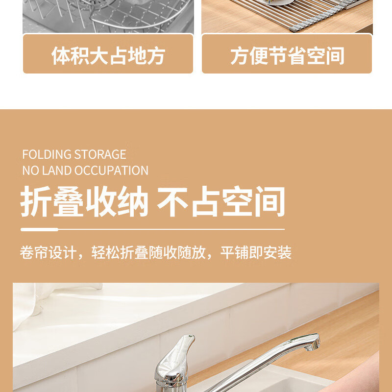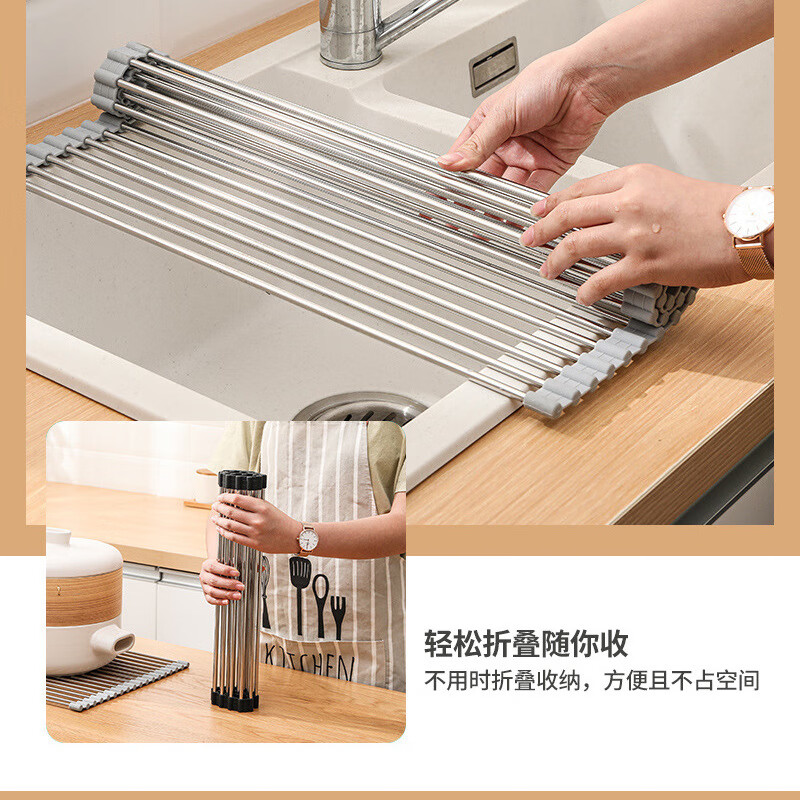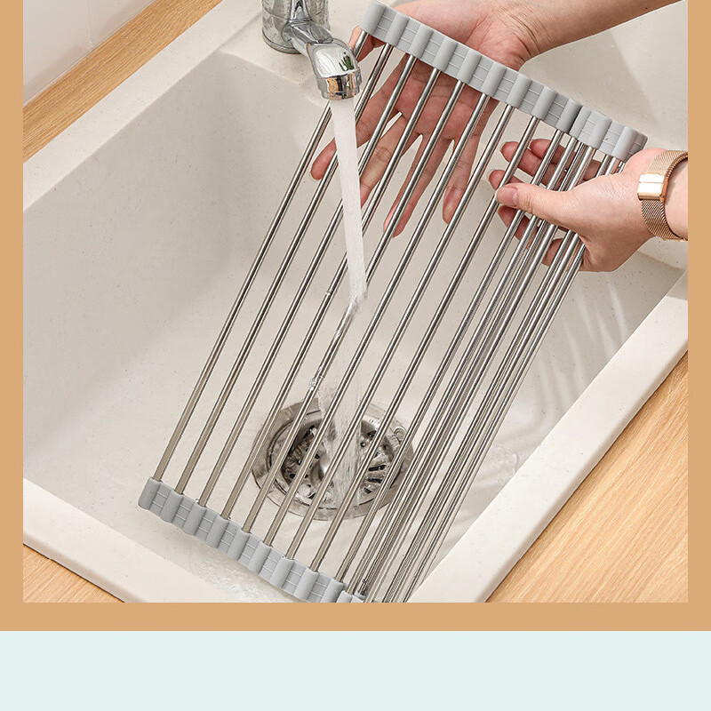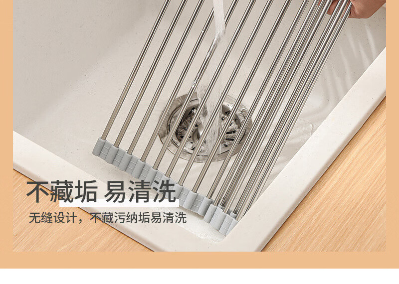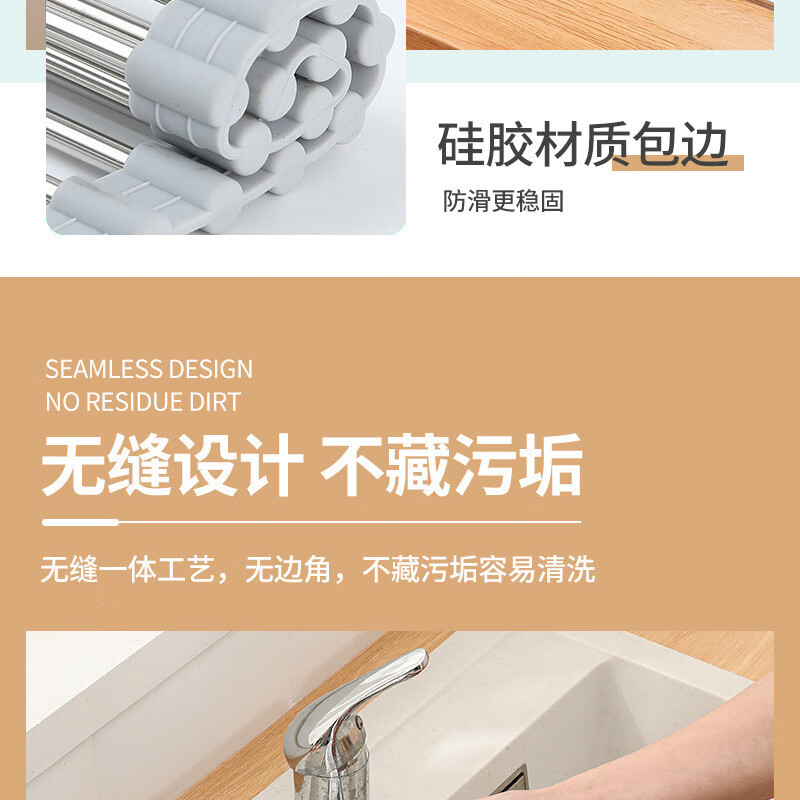 Stainless steel drain roller curtain kitchen sink drain rack foldable drain rack mildew-proof silicone storage rack jt large thickened drain rack-folding storage kitchen expansion/takes up no space/high and low temperature resistance
