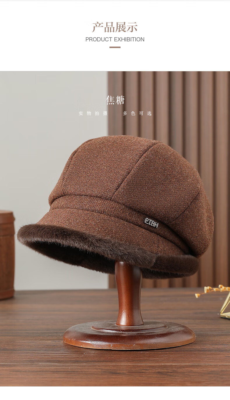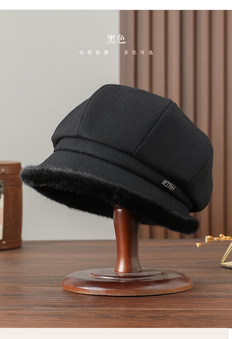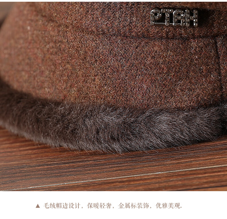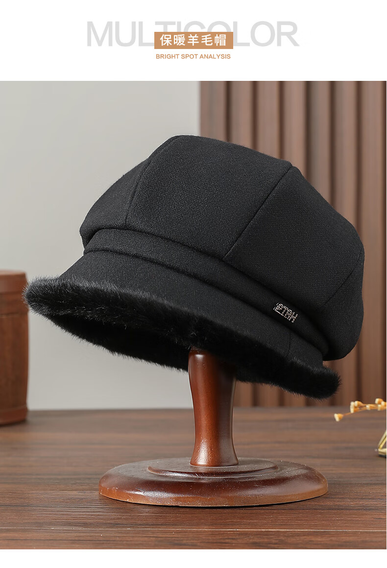 PTAH hat women's octagonal beret autumn and winter versatile wool hat blended bud fashion simple face showing small street keeping warm black