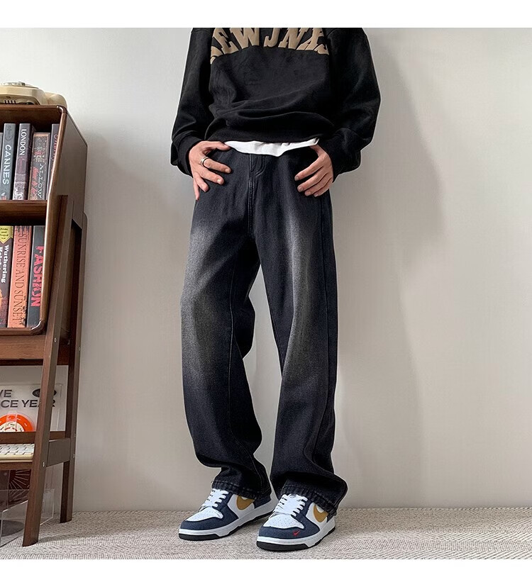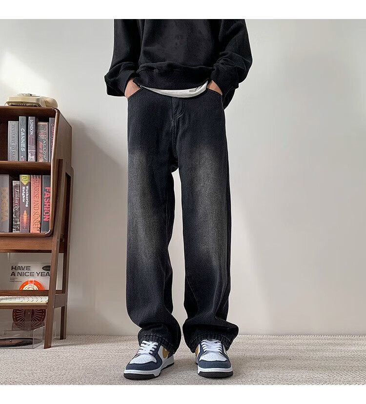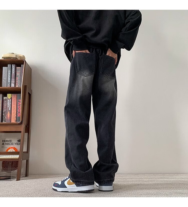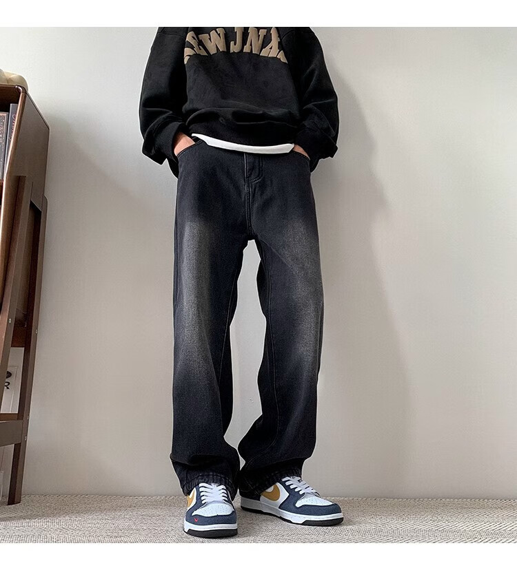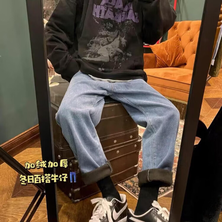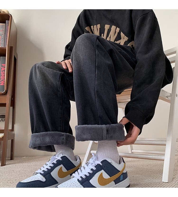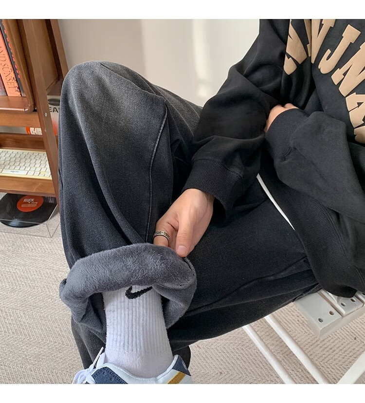 Woodpecker 2025 new American style velvet thickened jeans autumn high street smoke gray casual wide-leg straight casual trousers black gray XL recommended 145-160Jin Jin equals 0.5 kg
