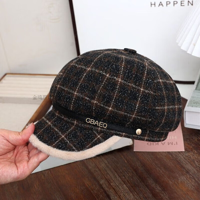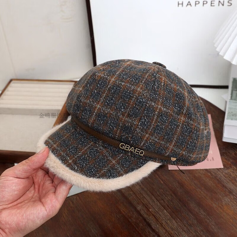 Tuzun 2025 new Korean style plaid octagonal hat British retro plus velvet beret versatile college painter newsboy plush plaid-G khaki one size fits all head circumference 55-58
