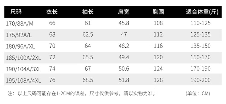 China (cm) 165 / 88-90 170 / 96-98 175 / 108-110 180 / 118-122 185 / 126-130