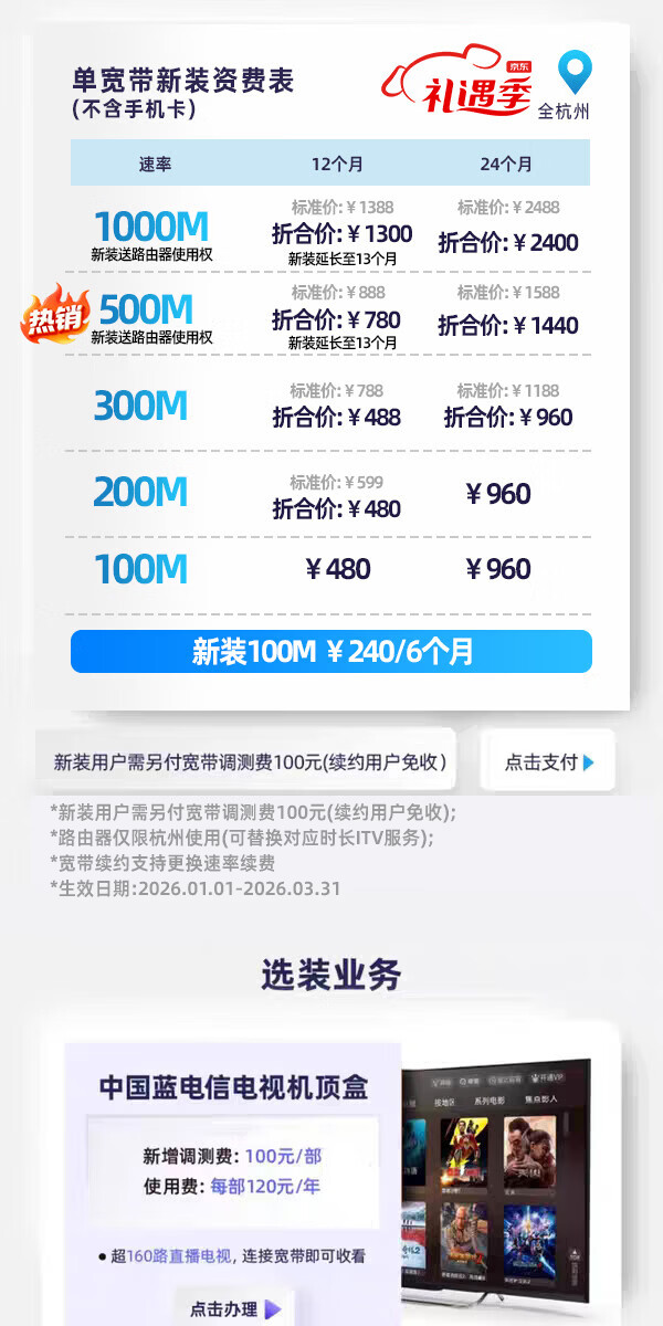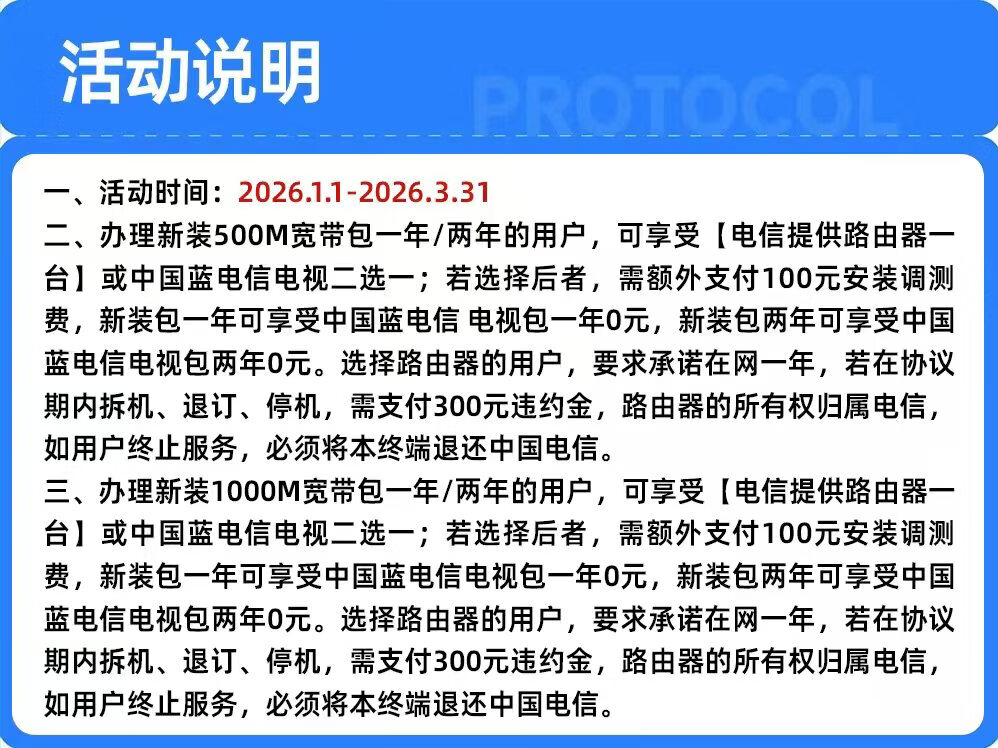 China Telecom's high-speed broadband can be installed in Hangzhou for 1 year and can be given free router 500M/1 year newly installed