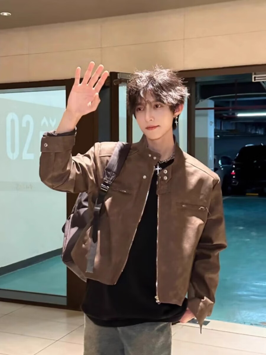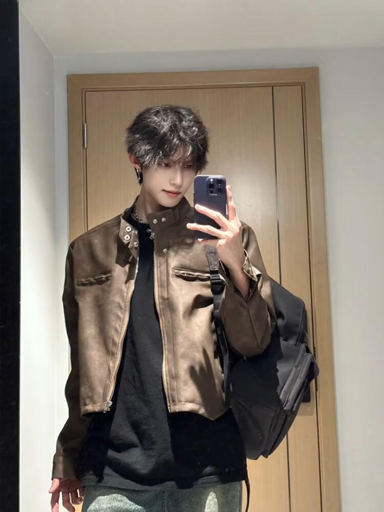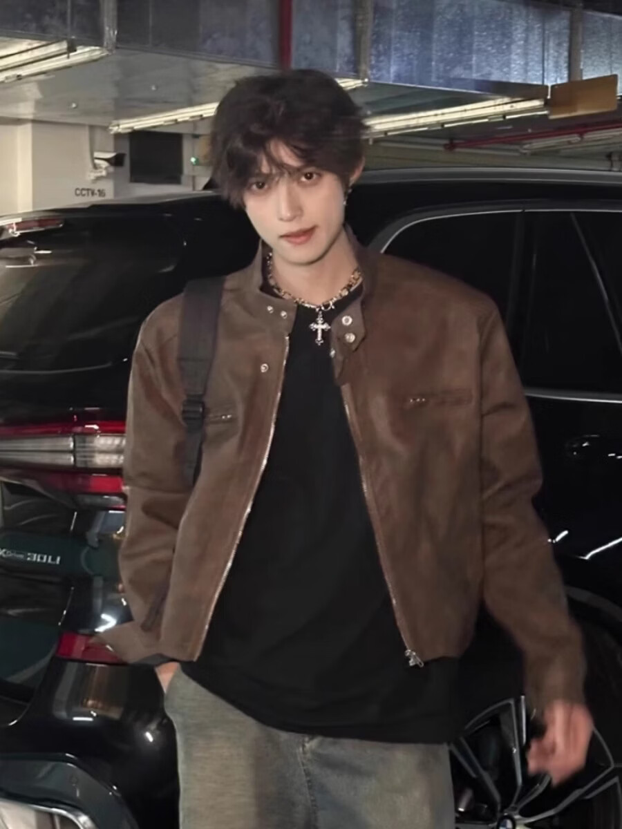 Fat Donglai Supermarket purchasing the same style leather jacket Maillard wear high street handsome jacket men retro brown PU dark brown high quality 2XL