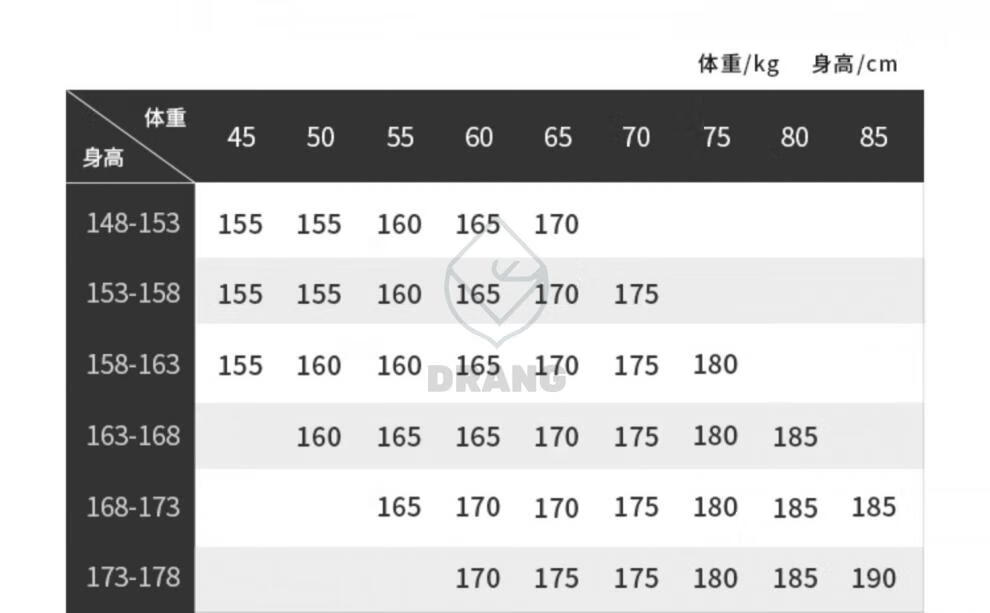 China (cm) 160-165/84-86 165-170 / 88-90 167-172 / 92-96 168-173 / 98-102 170-176 / 106-110