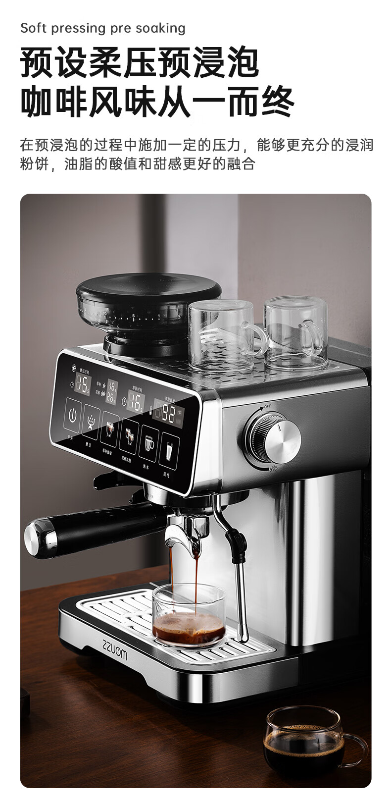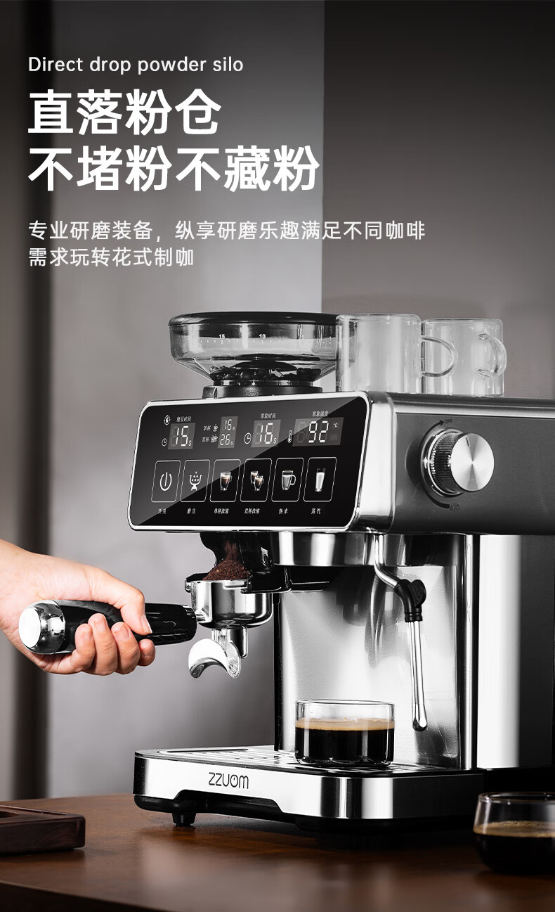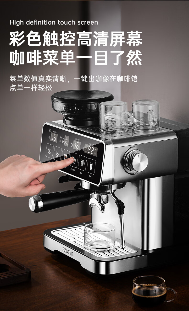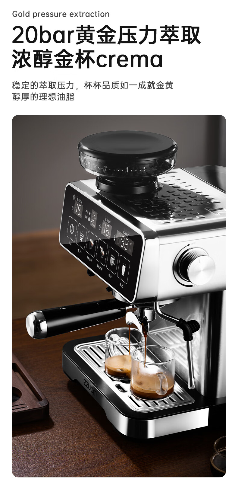 ZZUOM coffee machine semi-automatic grinding integrated small fully automatic household coffee grinder Italian American espresso 20Ba high pressure extraction pre-soaking strong steam adjustable milk frothing color screen one-button intelligent extraction 20Bar/grinding integrated