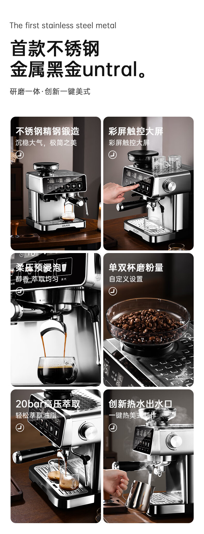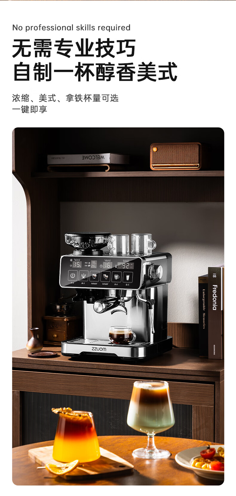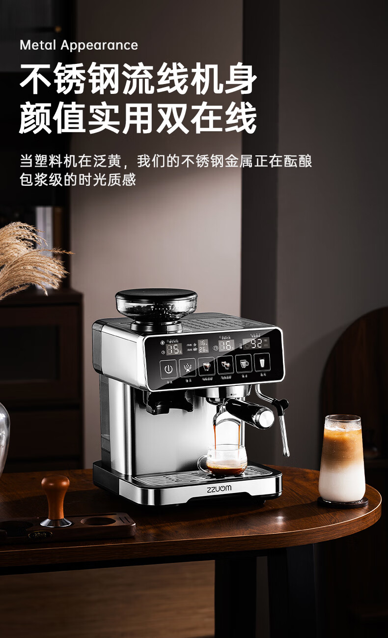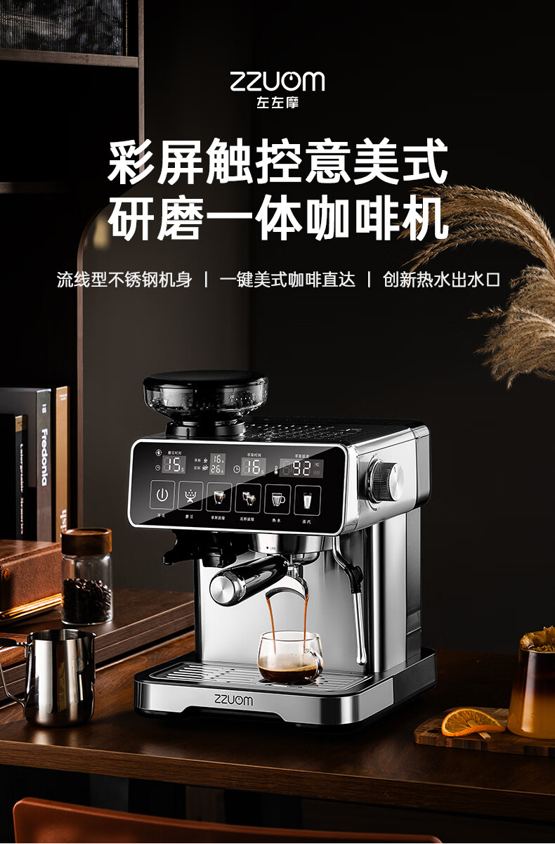 ZZUOM coffee machine semi-automatic grinding integrated small fully automatic household coffee grinder Italian American espresso 20Ba high pressure extraction pre-soaking strong steam adjustable milk frothing color screen one-button intelligent extraction 20Bar/grinding integrated