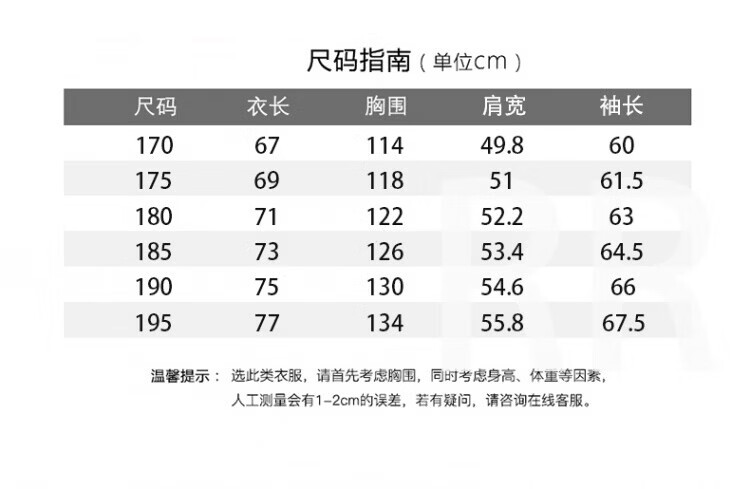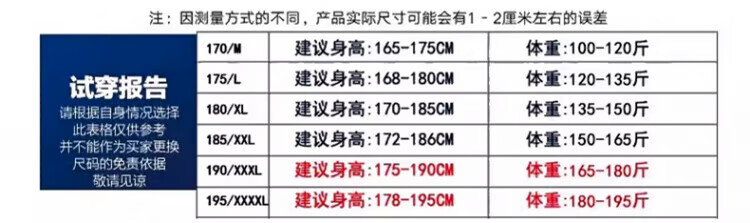 China (cm) 165 / 88-90 170 / 96-98 175 / 108-110 180 / 118-122 185 / 126-130