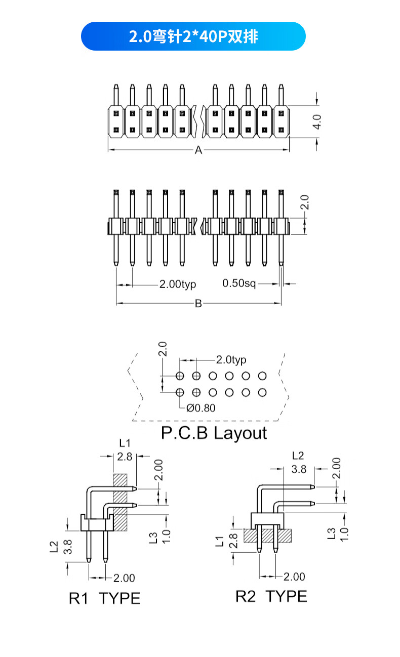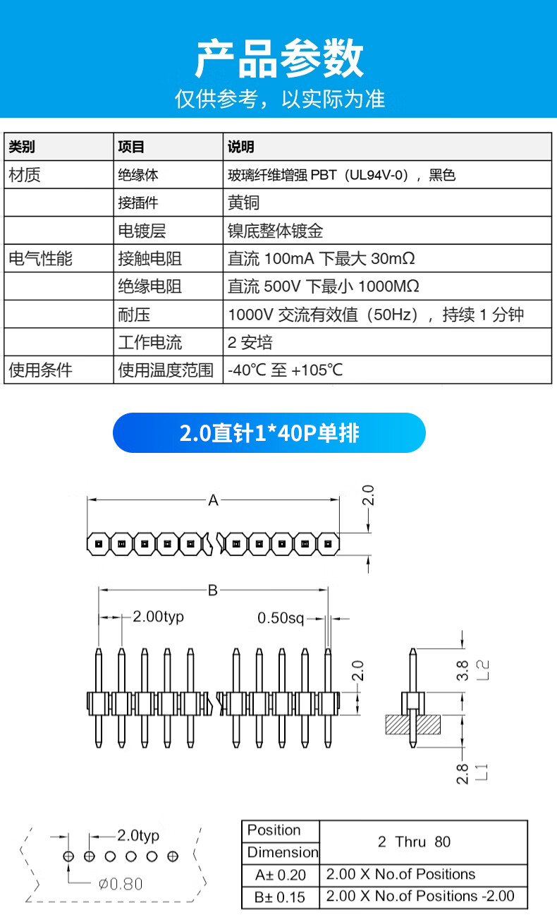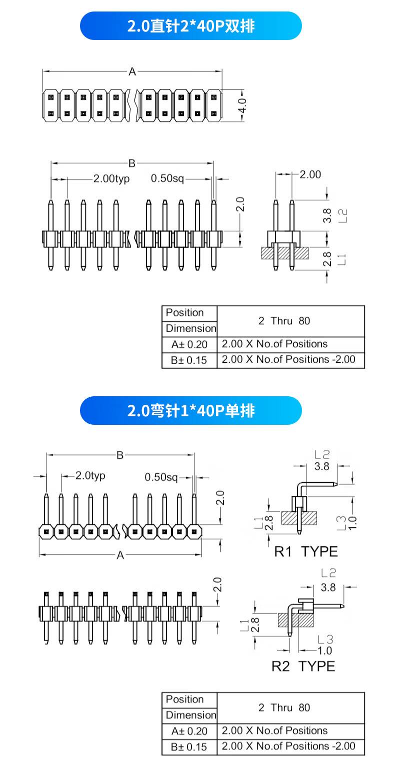 Single row of pins Double row of pins Black 2.0mm pitch 1*40P pins 2*40P straight pins/curved pins Copper pins 2.0 straight pins 1*40P single row (10 pieces) No Specifications