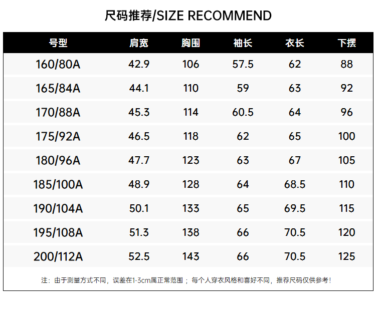 China (cm) 165 / 88-90 170 / 96-98 175 / 108-110 180 / 118-122 185 / 126-130
