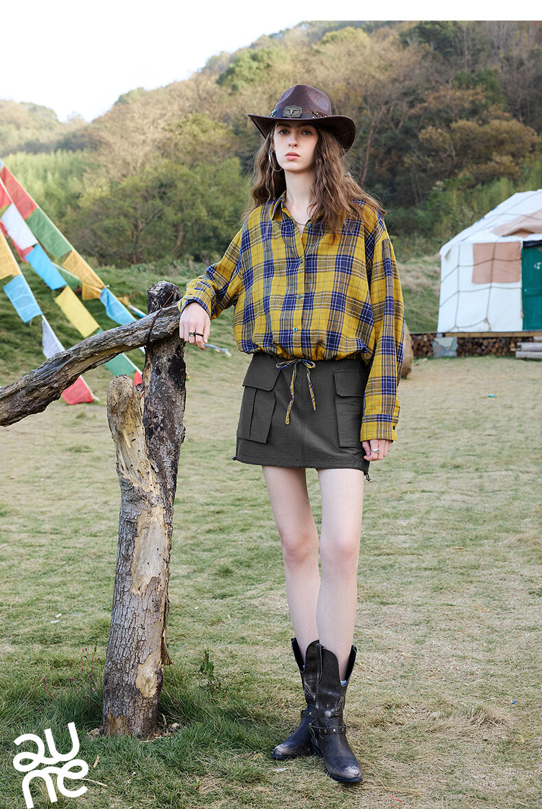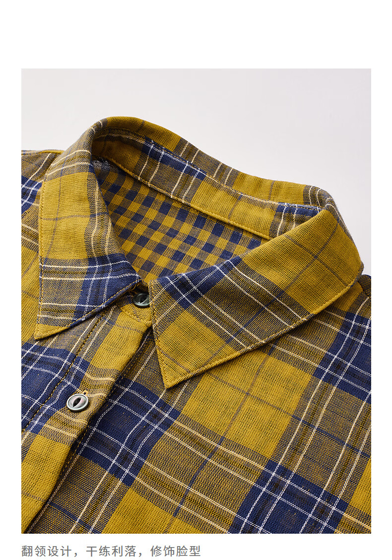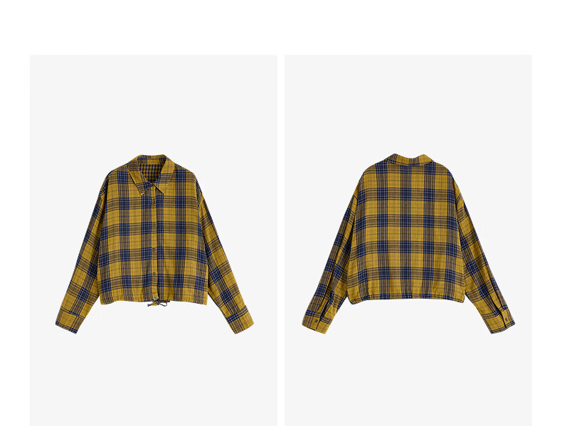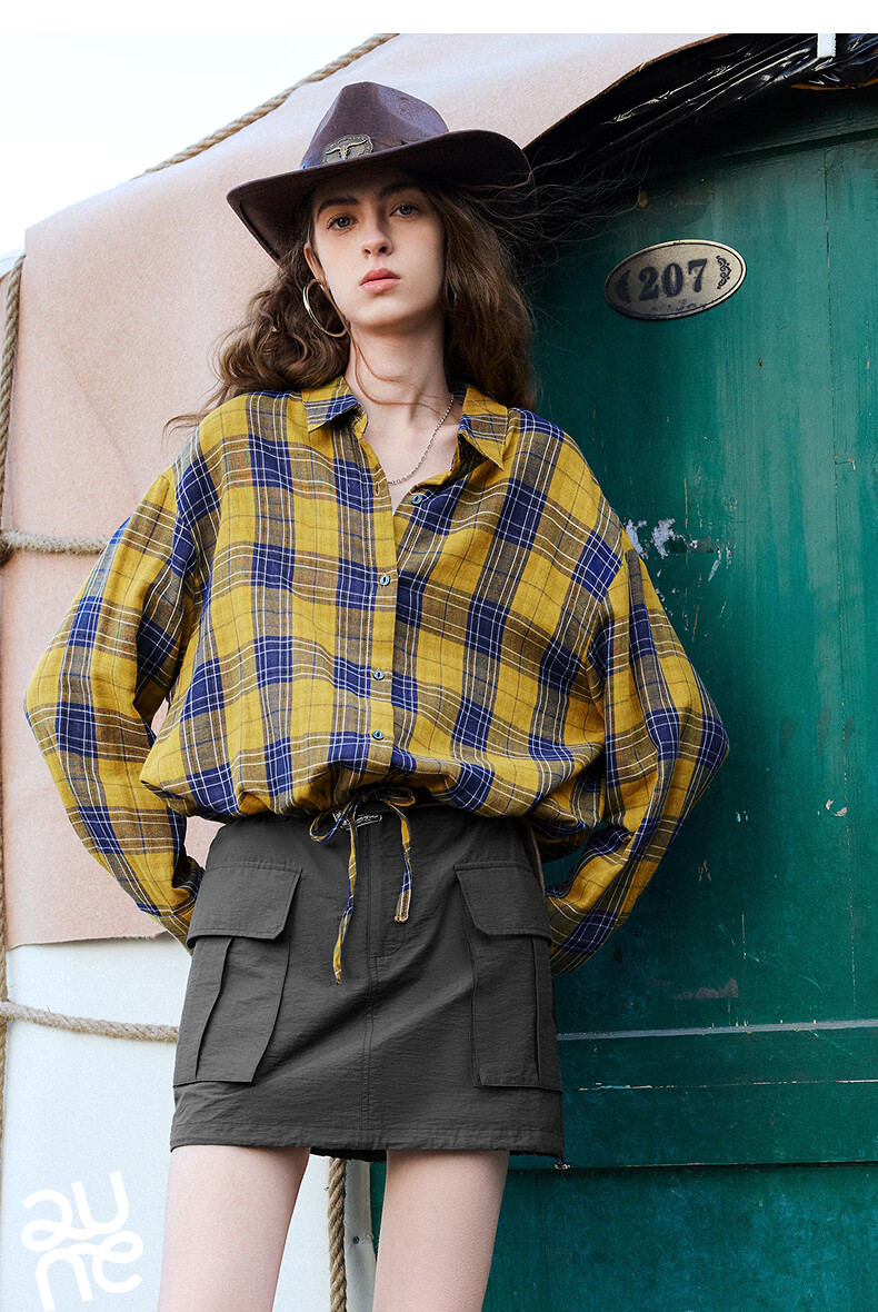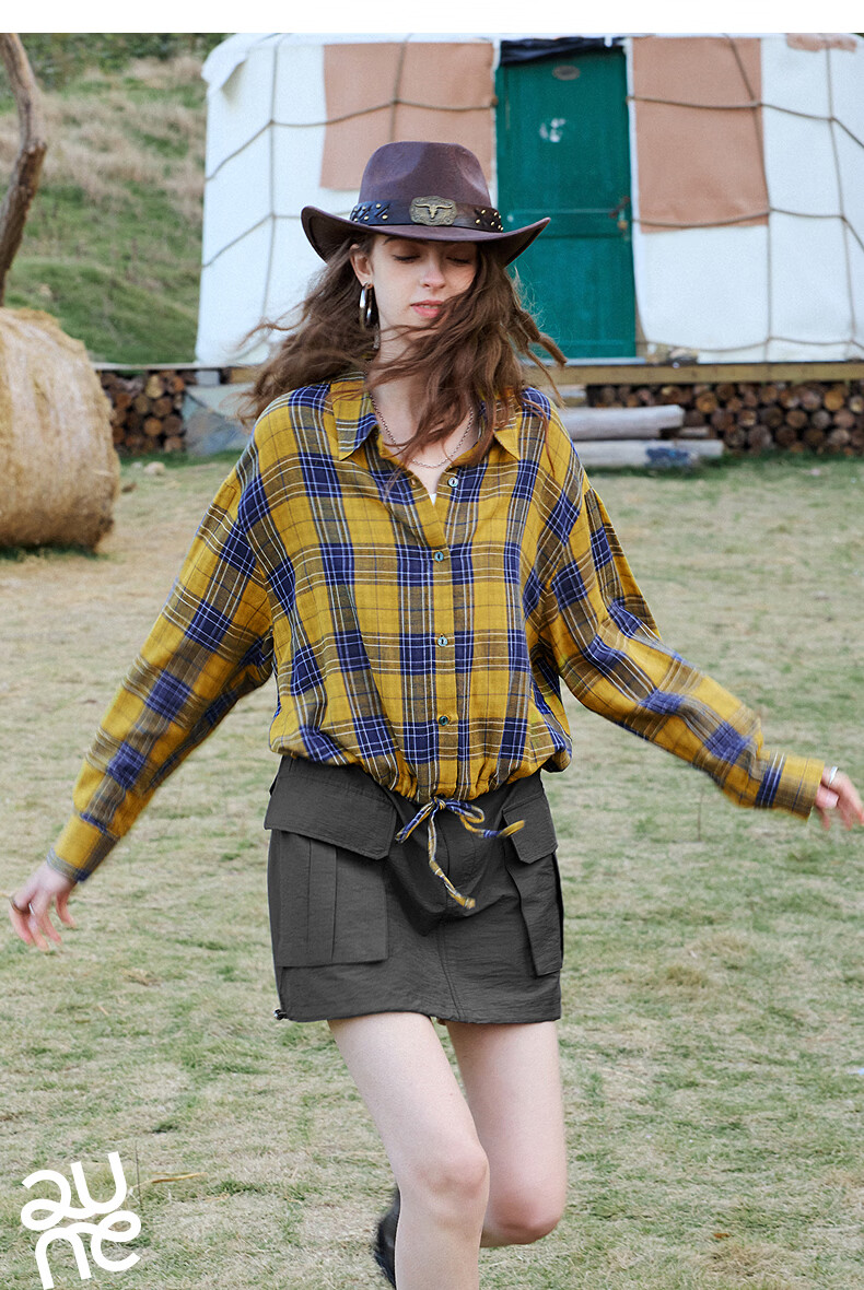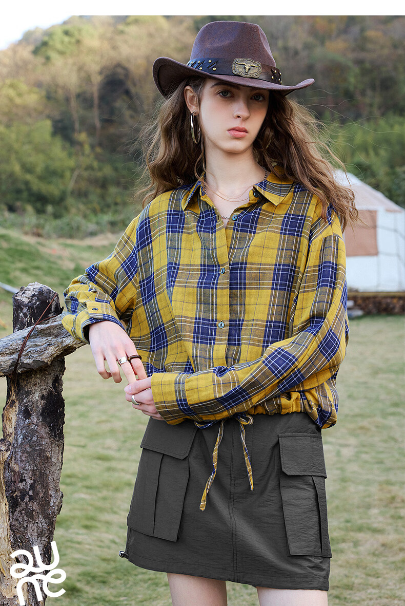 Chuyu Return to Countryside Pure Cotton Shirt Women's 2026 Spring New Loose Retro Plaid Waist Shirt Top Yellow Blue Check S