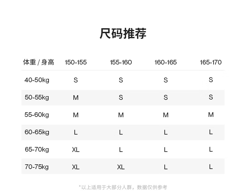 China (cm) 160-165/84-86 165-170 / 88-90 167-172 / 92-96 168-173 / 98-102 170-176 / 106-110