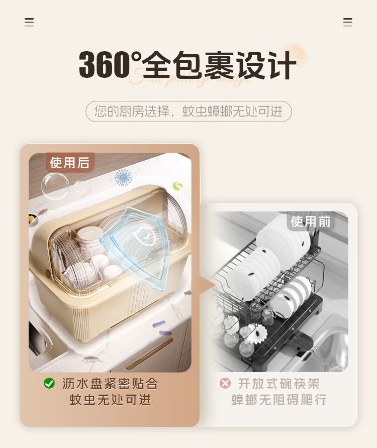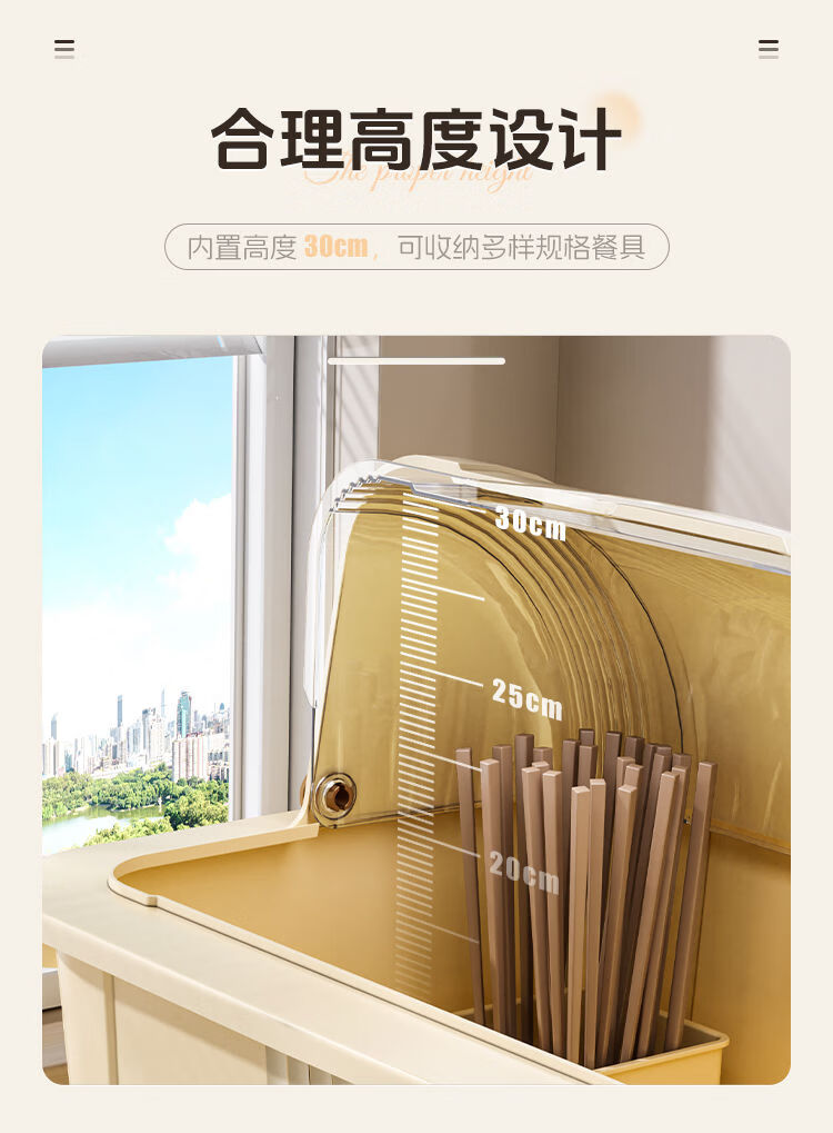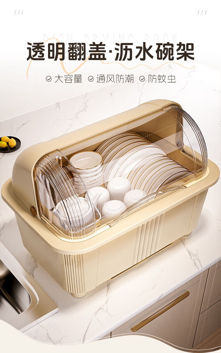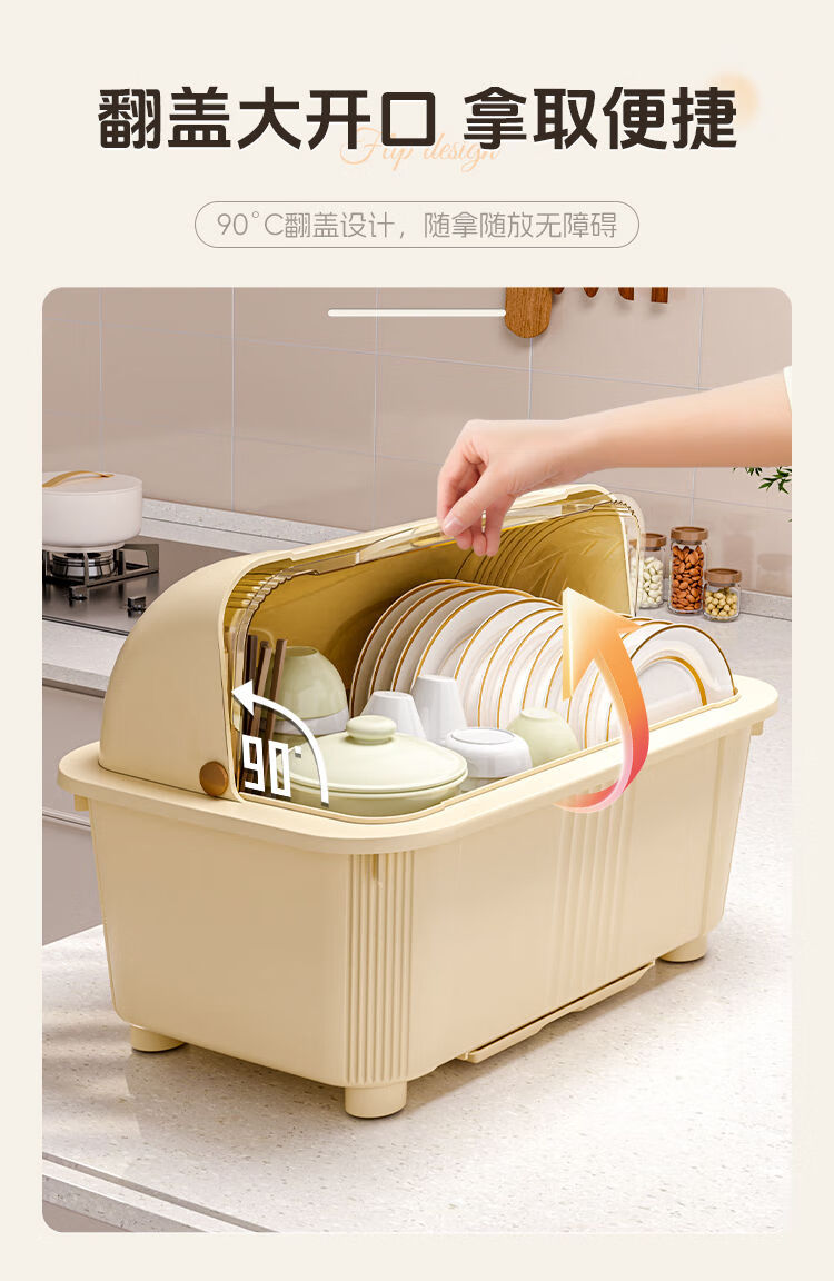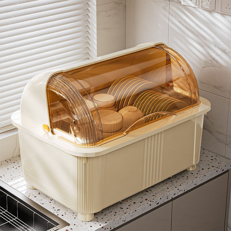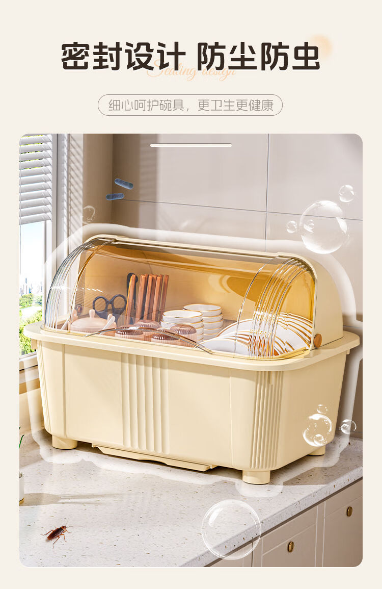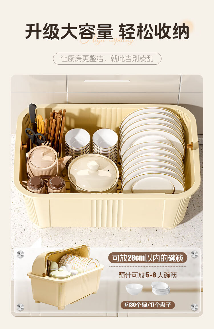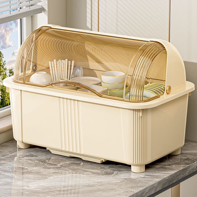 Fantasy bowl and chopsticks storage box, dish storage rack, kitchen utensil storage rack, drain bowl cabinet with lid, extra large cream yellow, holds about 12 bowls/10 plates