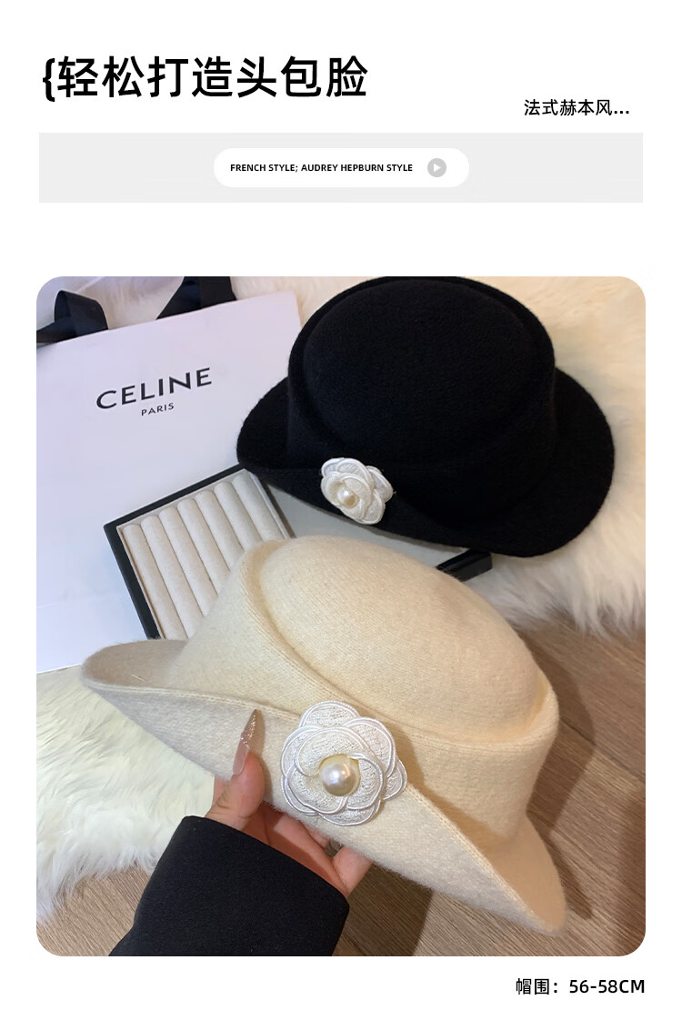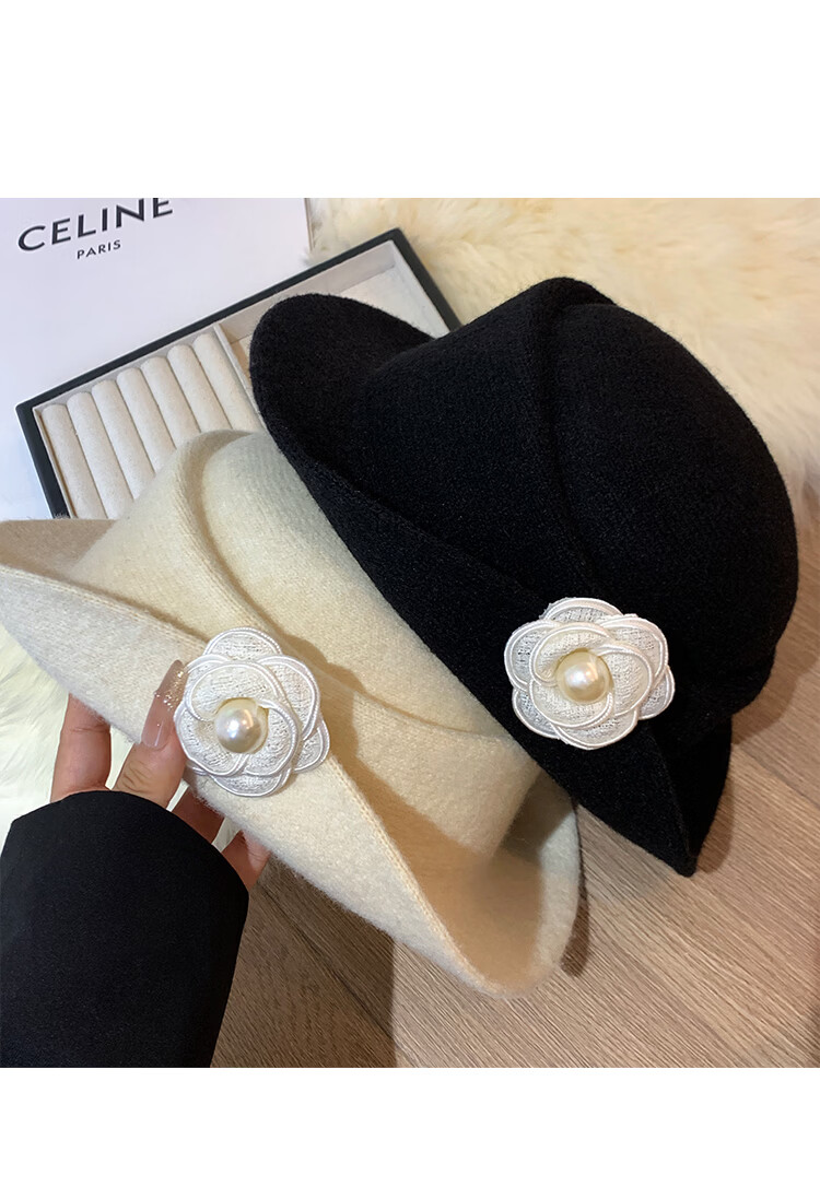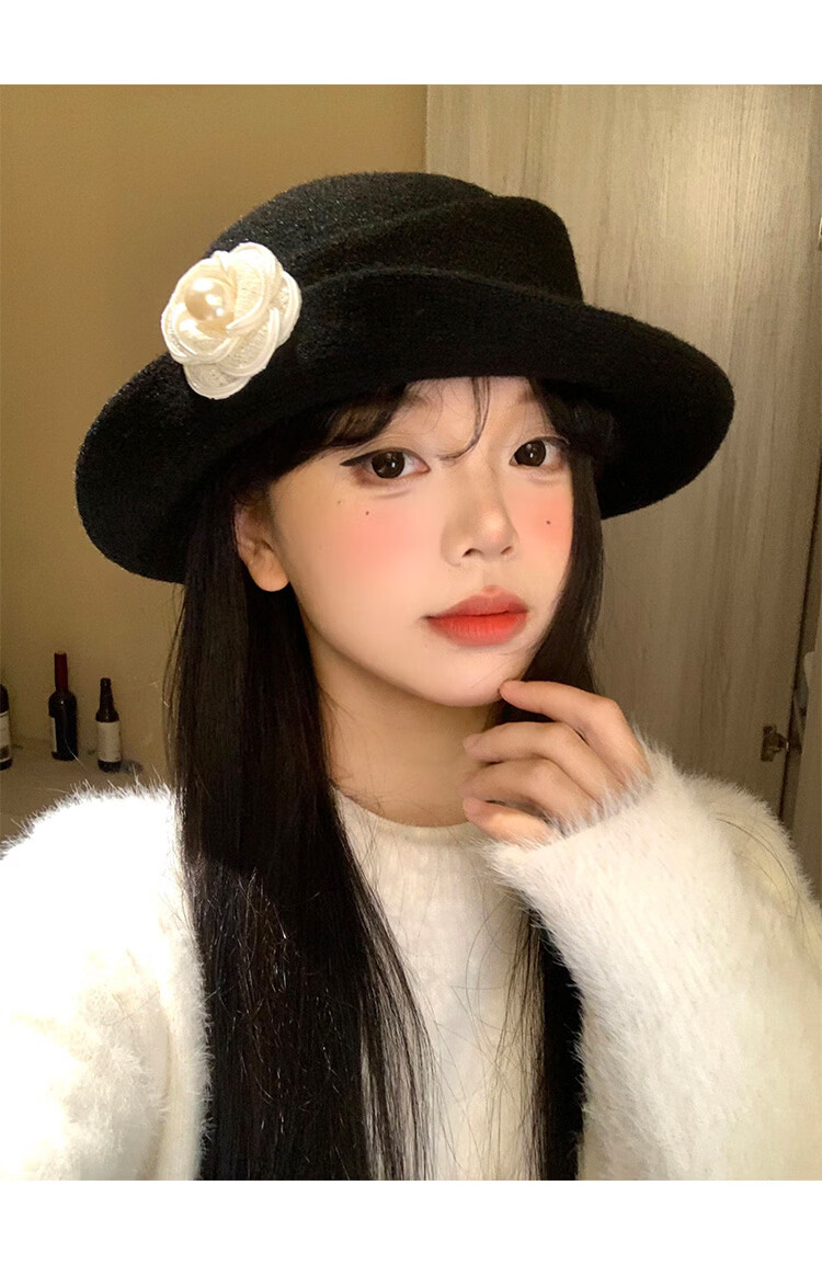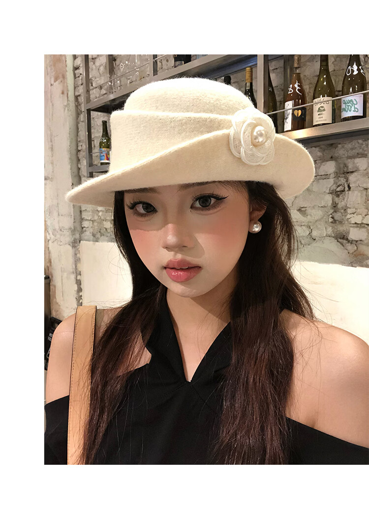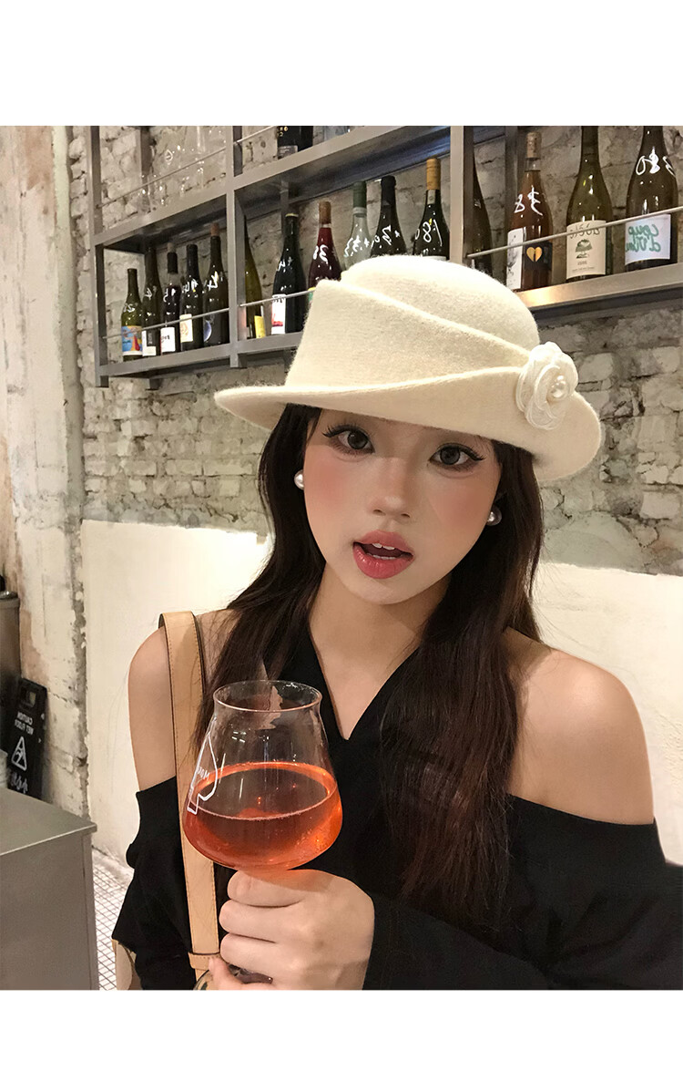 Ershanji French style elegant top hat for women in autumn and winter Hepburn style beret retro fashion face-showing small hat fisherman hat camellia thousand gold hat white