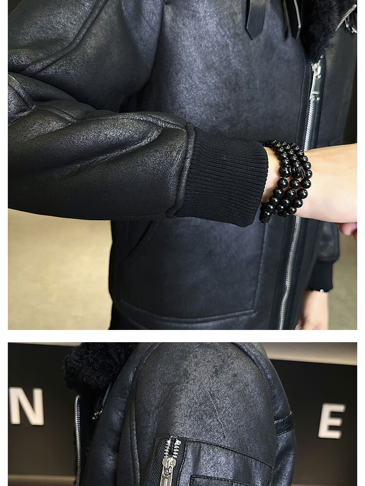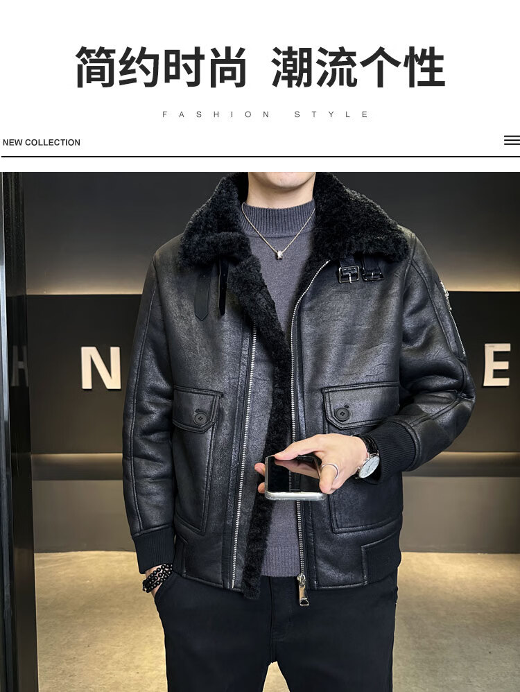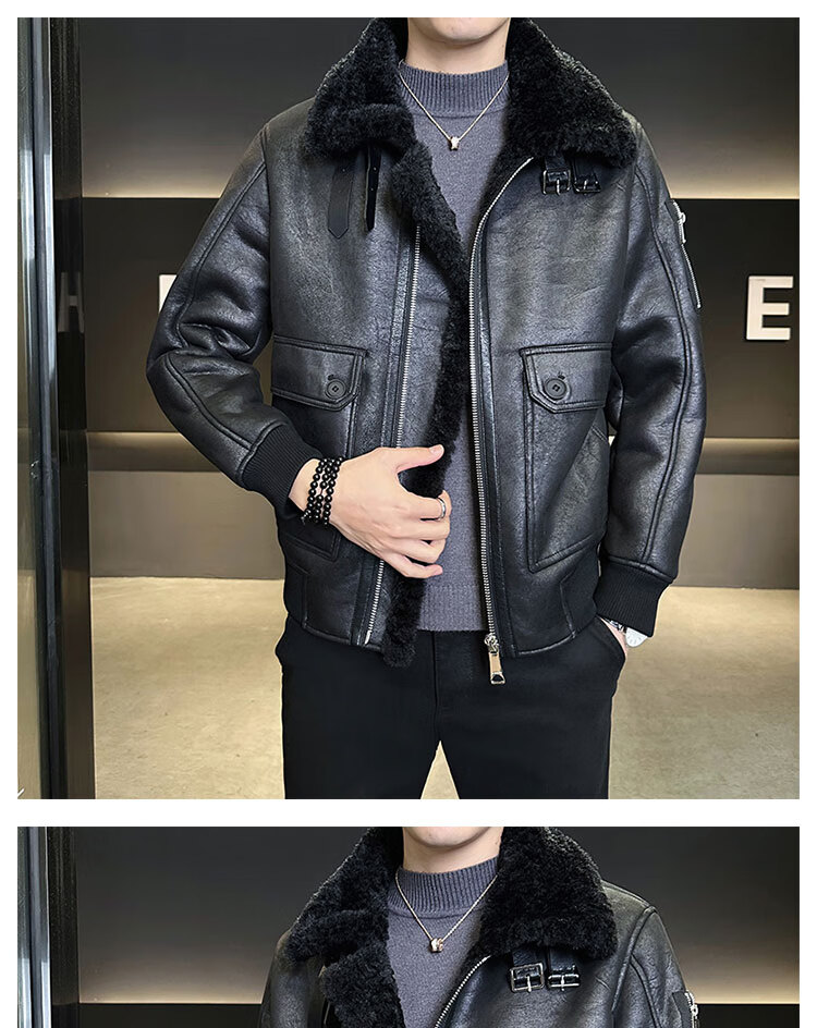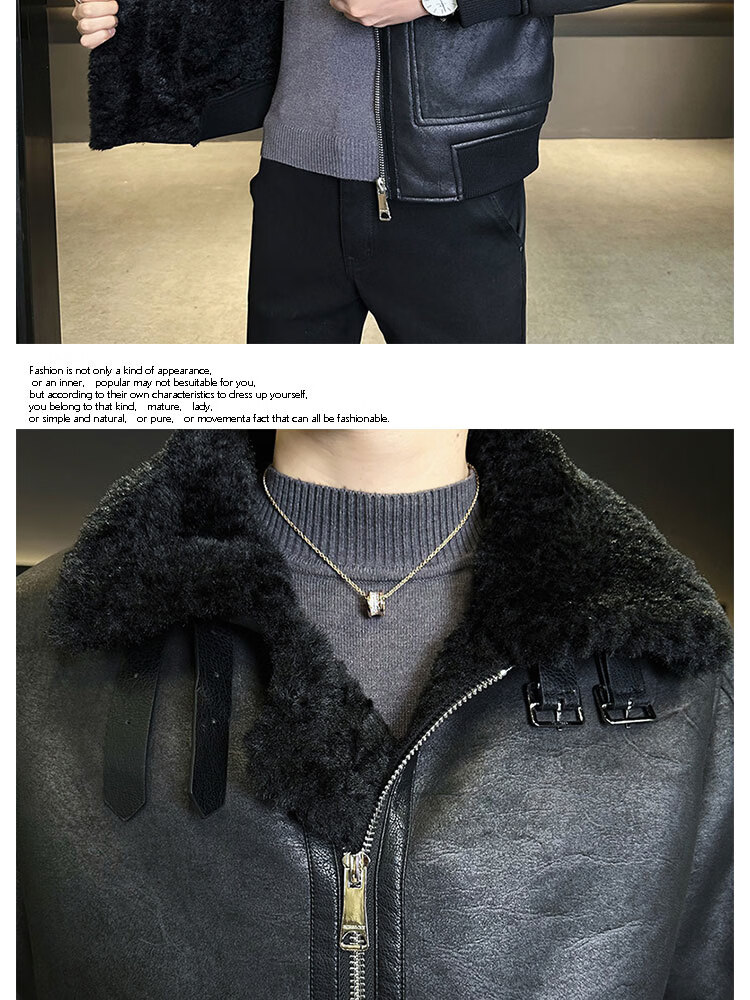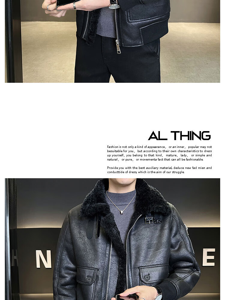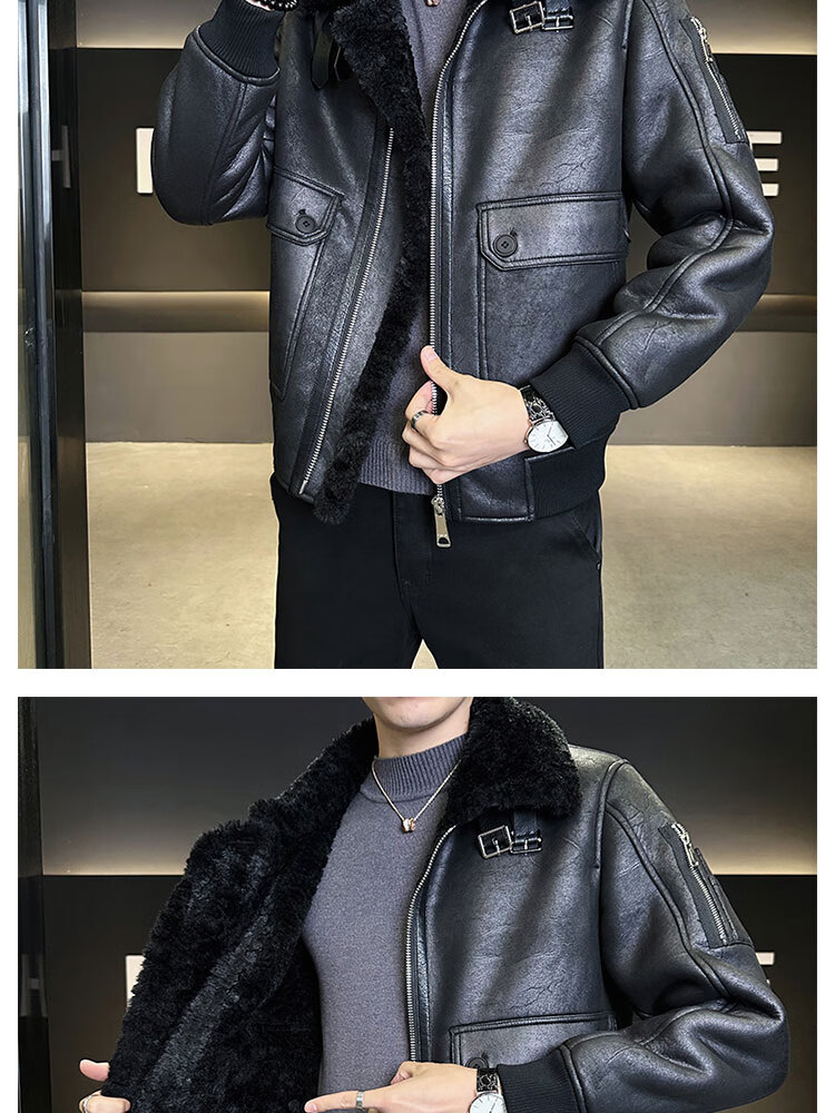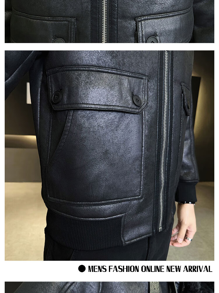Hengyuanxiang new winter PU fur one-piece jacket men's trendy brand loose casual plus velvet thickened short motorcycle leather jacket black L