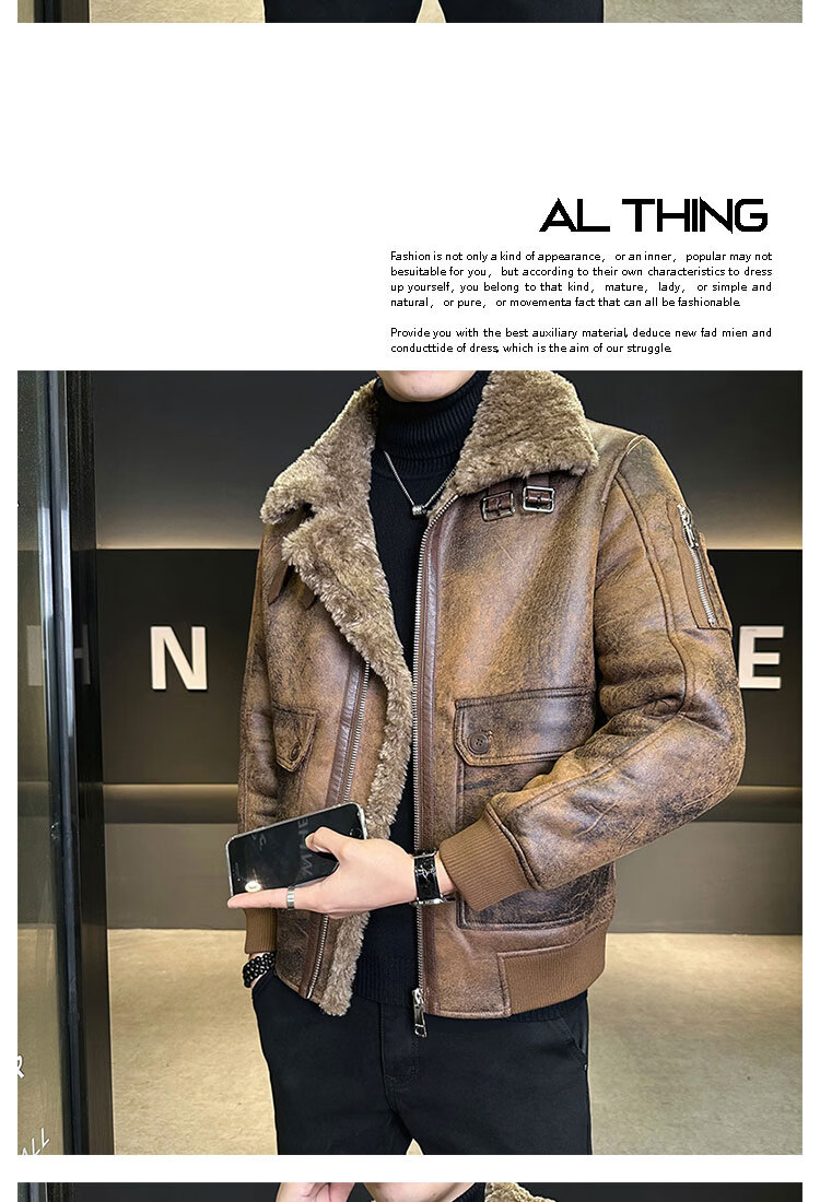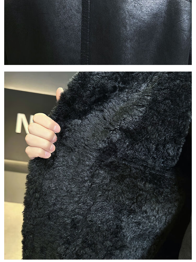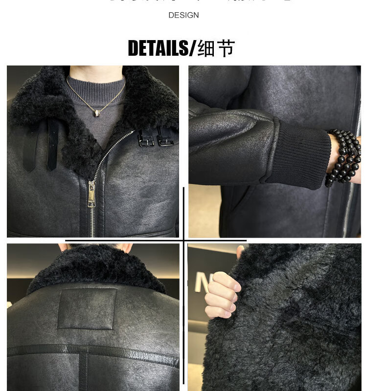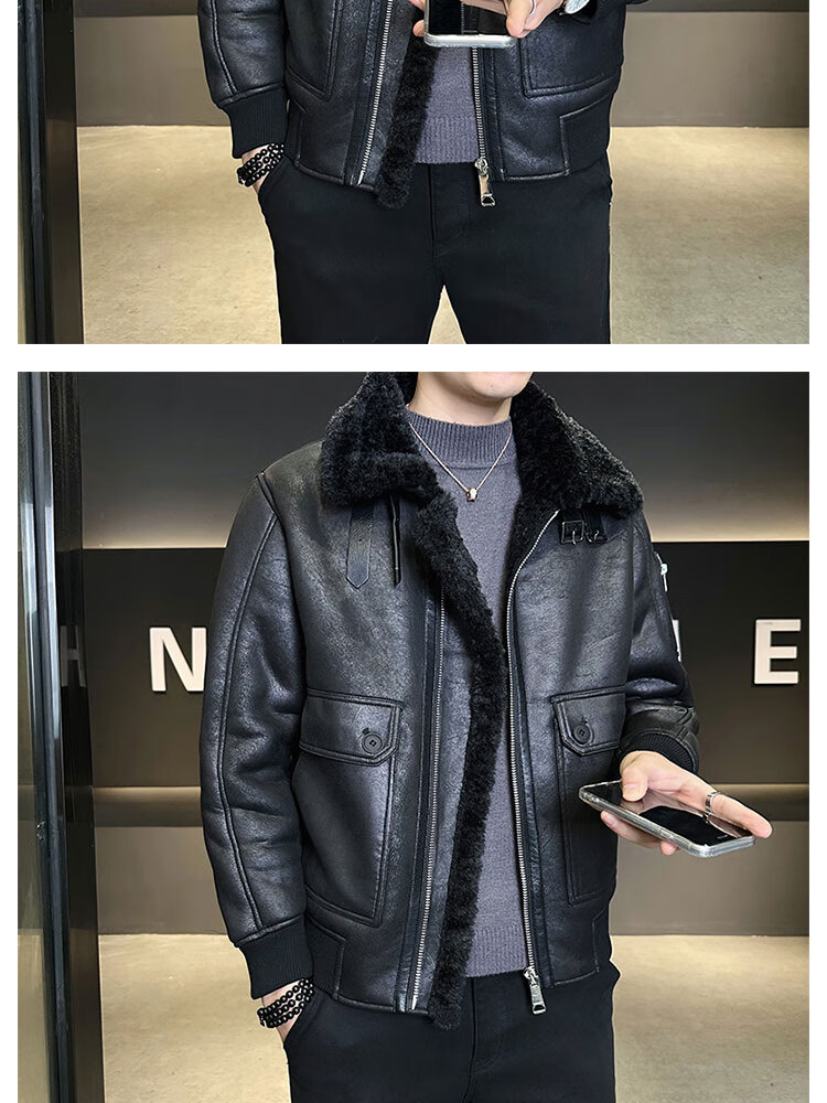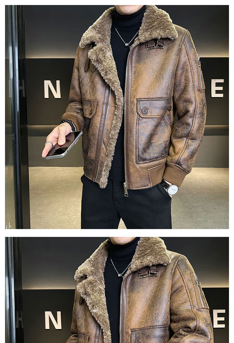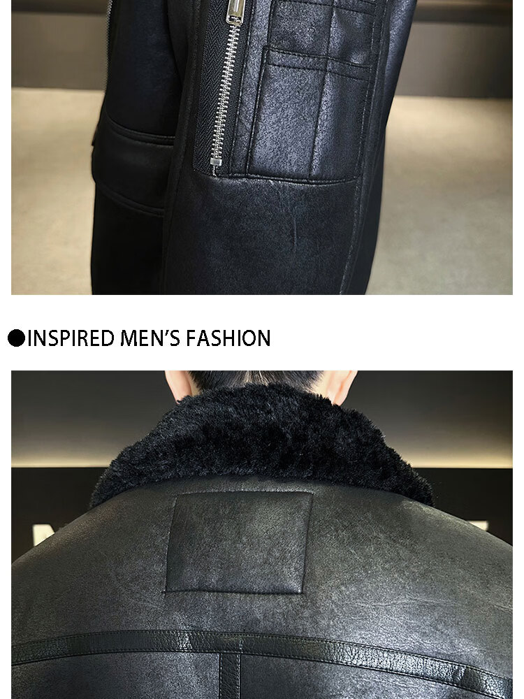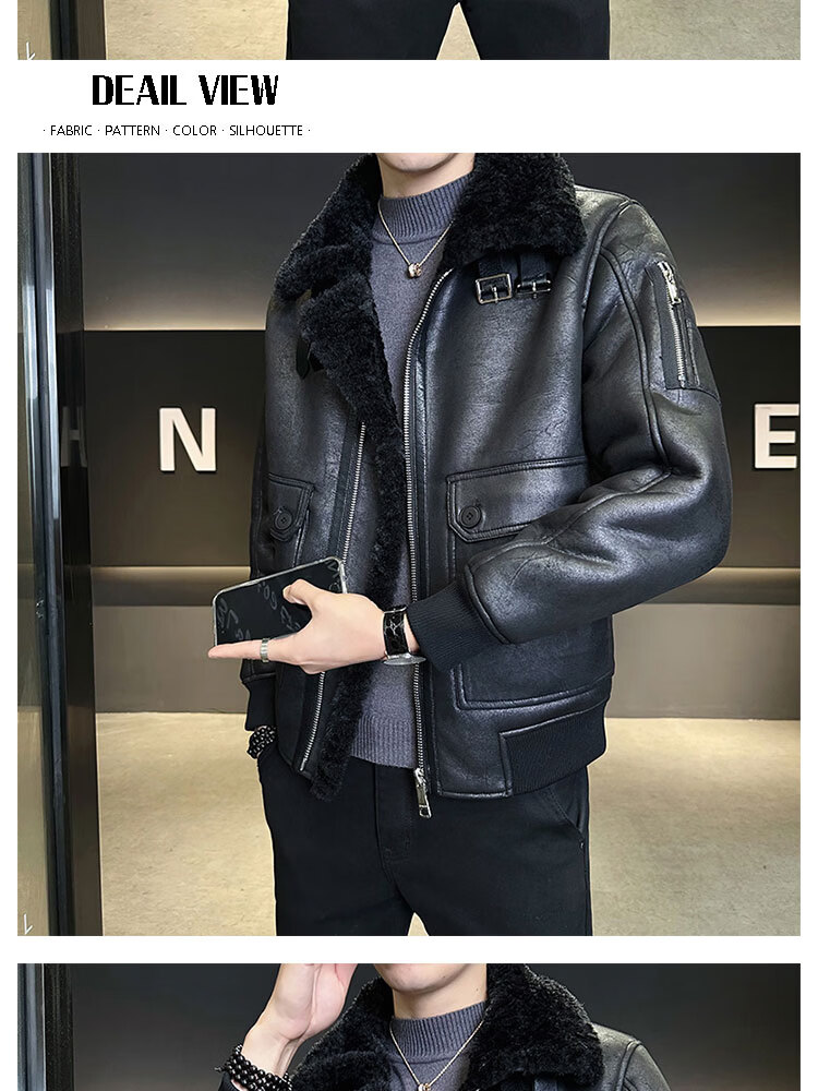 Hengyuanxiang new winter PU fur one-piece jacket men's trendy brand loose casual plus velvet thickened short motorcycle leather jacket black L
