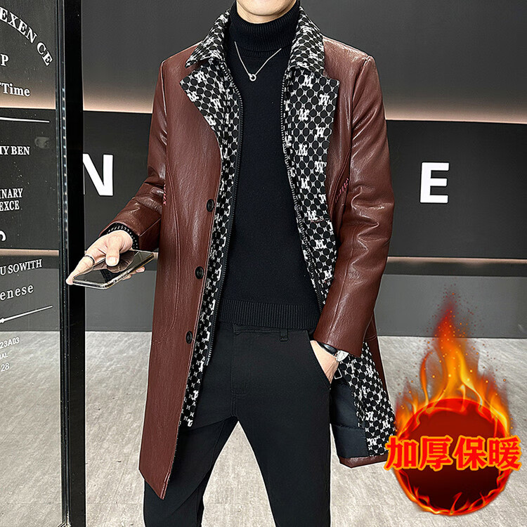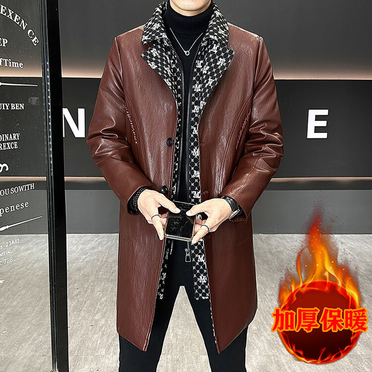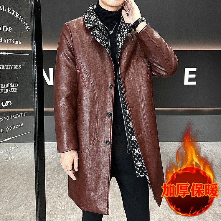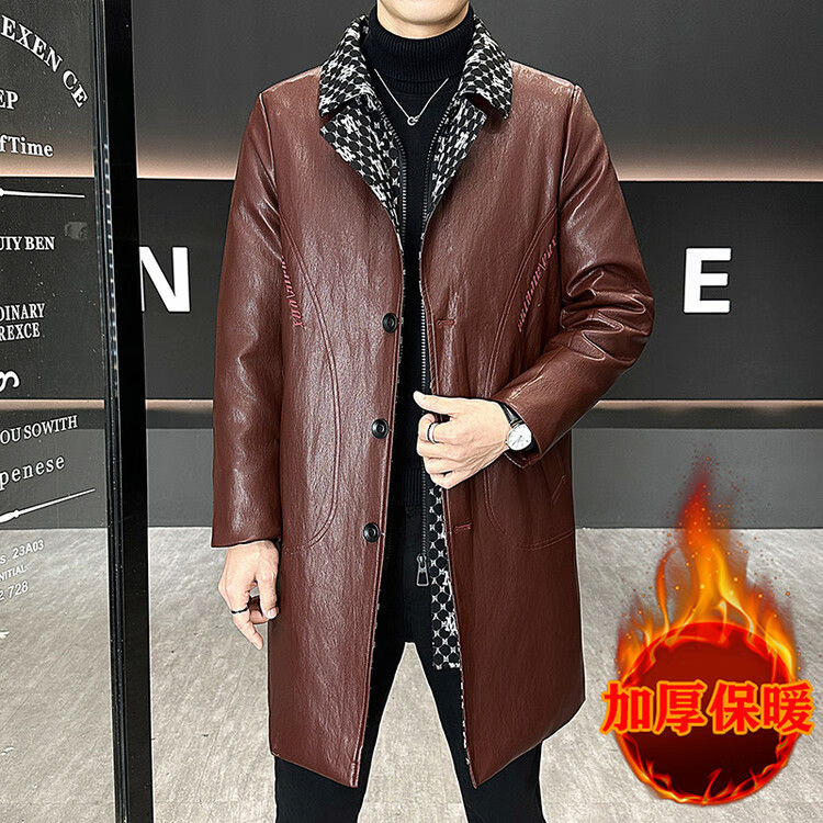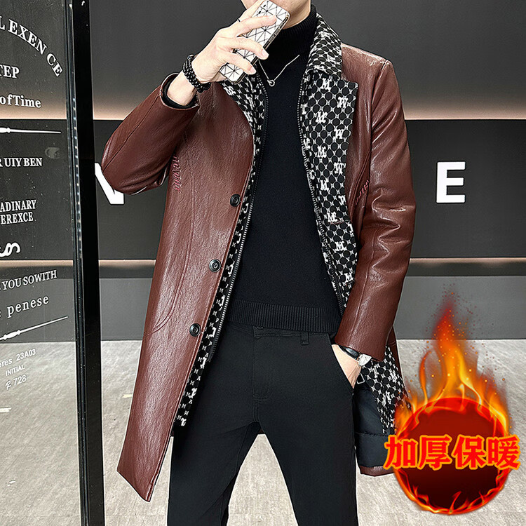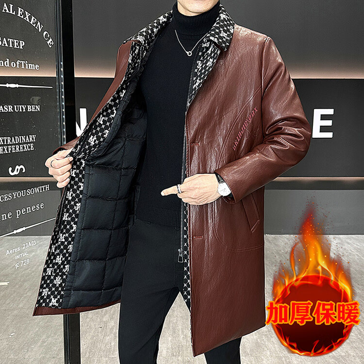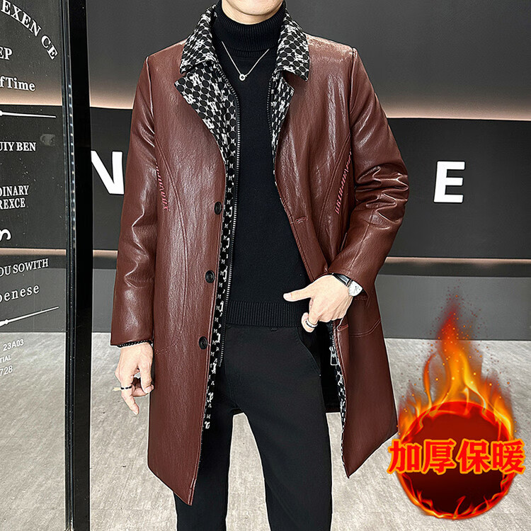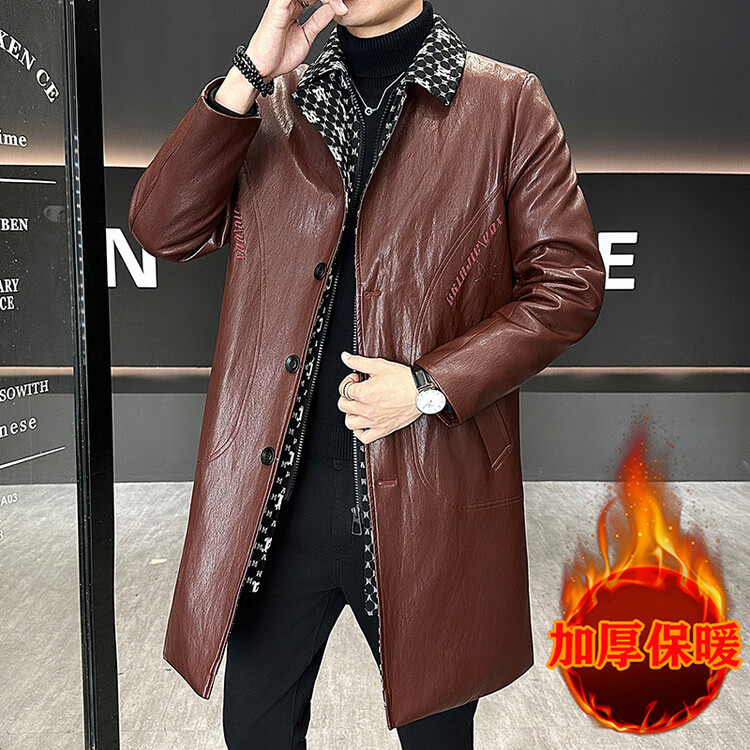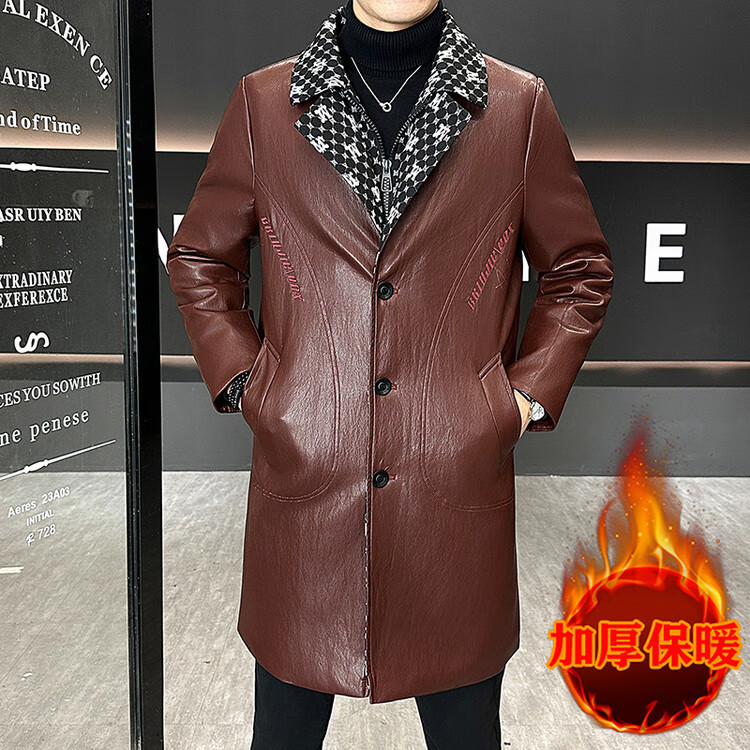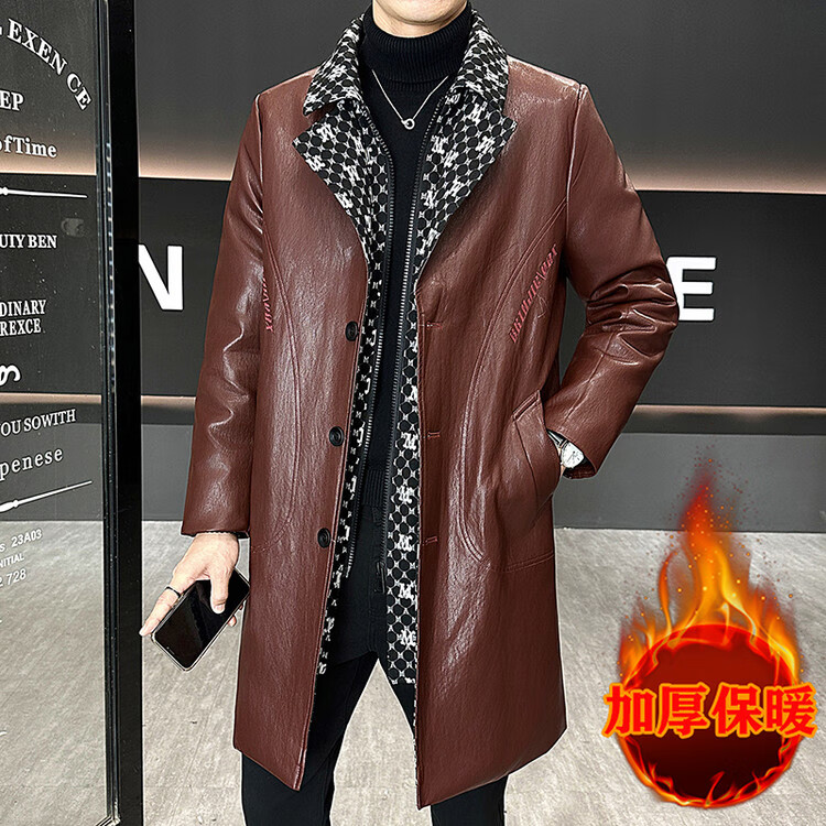 Hengyuanxiang cotton thickened slim lapel mid-length windbreaker men's winter handsome and trendy handsome leather jacket trendy maroon L