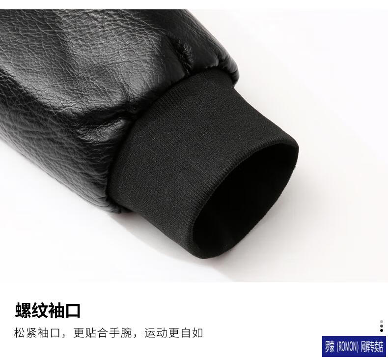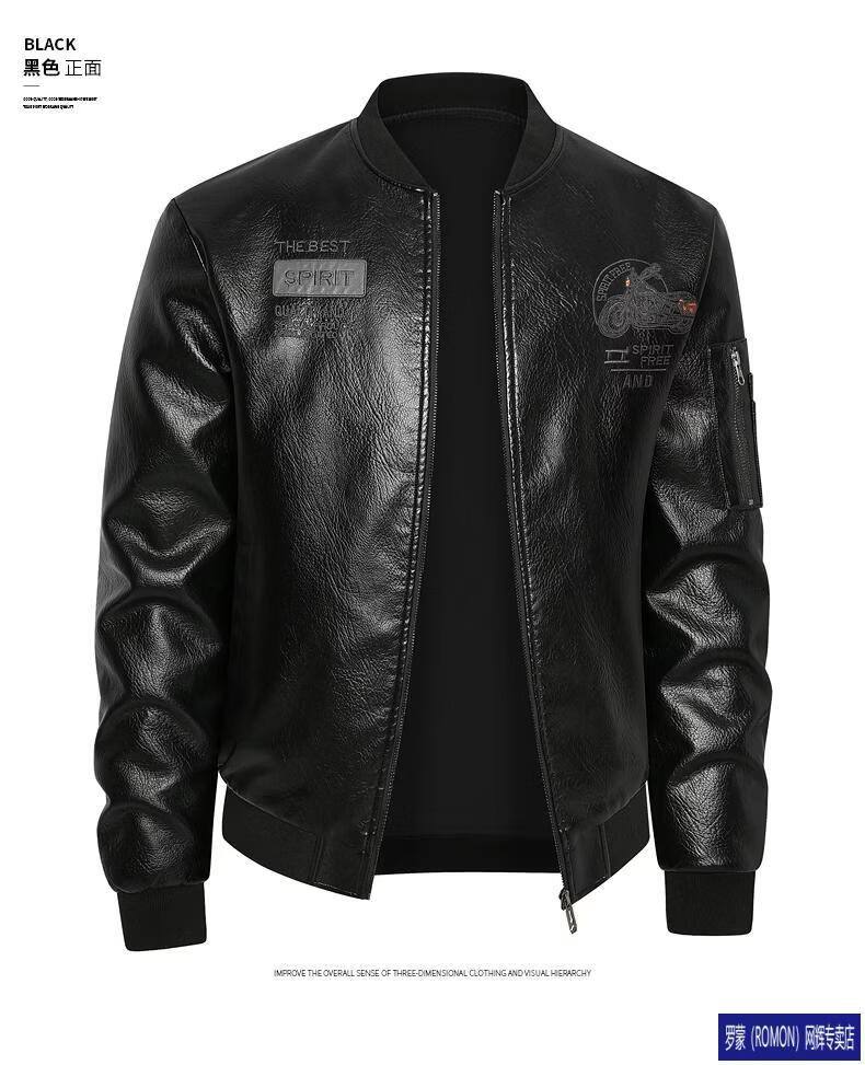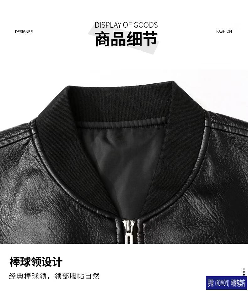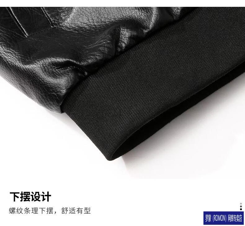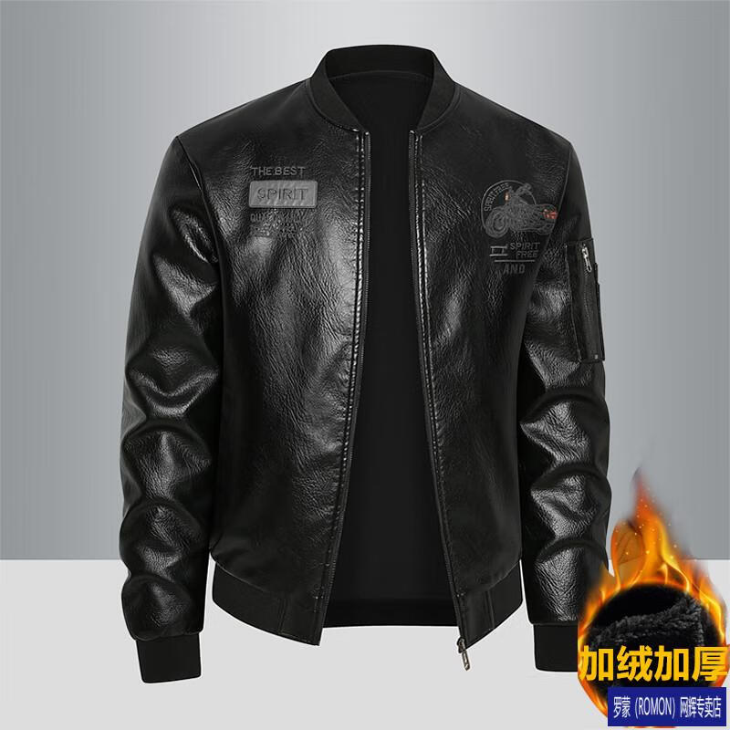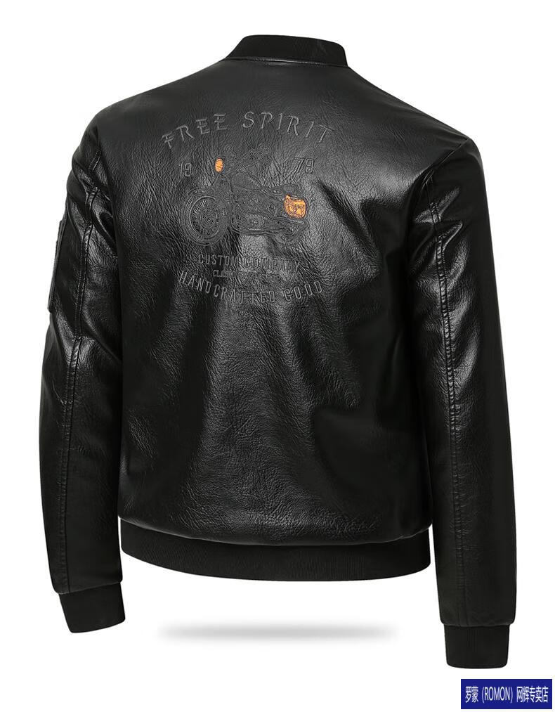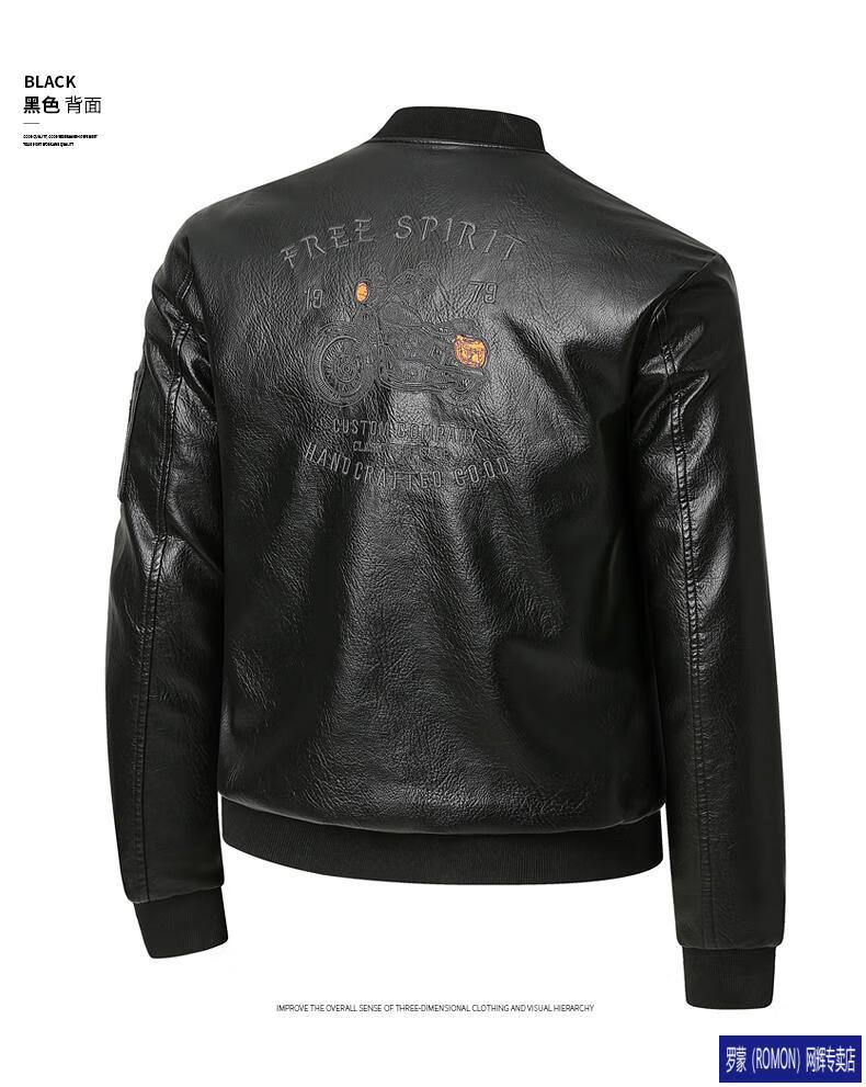 ROMON Leather Jacket Men's Baseball Collar Plus Velvet Thickening Loose Casual Trendy Handsome Leather Jacket Embroidered Motorcycle Jacket Black No Velvet 812X 6XL