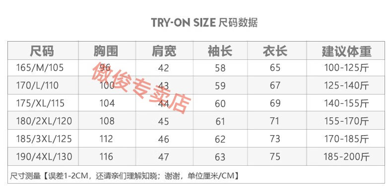 China (cm) 165 / 88-90 170 / 96-98 175 / 108-110 180 / 118-122 185 / 126-130