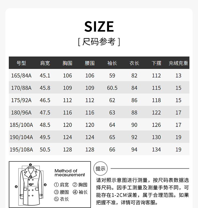 China (cm) 165 / 88-90 170 / 96-98 175 / 108-110 180 / 118-122 185 / 126-130