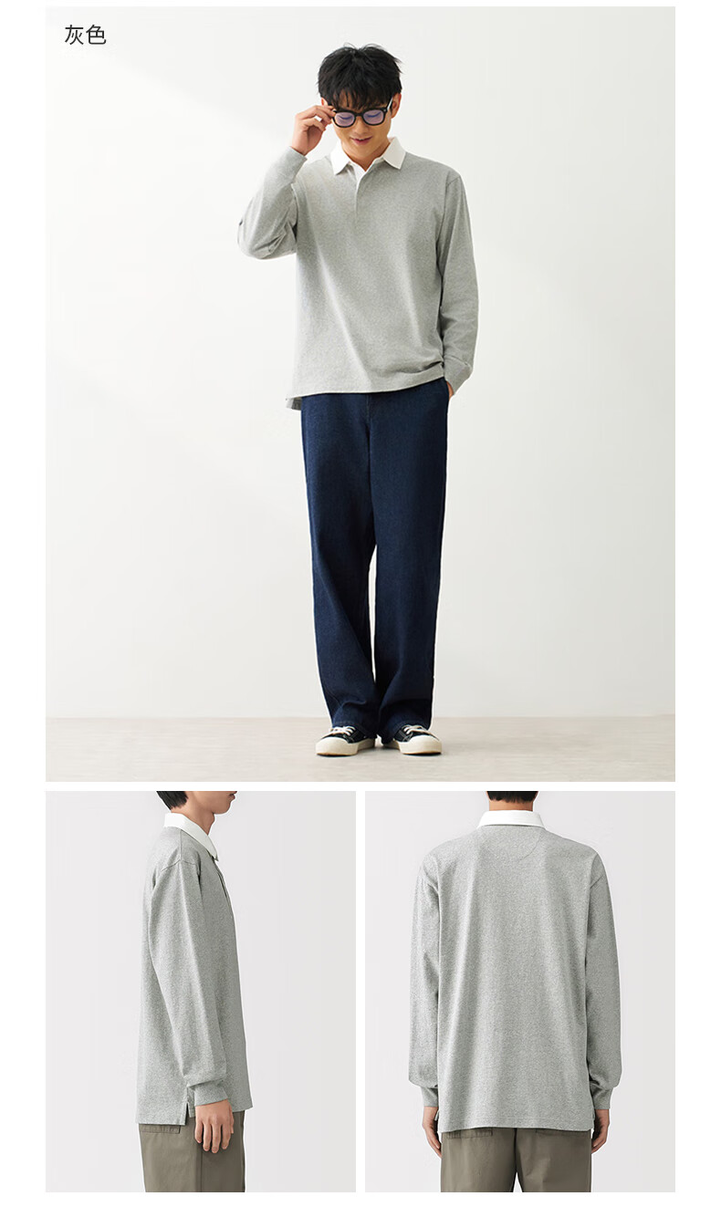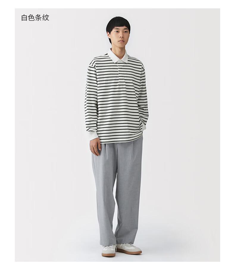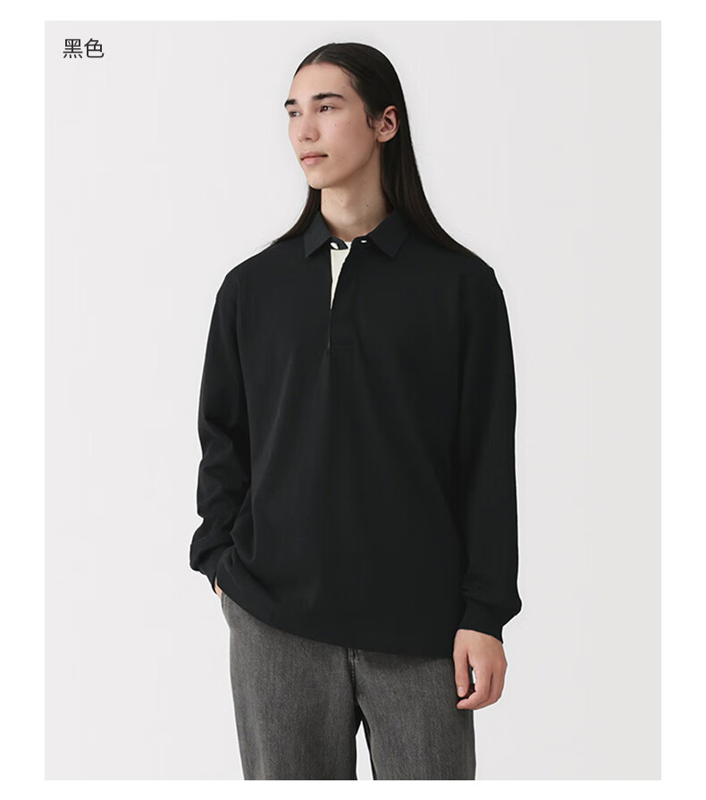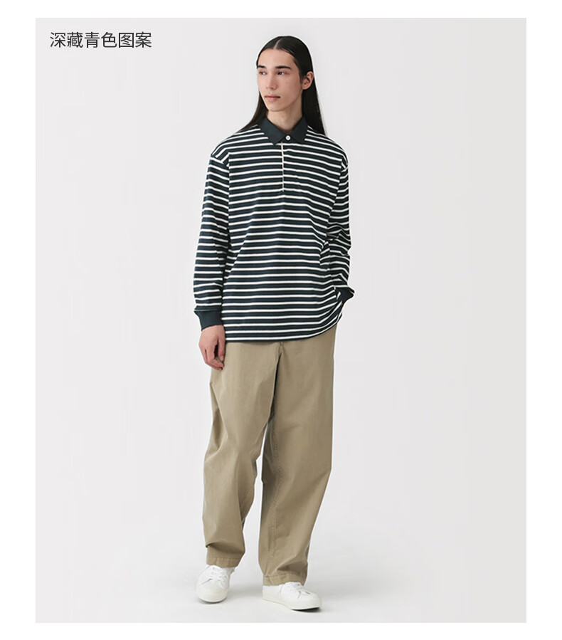 MUJI Men's Washed Thick Cotton Long Sleeve POLO Shirt Men's Shirt Spring 2026 Men's AB1QHA6S Dark Navy Pattern L (175/100A)