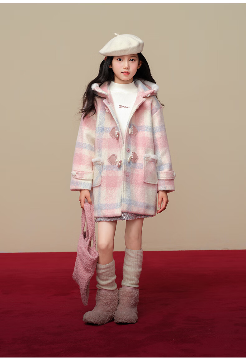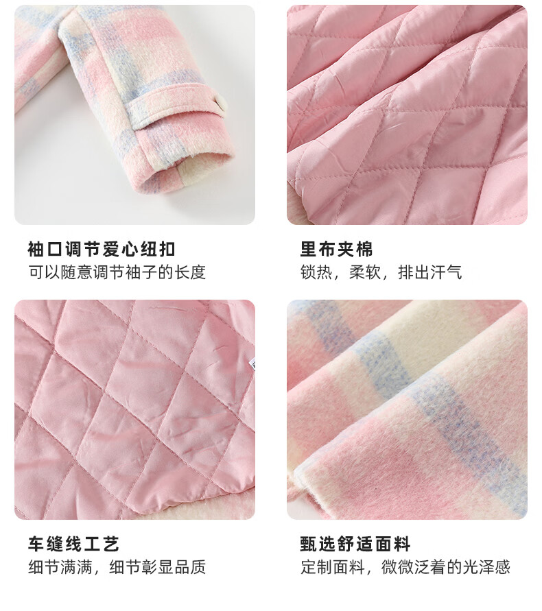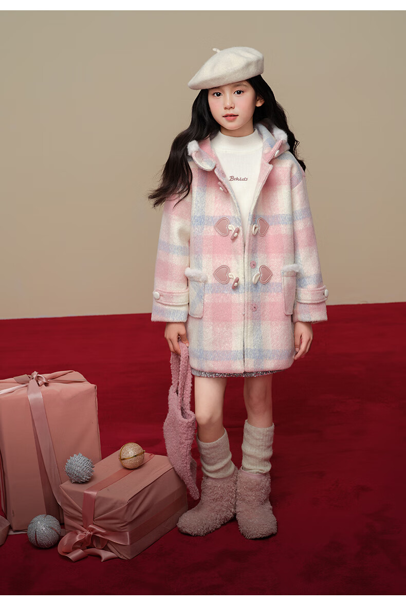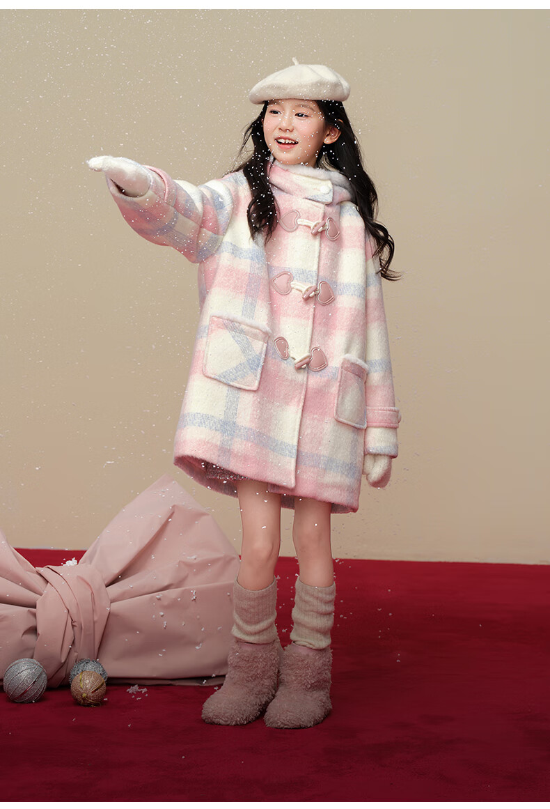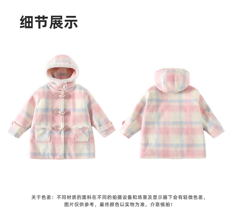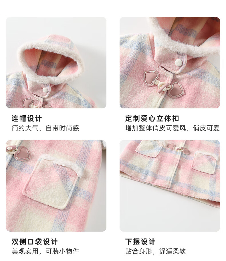 Taoding New Year plaid hooded coat for girls, autumn and winter love long-sleeved coat, girl's fashionable Christmas woolen coat, pink and white 140