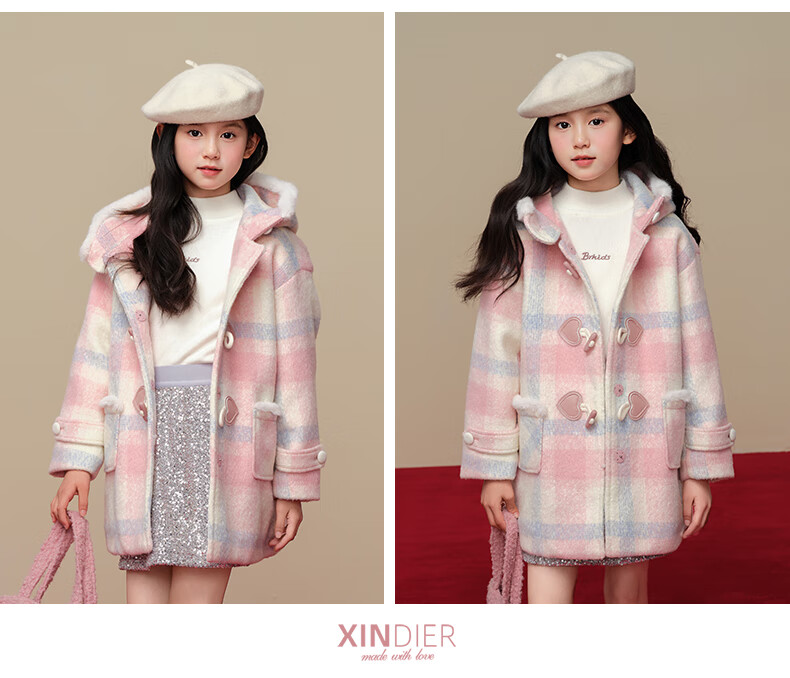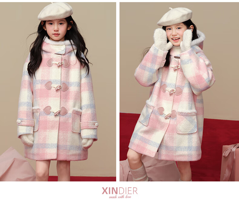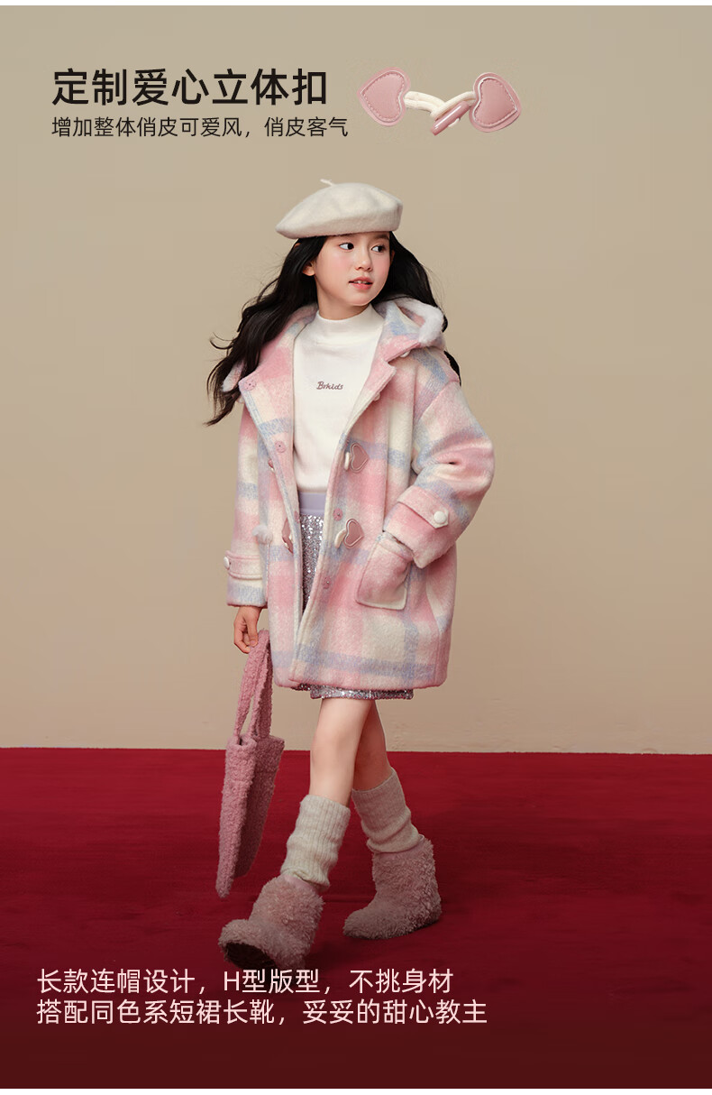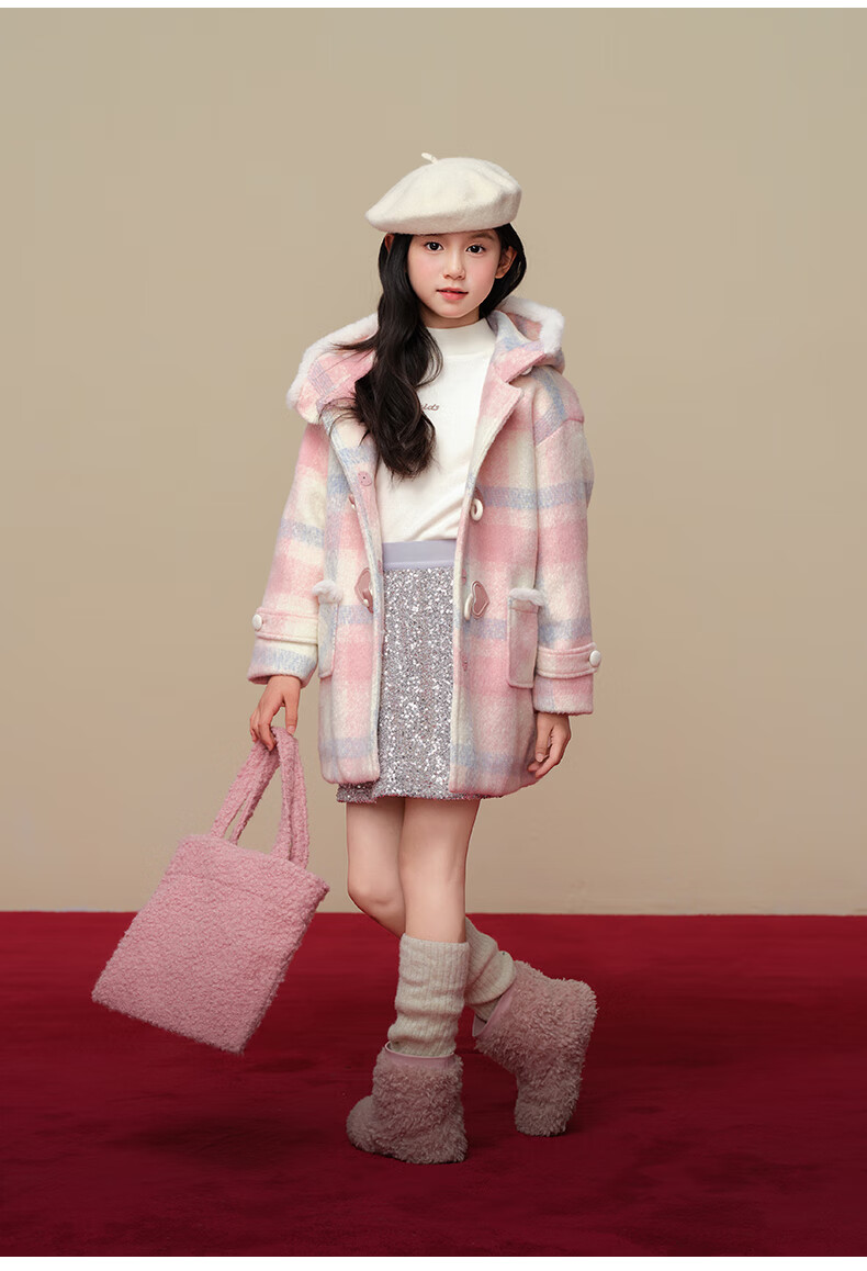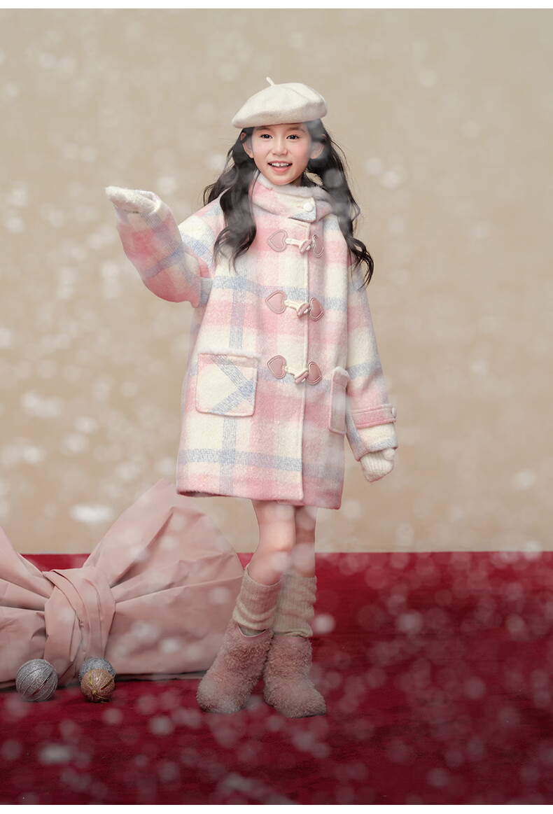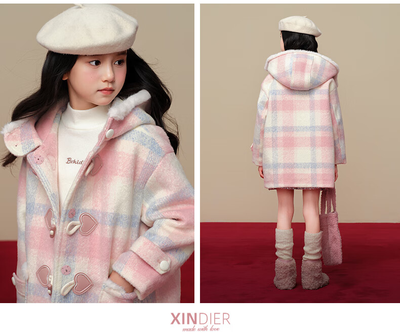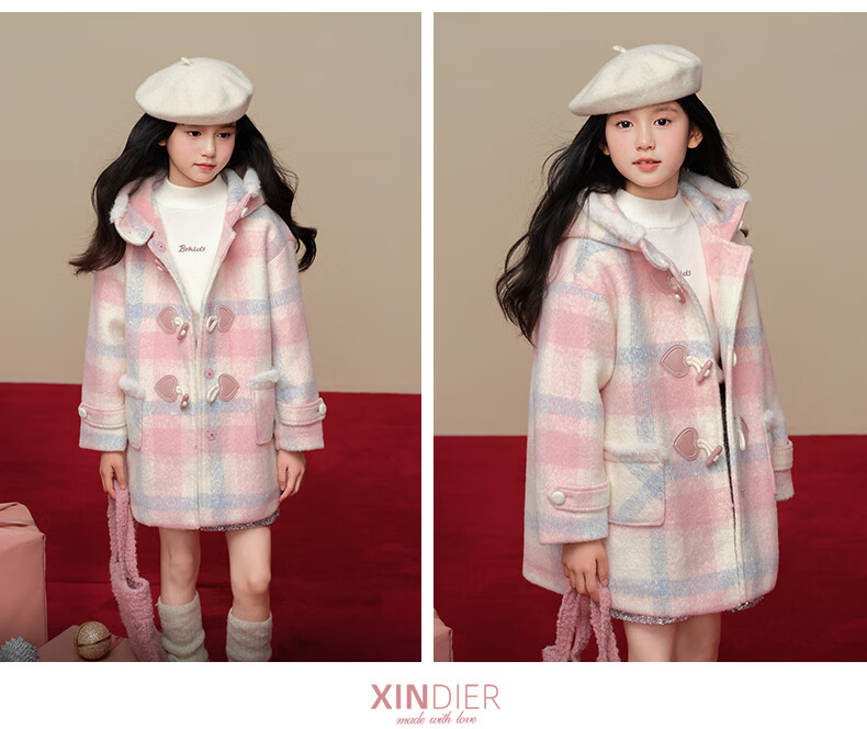 Taoding New Year plaid hooded coat for girls, autumn and winter love long-sleeved coat, girl's fashionable Christmas woolen coat, pink and white 140