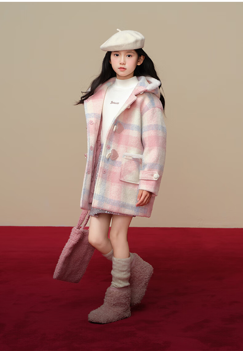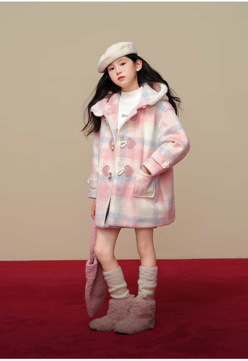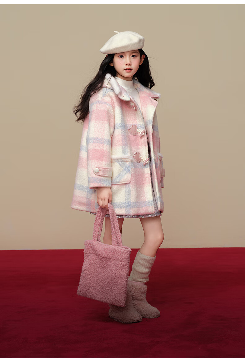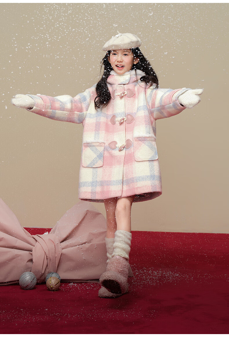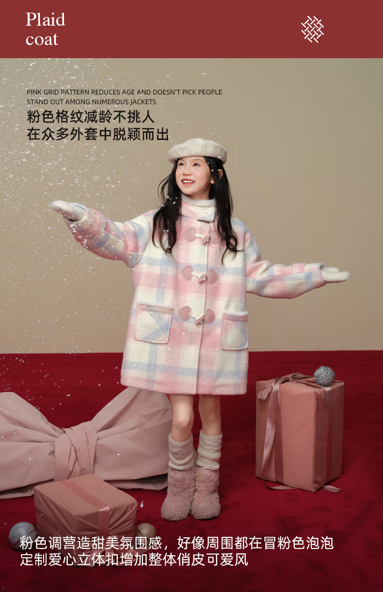Taoding New Year plaid hooded coat for girls, autumn and winter love long-sleeved coat, girl's fashionable Christmas woolen coat, pink and white 140