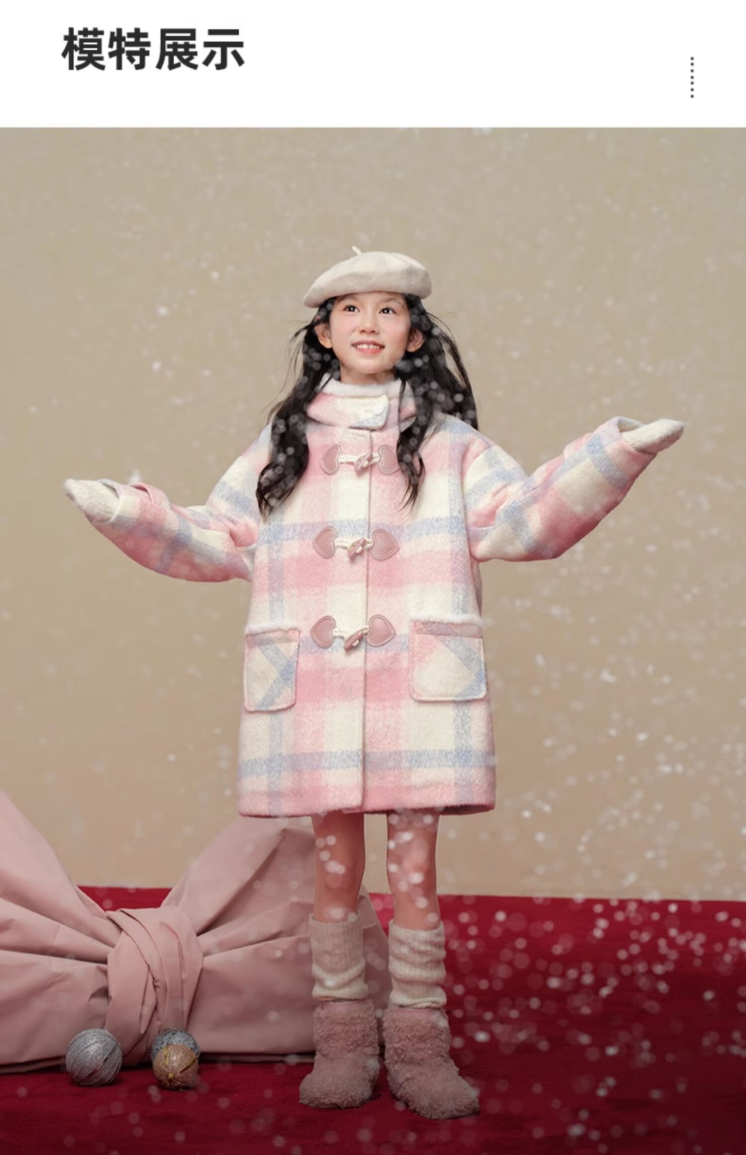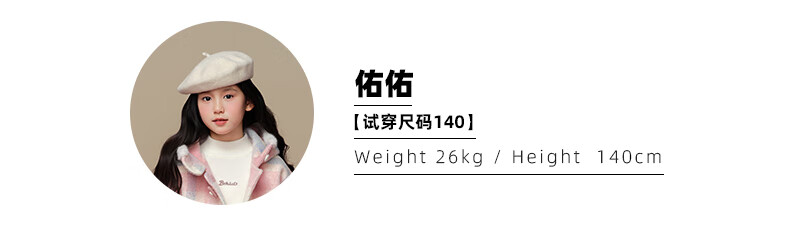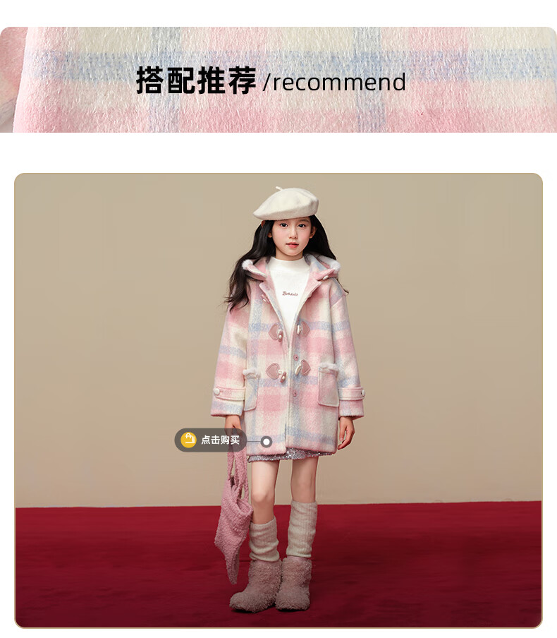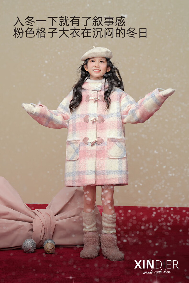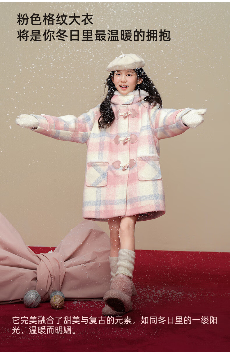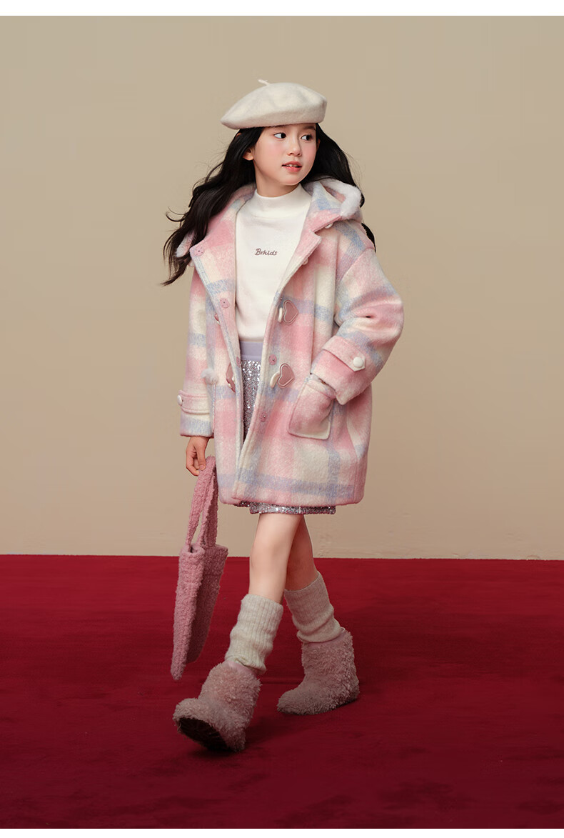 Taoding New Year plaid hooded coat for girls, autumn and winter love long-sleeved coat, girl's fashionable Christmas woolen coat, pink and white 140
