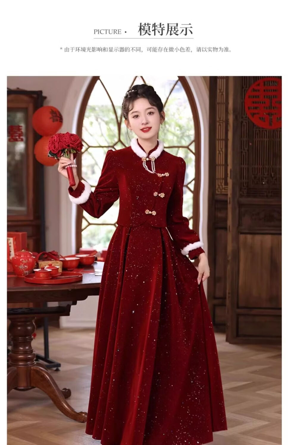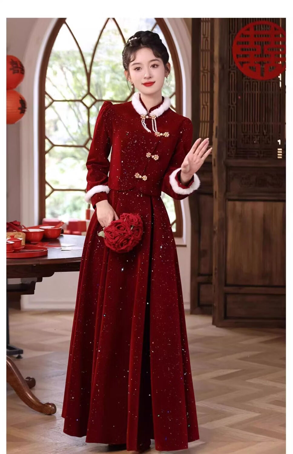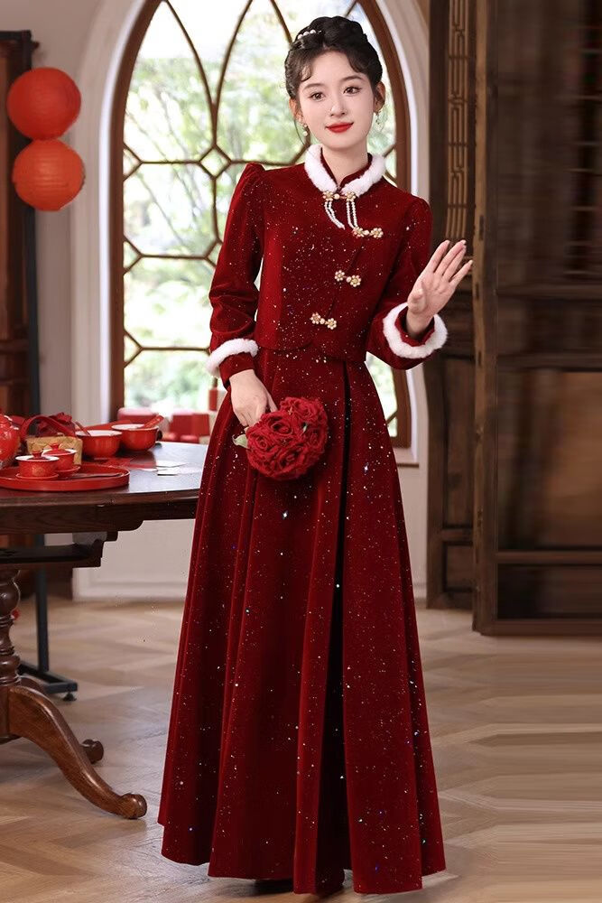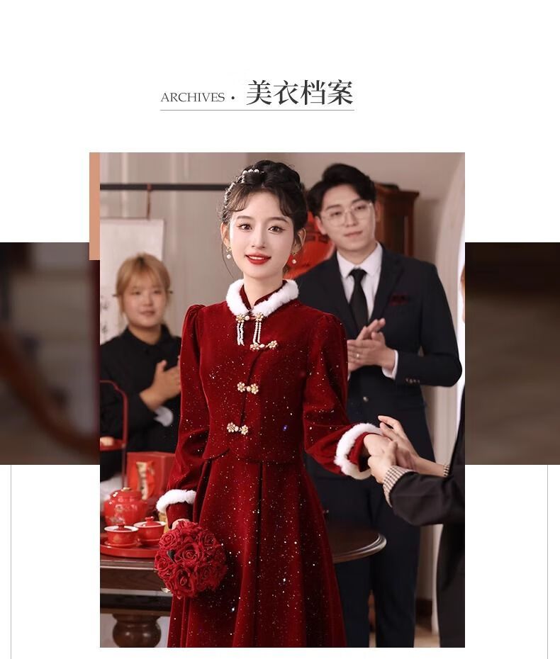 Pierre Cardin New Chinese Toast Wear 2025 New Bride Autumn and Winter Wedding Red Engagement Dress Skirt Women's Winter Velvet Cheongsam Burgundy Winter Style L Recommended 105-115 Jin Jin equals 0.5 kg