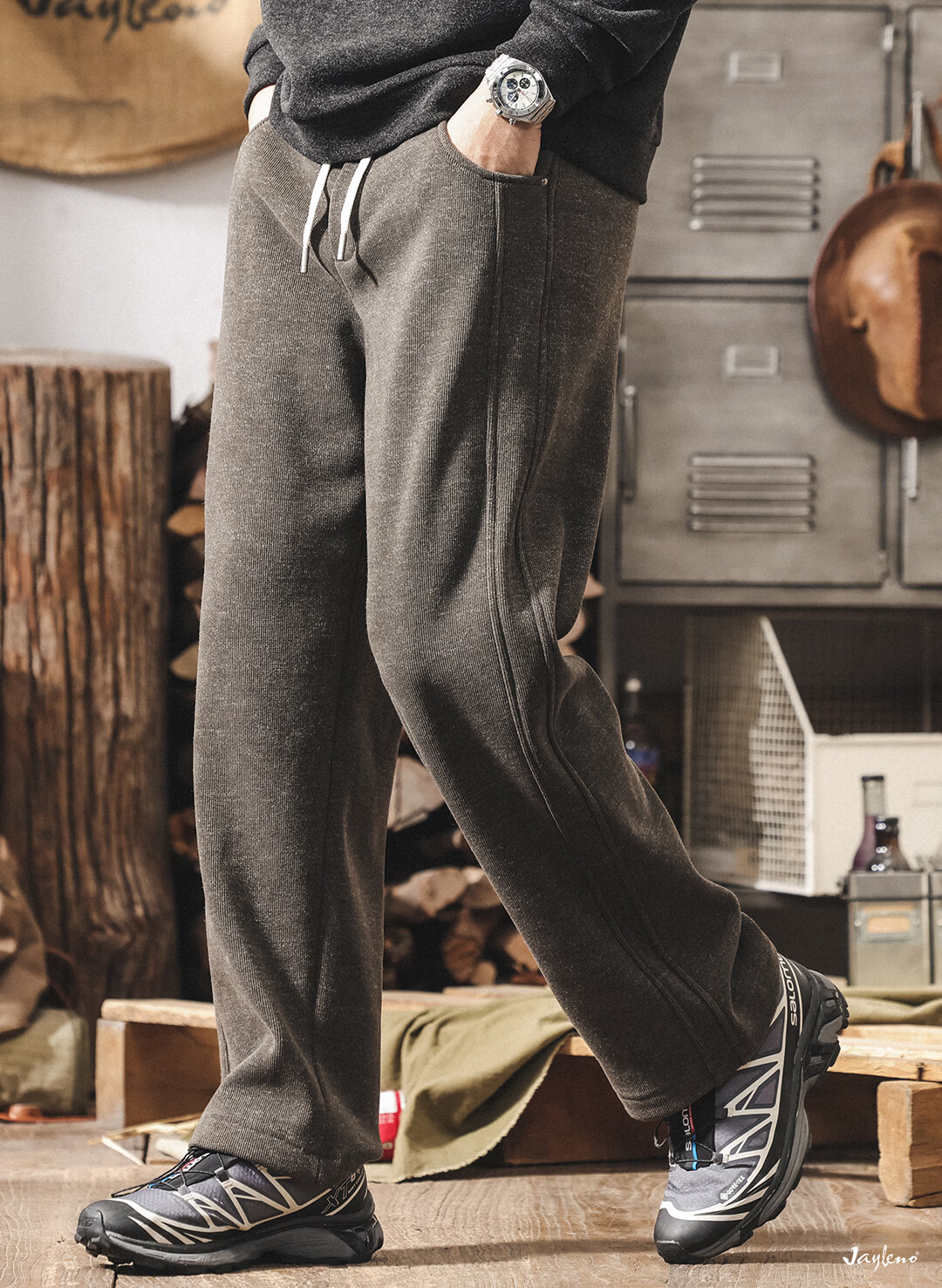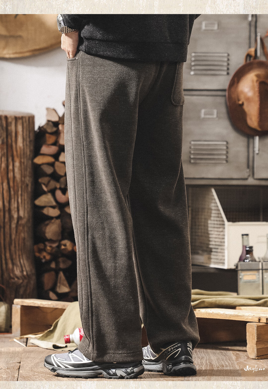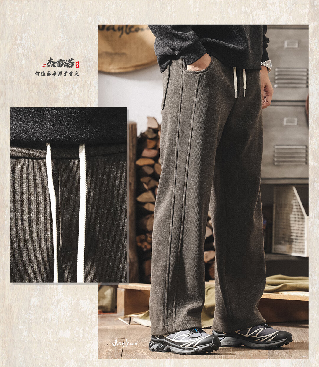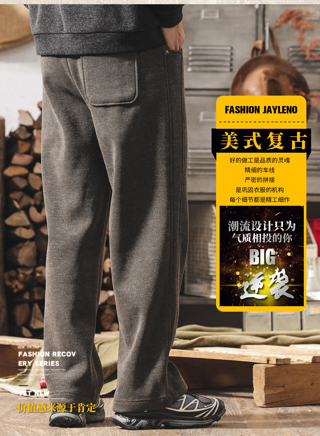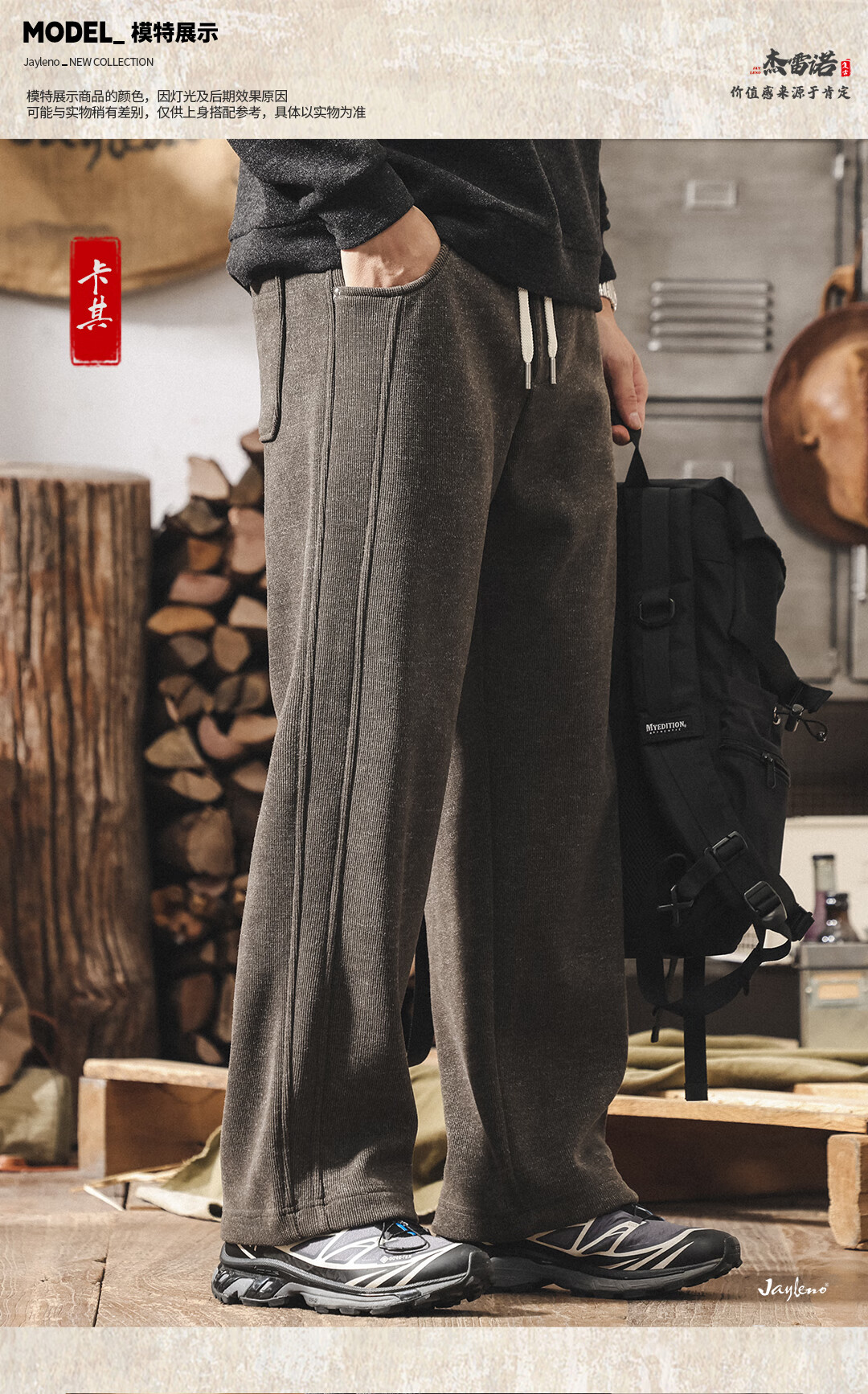 Jay Leno American retro heavyweight European cotton velvet knitted sweatpants men's plus velvet winter loose thickened warm straight casual pants for men khaki plus velvet 28 suitable for 95-110Jin Jin equals 0.5 kg