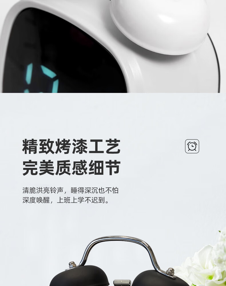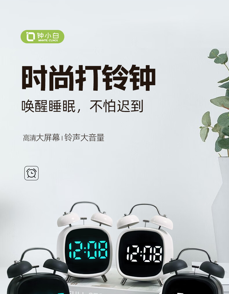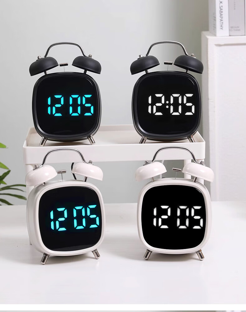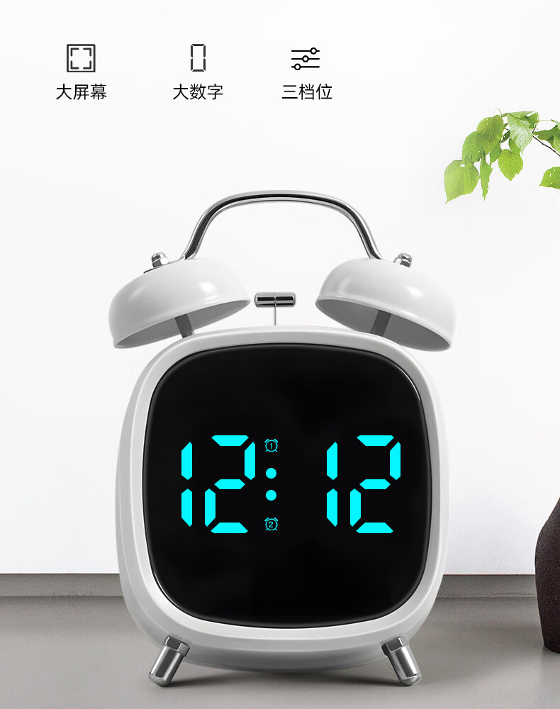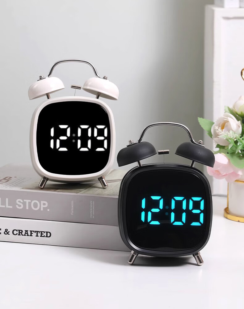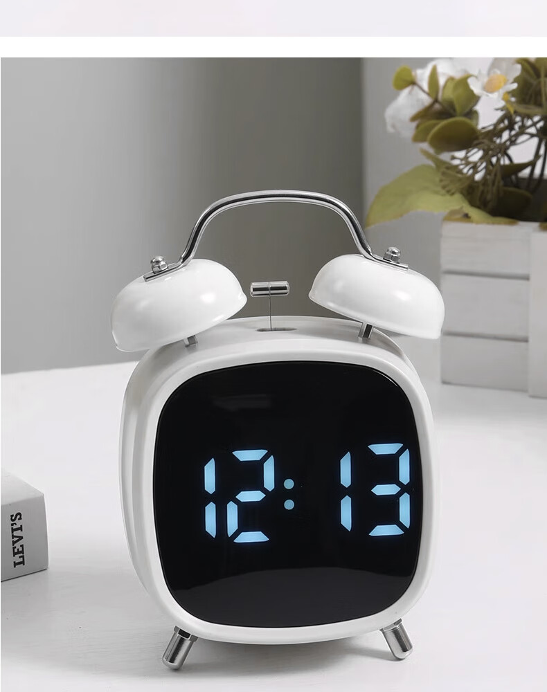 Timess alarm clock powerfully wakes up students, special wake-up artifact, LED electronic display, mechanical bell, super loud sound alarm clock, pearl white-white letters, voice-activated wake-up + 3 levels of brightness