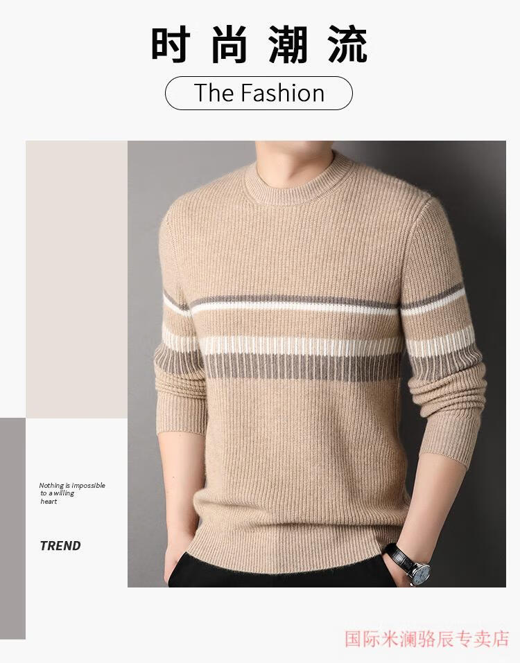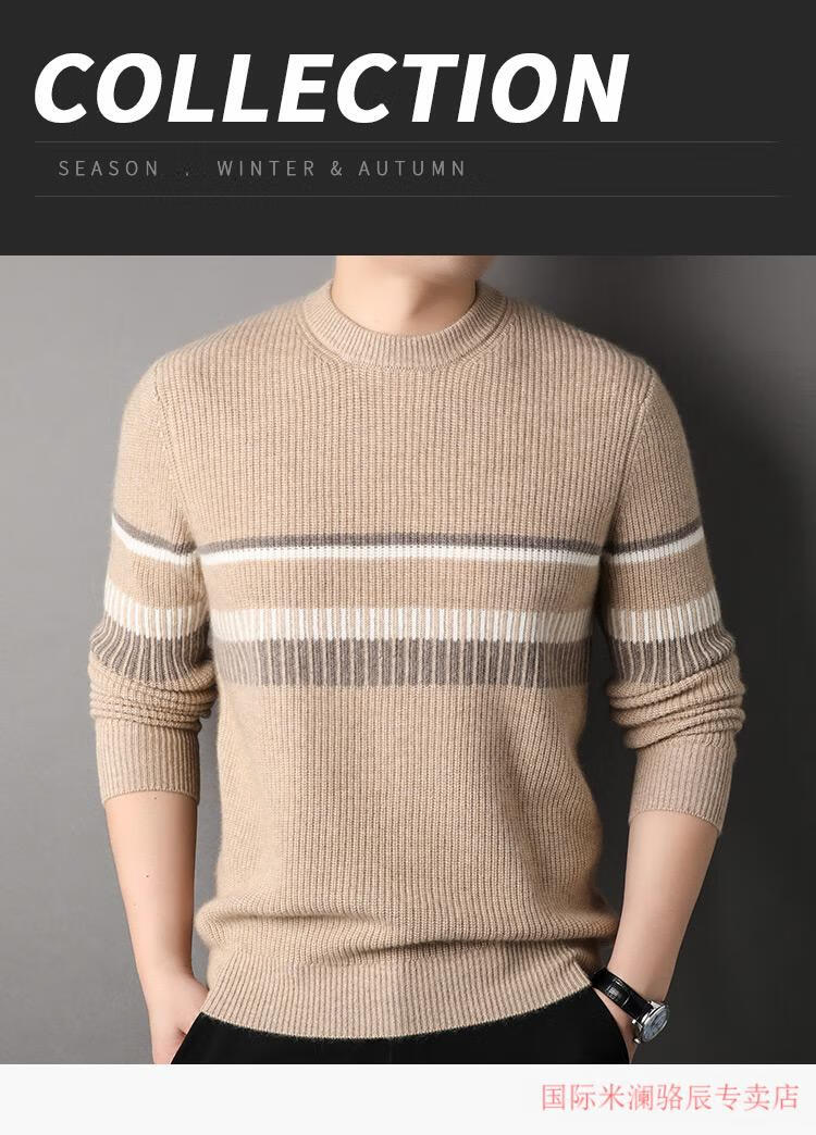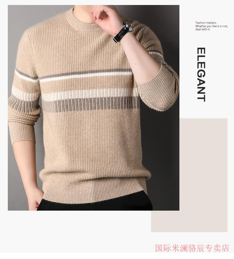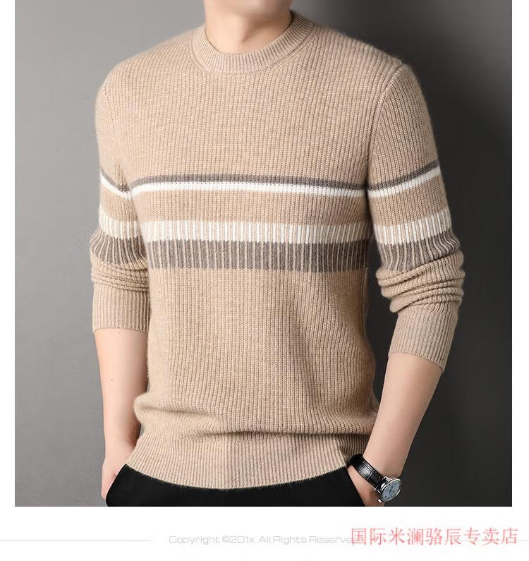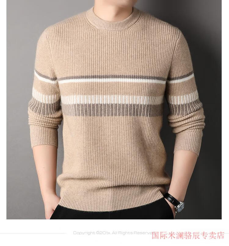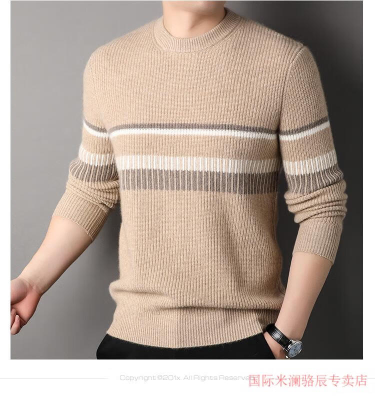 International Milan Ordos city-produced 100% pure cashmere men's round-neck striped sweater winter young and middle-aged sheep. Sweater light khaki Ordos/no pilling/super grade/cashmere XL 175 (recommended weight 140-160Jin Jin equals 0.5 kg)