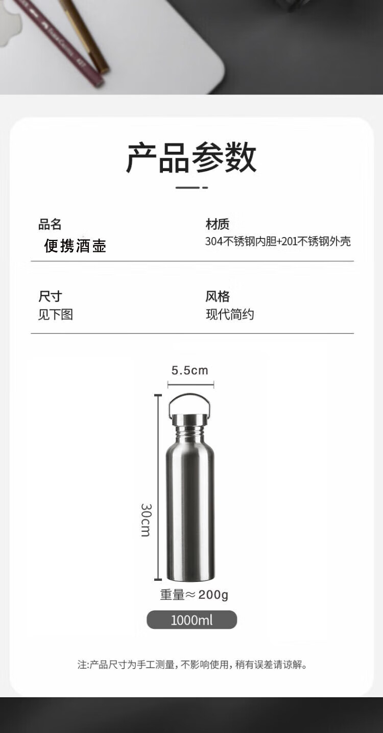 Jingxianju Wine Bottle Stainless Steel Liquor Carry Portable Large Capacity Bulk High-end Empty Wine Bottle 2Jin Jin is equal to 0.5kg 304 Stainless Steel Portable Wine Bottle 1000ml
