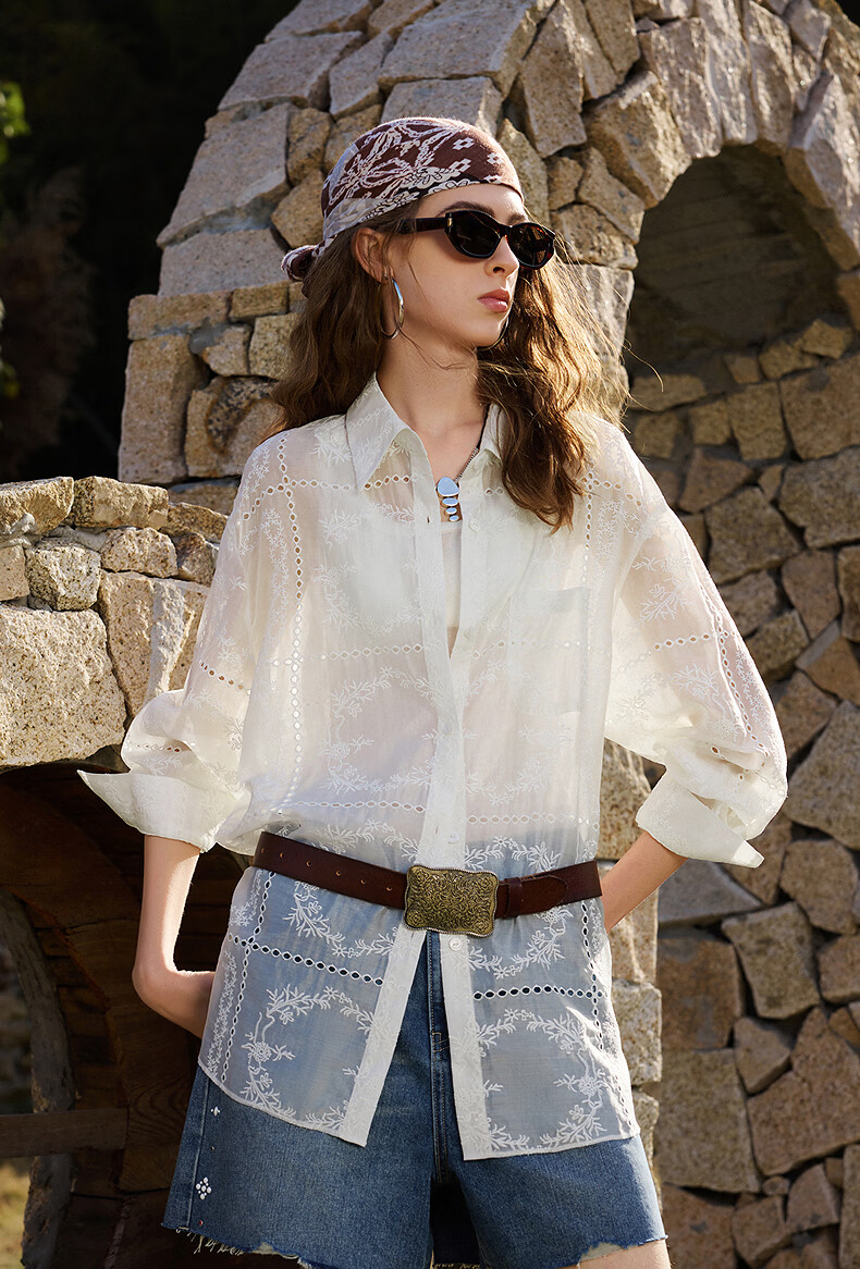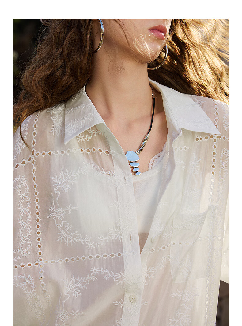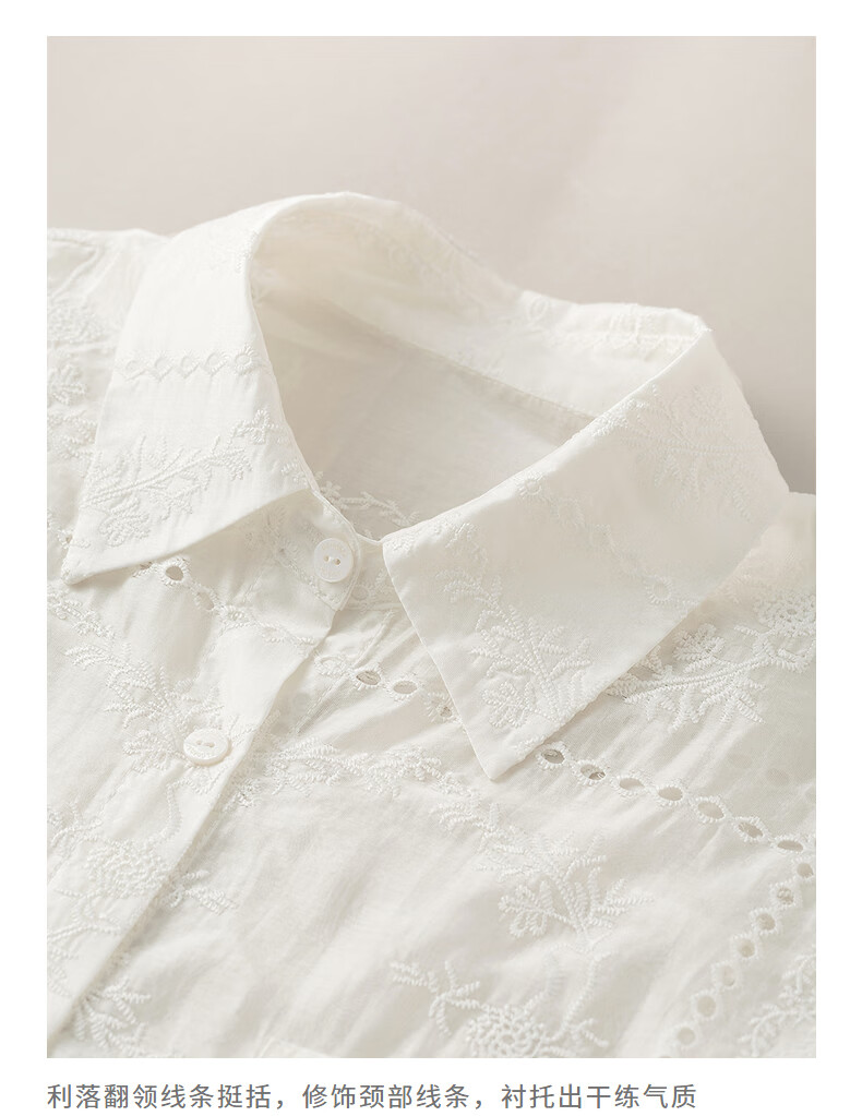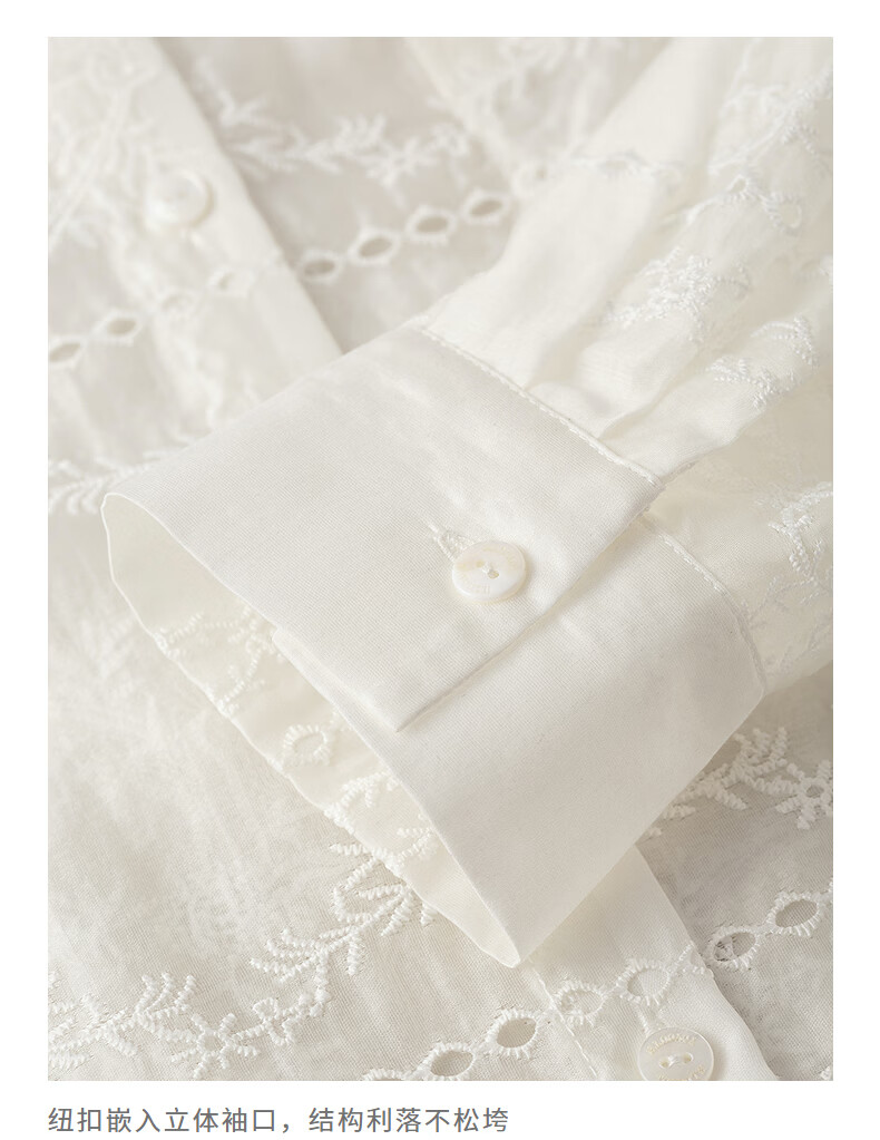 Chuyu Lyocell heavy industry embroidered white shirt for women 2026 spring new loose mid-length hollow cardigan top off-white S